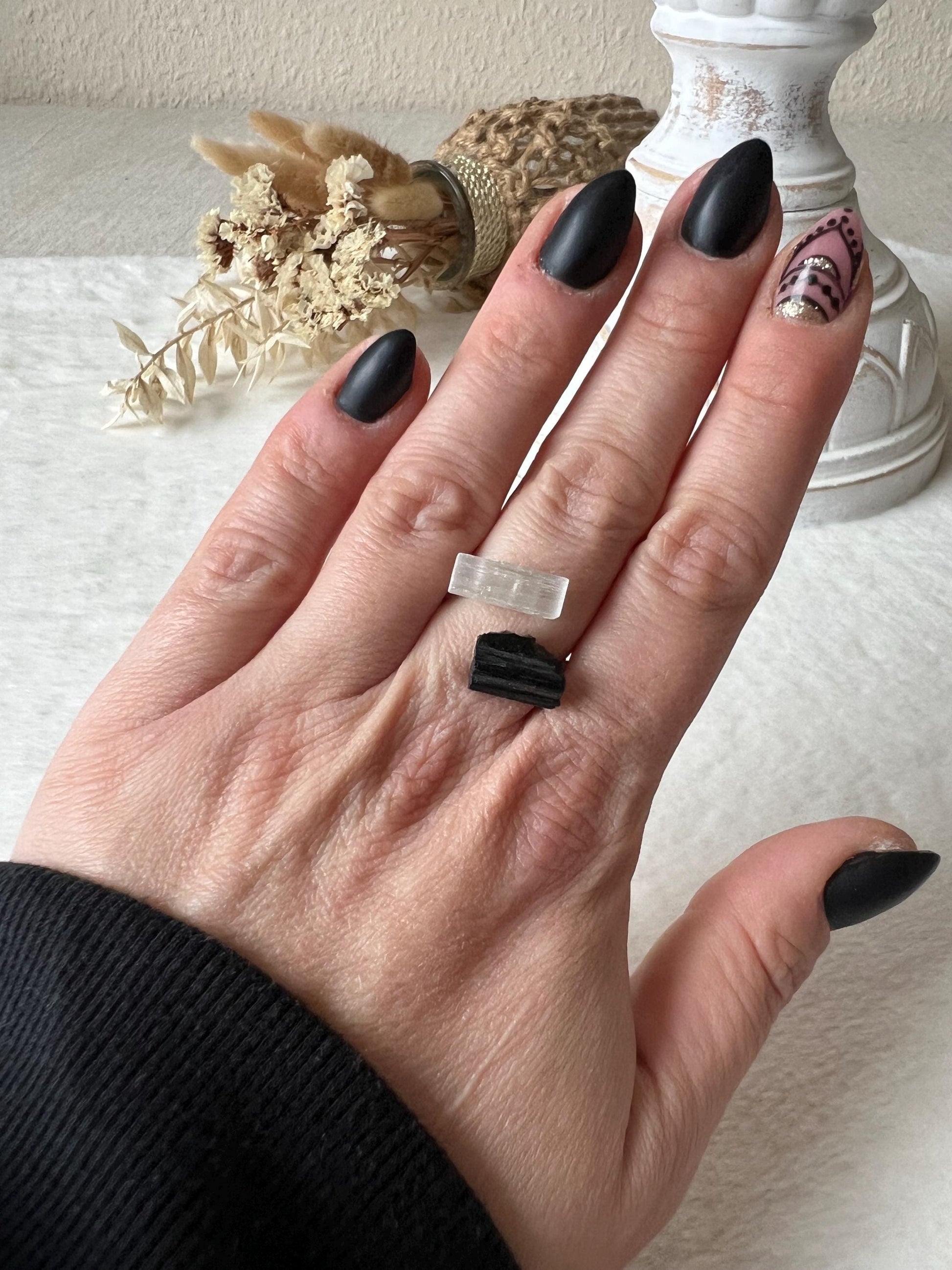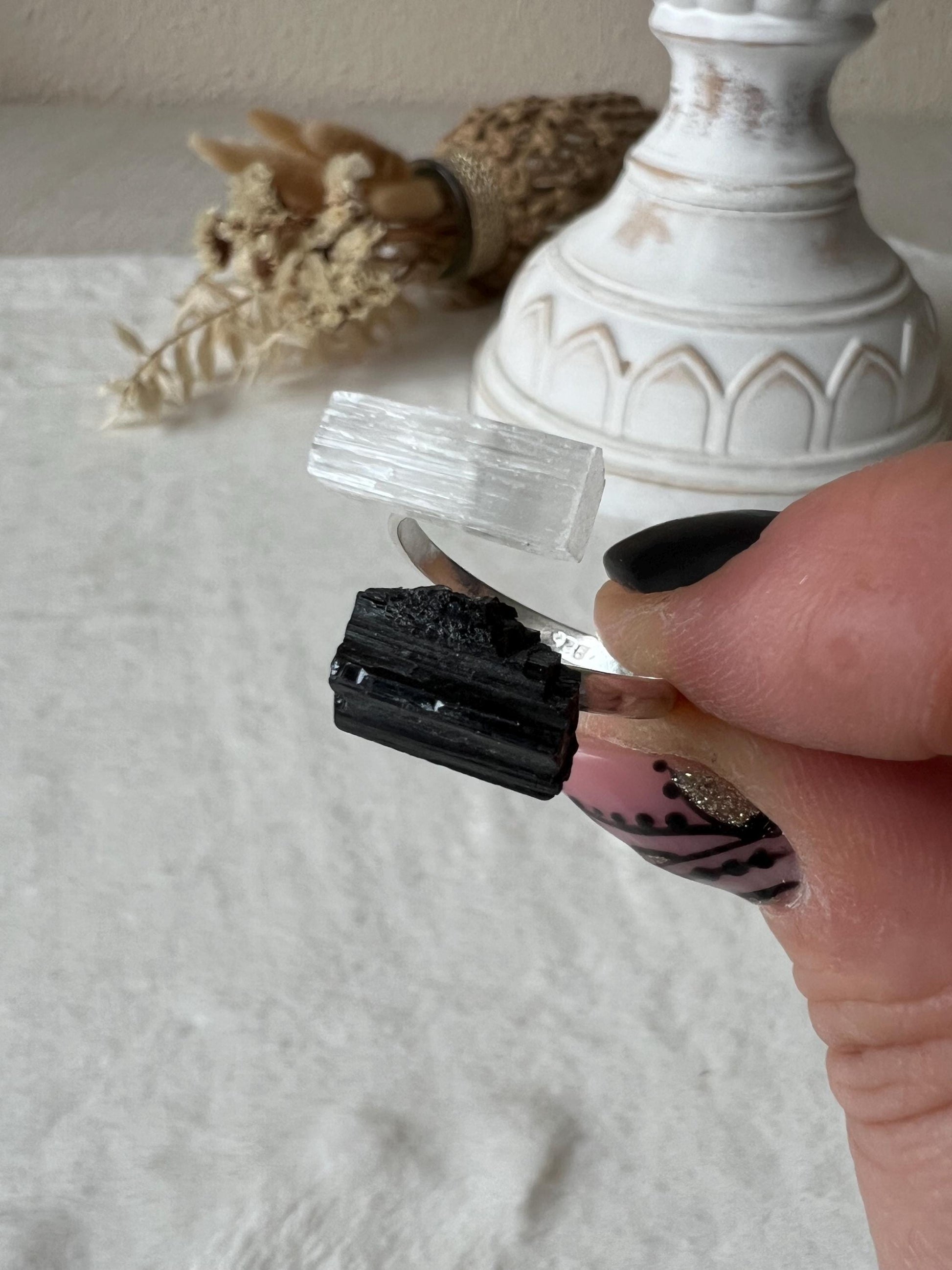 Dieser besondere, größenverstellbare 925er Silberring vereint die schützende Kraft des schwarzen Turmalins mit der reinigenden Energie des Selenits. Der Ring ist mit einem naturbelassenen schwarzen Turmalin und einem zarten Selenit-Rohstein besetzt. Die Kombination aus dem dunklen, kraftvollen Turmalin und dem lichtdurchlässigen, milchweißen Selenit schafft einen faszinierenden Kontrast, der sowohl optisch als auch energetisch harmoniert. Dank des offenen Designs lässt sich der Ring flexibel an verschiedene Größen anpassen und ist so vielseitig tragbar.