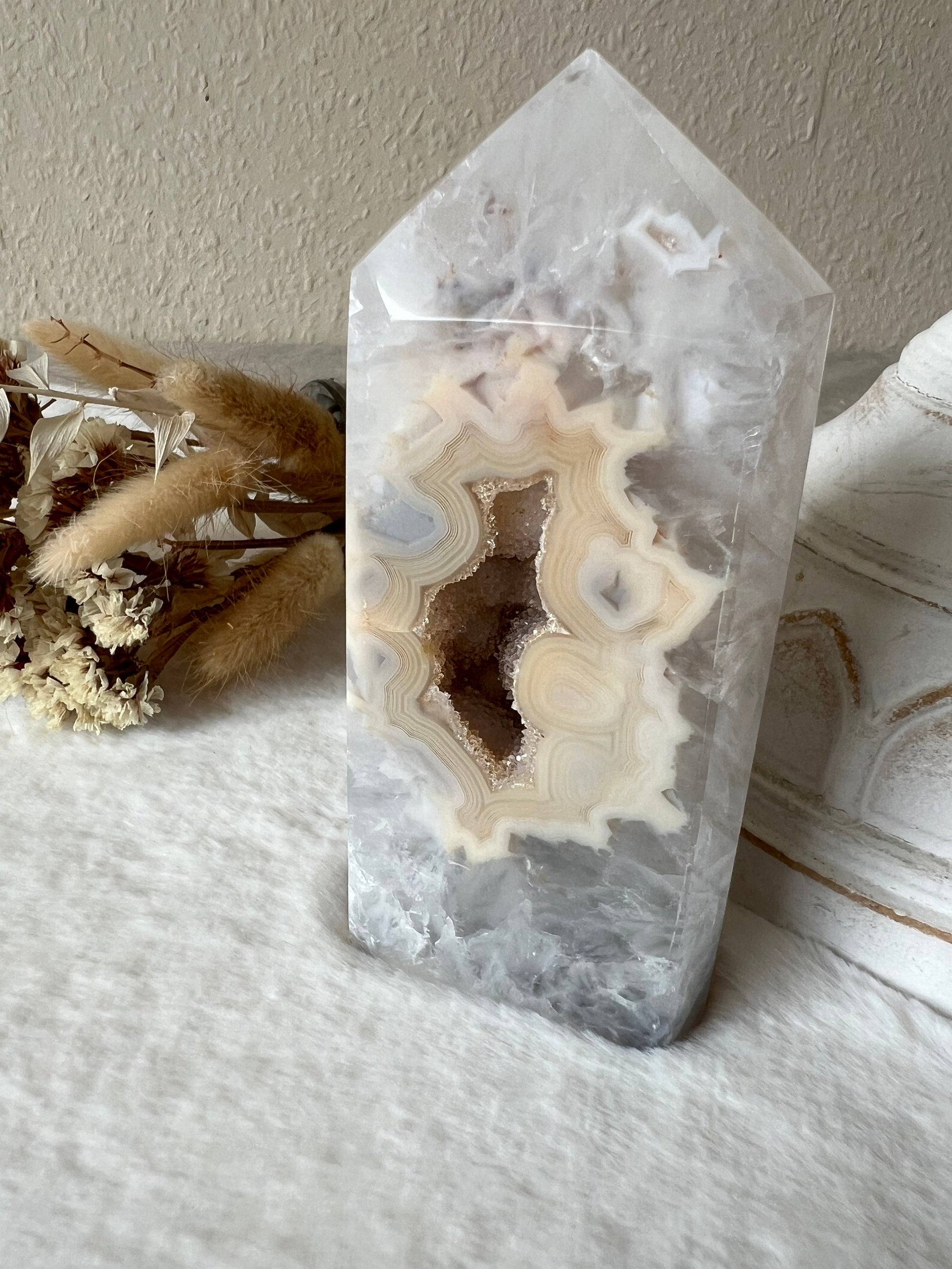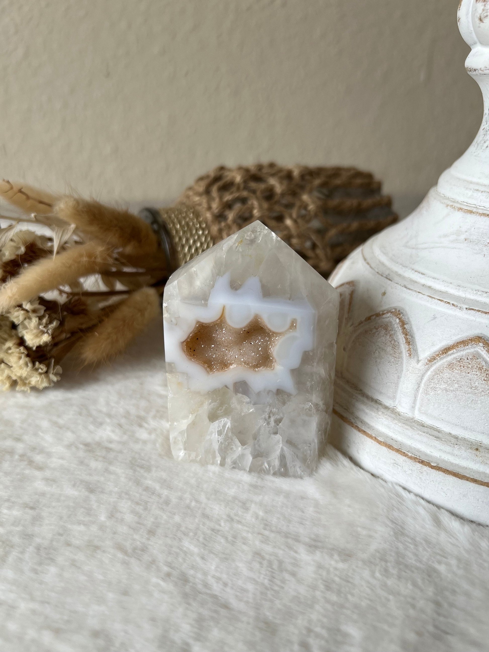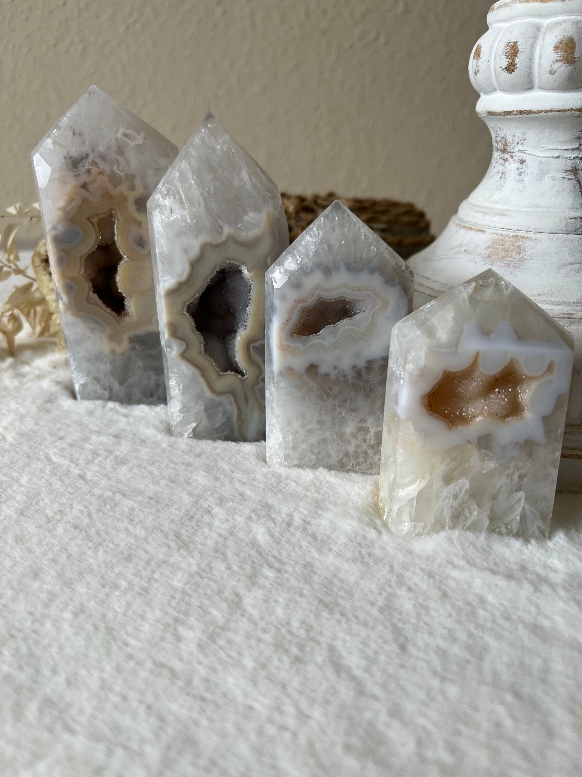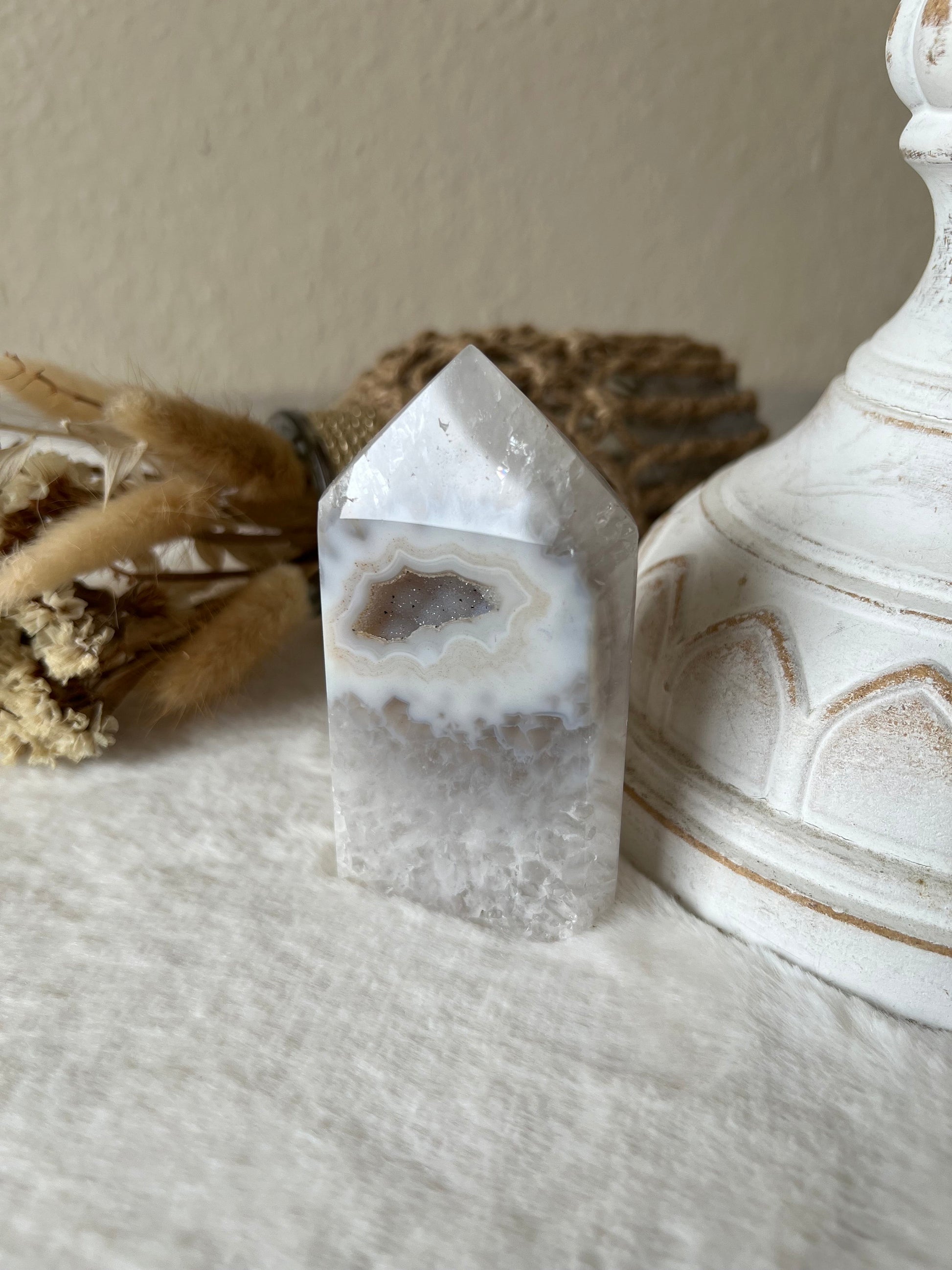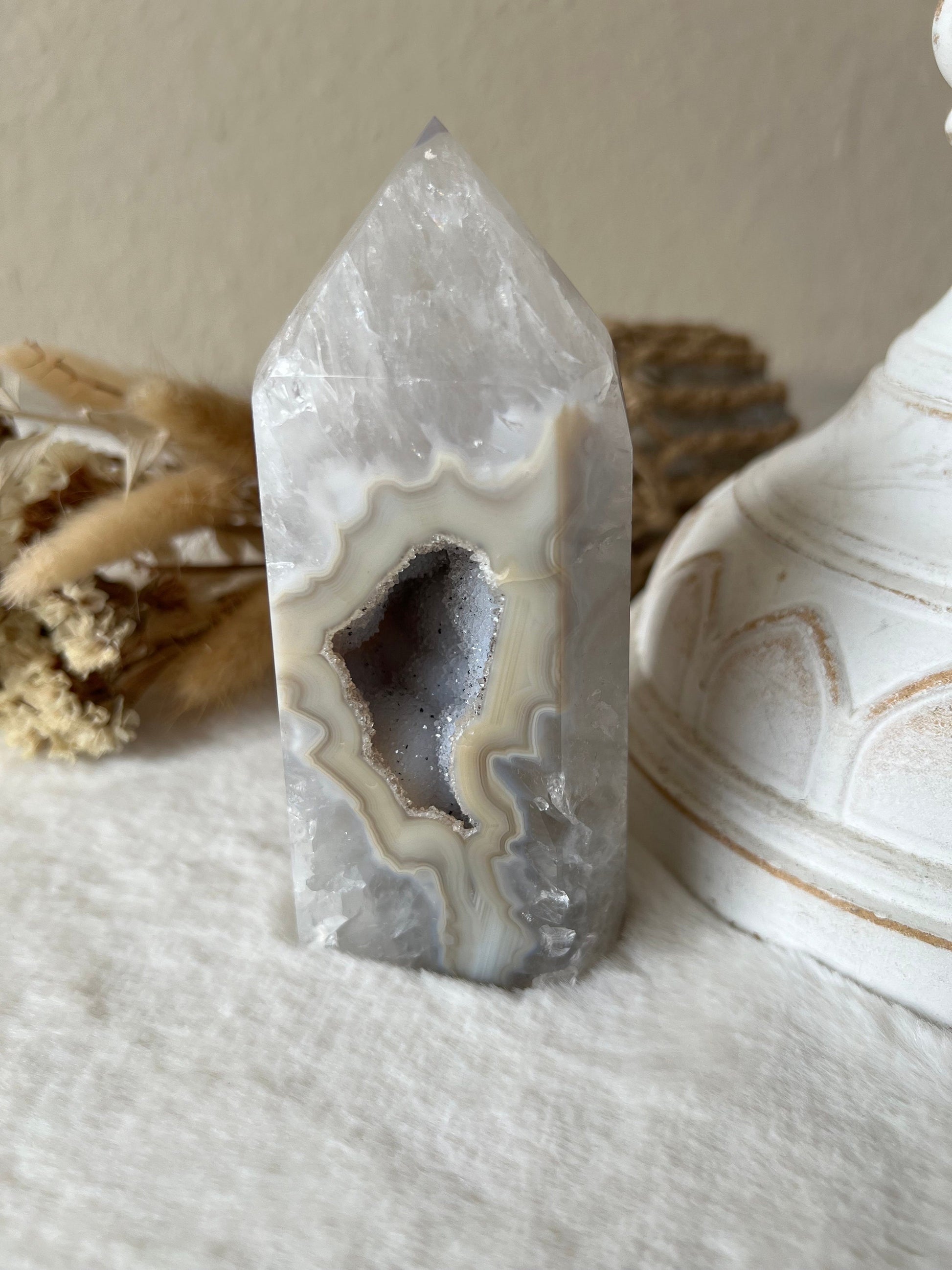 Weiße Achat-Türme mit beiger und grauer Glitzerdruse sind faszinierende Schmuckstücke der Natur. Ihre glänzenden Kristalle verleihen ihnen eine ästhetische Anziehungskraft, die sowohl im Wohnraum als auch in der spirituellen Praxis geschätzt wird. Dieser Edelstein wird oft für seine nachgesagten Heilwirkungen verehrt, die von der Förderung von Harmonie und Ausgeglichenheit bis hin zur Stärkung von Selbstvertrauen und Schutz reichen. In der esoterischen Welt wird ihm auch zugeschrieben, negative Energien abzuwehren und die spirituelle Entwicklung zu fördern.