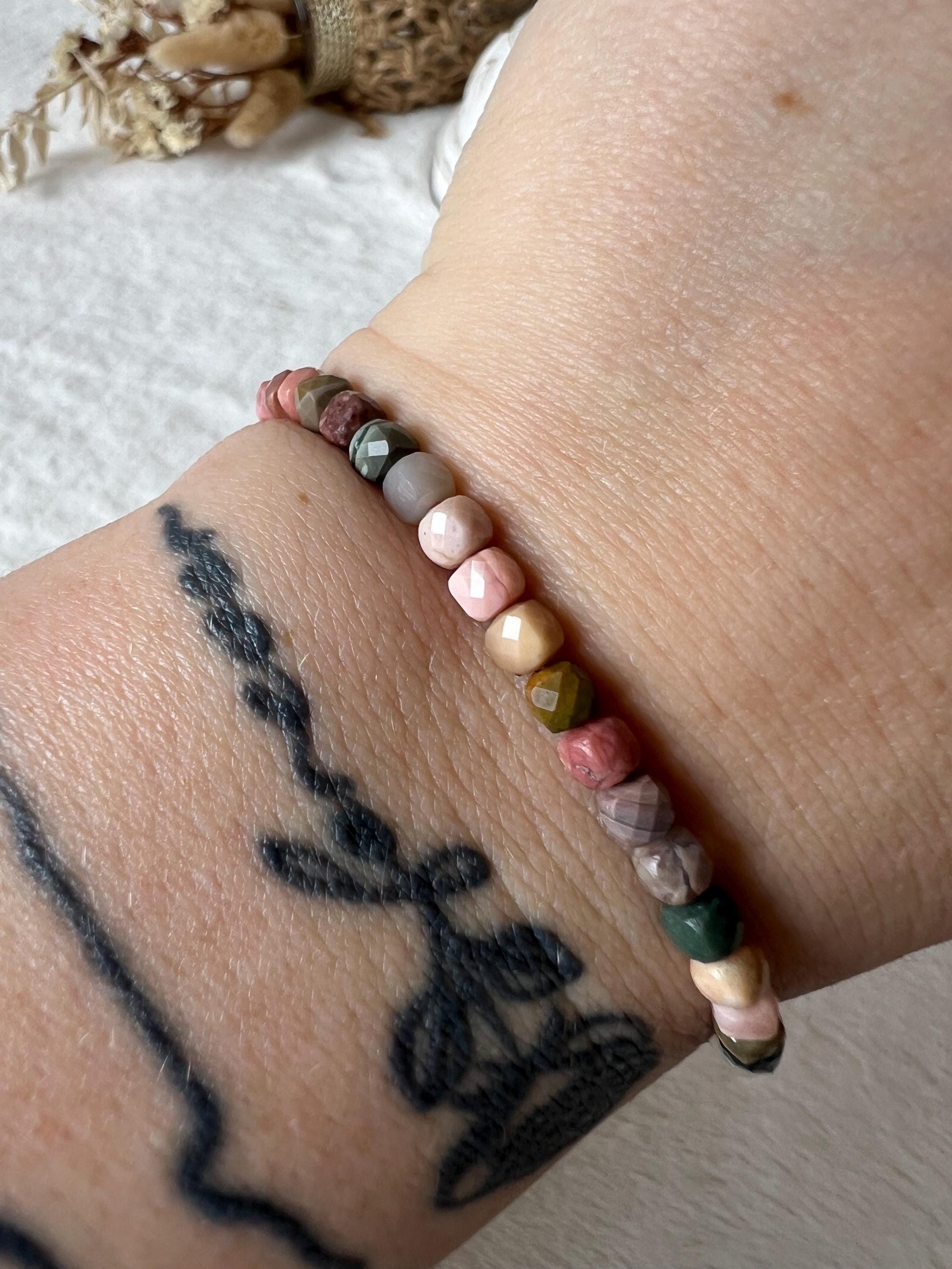 Dieses elegante Alashan Achat Armband besteht aus 4,5mm facettierten Würfeln, die dem Armband eine außergewöhnliche Textur und einen modernen Look verleihen. Der Alashan Achat, bekannt für seine sanften Erdtöne und beruhigenden Energie, fördert Harmonie und innere Ausgeglichenheit. Die facettierte Form der Würfel sorgt für zusätzlichen Glanz und eine wunderschöne Lichtreflexion, die dem Armband eine besonders raffinierte Ausstrahlung verleiht.