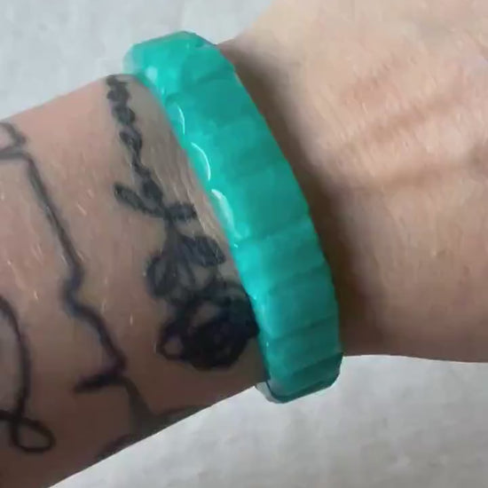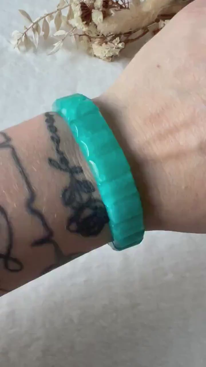 Ein Amazonit-Armband aus hochwertigen, sehr breiten rechteckigen Perlen ist ein stilvolles und einzigartiges Schmuckstück, das nicht nur durch sein auffälliges Design besticht, sondern auch durch die energetischen Eigenschaften des Amazonits.