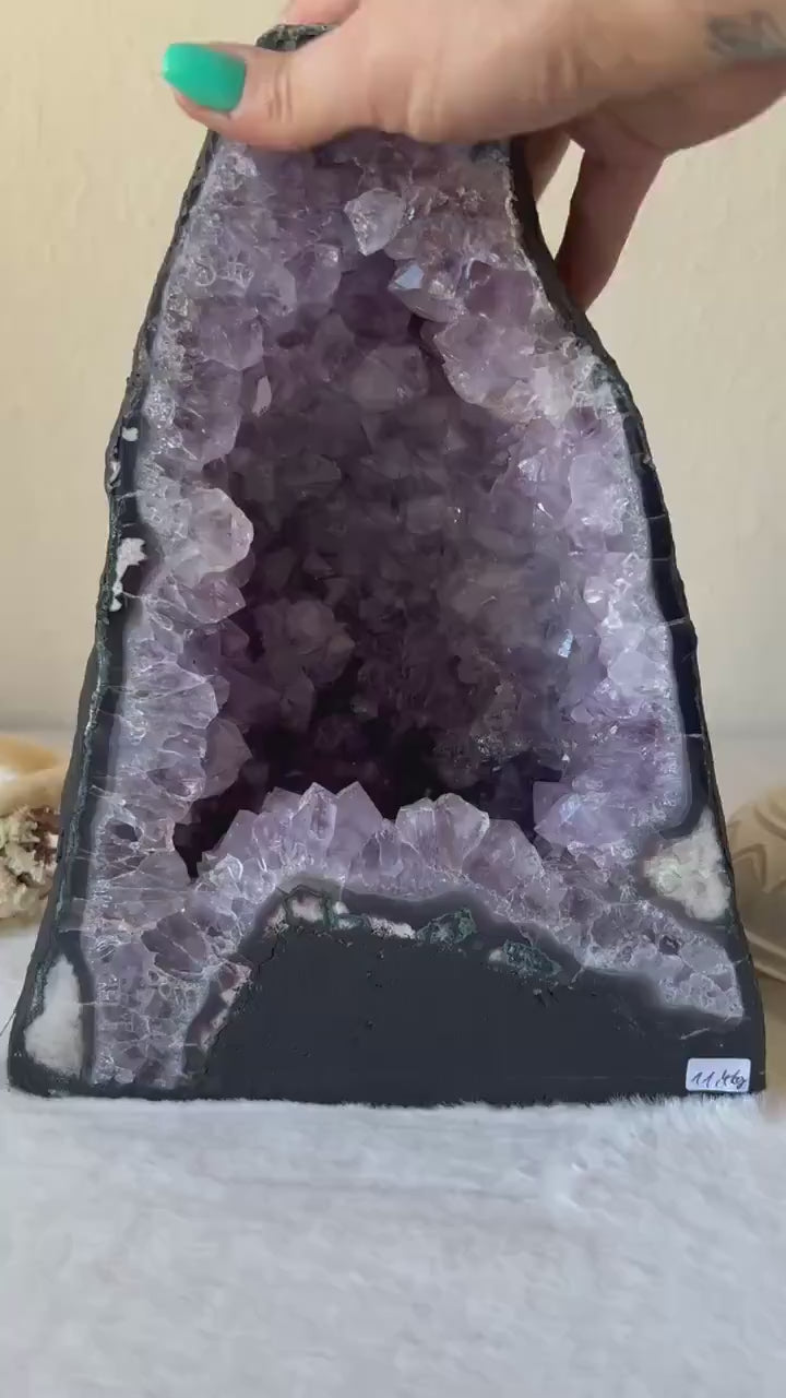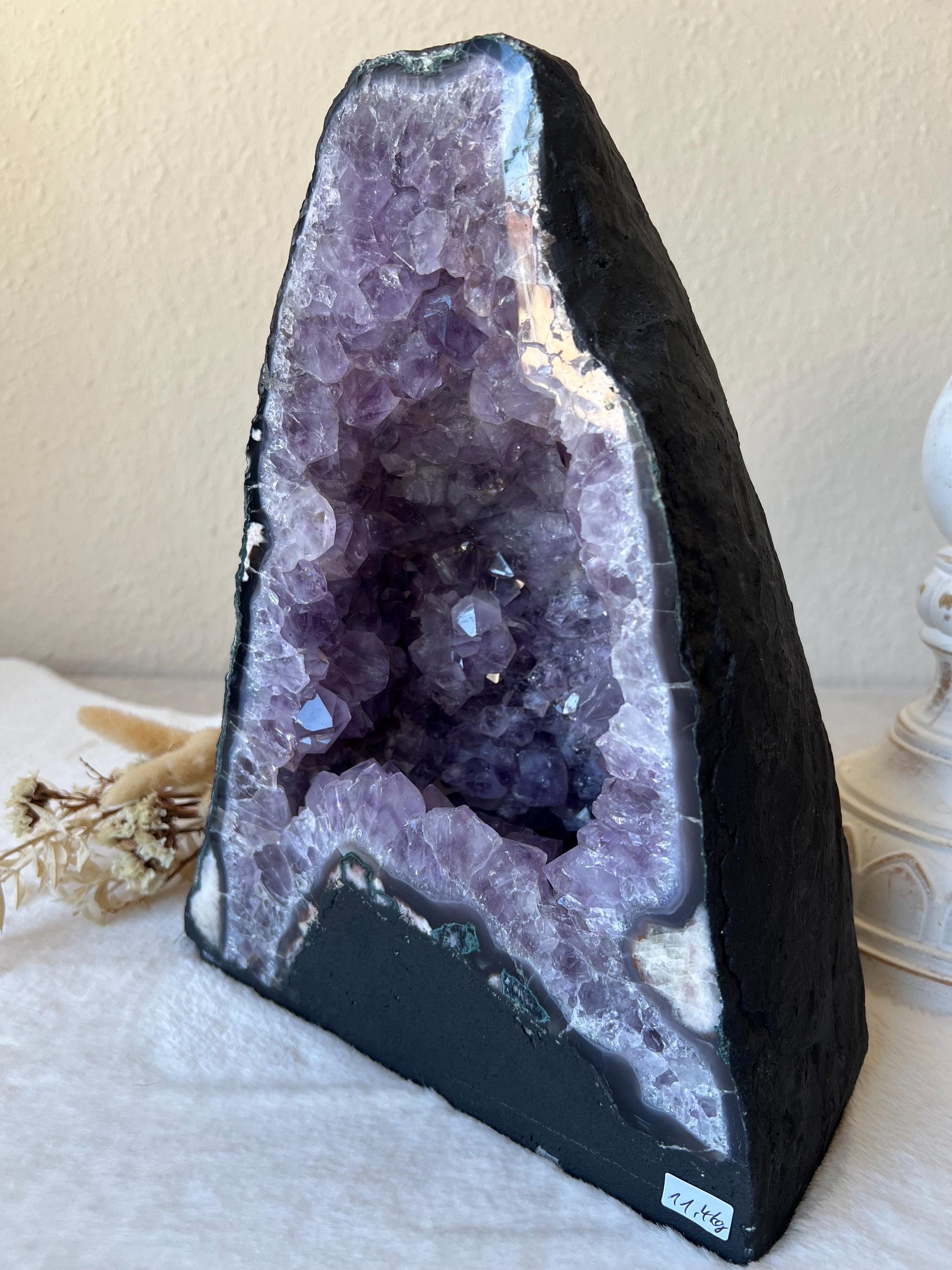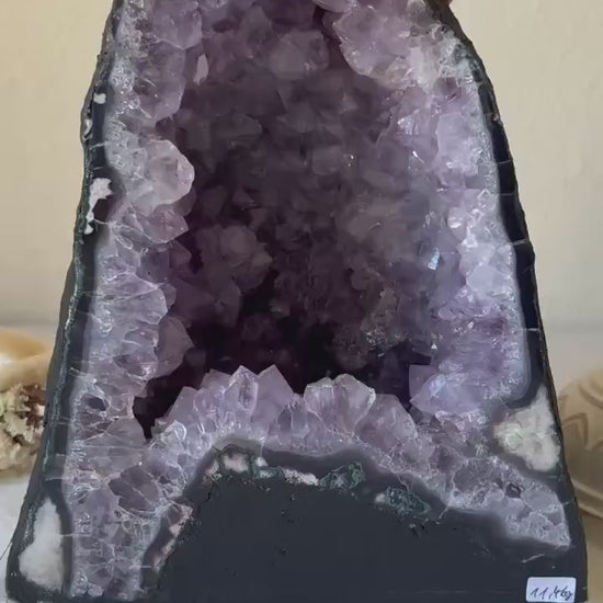 Die Kombination aus der tiefen, fast dunklen Amethystkammer und den helleren Kristallrändern macht dieses Stück zu einem richtigen Statement Piece. Jede Kristallspitze erzählt ihre eigene Geschichte - ein Naturkunstwerk, das sowohl optisch als auch energetisch absolut beeindruckt.