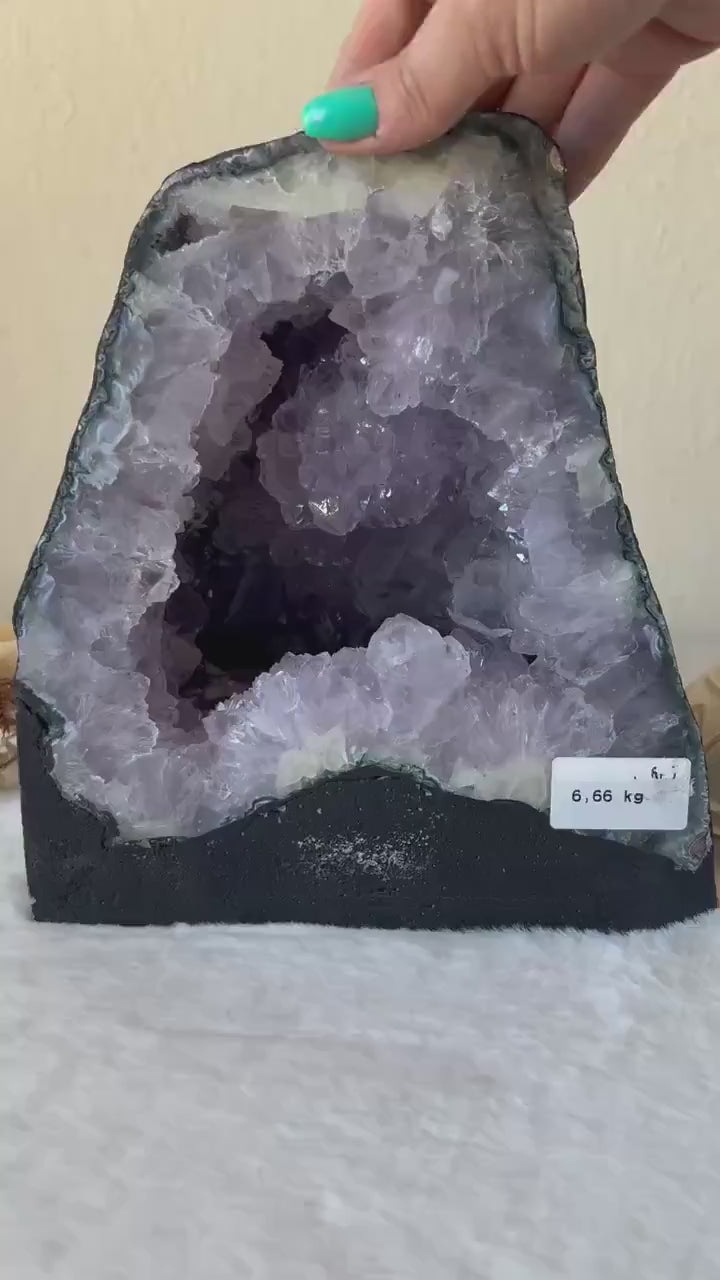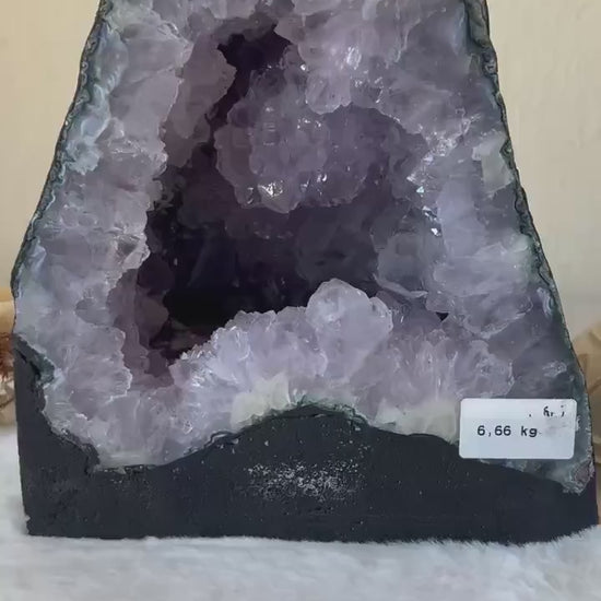 Diese wunderschöne Amethyst Drusen-Kathedrale ist ein echtes Naturjuwel - sanft, beruhigend und voller magischer Tiefe. Die zart-violetten Kristalle leuchten von innen heraus und schaffen eine beruhigende, fast schützende Atmosphäre. Die offene Höhle wirkt wie ein kleiner Kraftort, der sofort Harmonie und Klarheit in jeden Raum bringt.