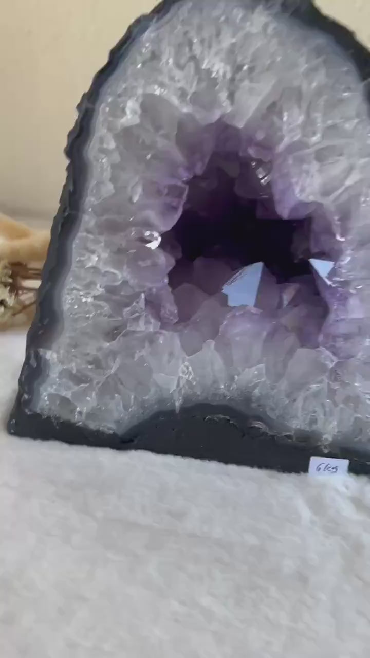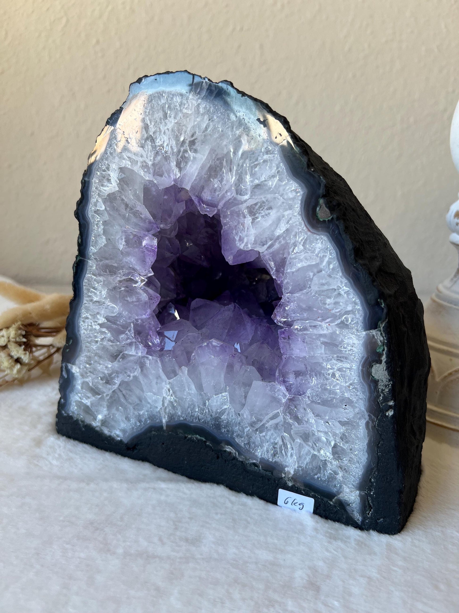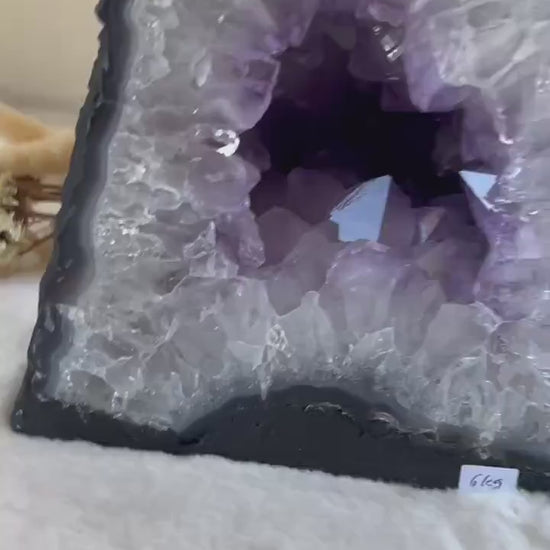 Diese beiden Amethyst Drusen-Kathedralen sind wahre Naturkunstwerke - kraftvoll, elegant und voller faszinierender Details. Die hellen, fast eisigen Außenkanten gehen sanft in ein intensives Violett über und eröffnen den Blick in eine tiefe, funkelnde Kristallhöhle. Jede Druse hat ihre ganz eigene Ausstrahlung, doch beide vereint eine unglaubliche Klarheit und Reinheit der Kristalle.