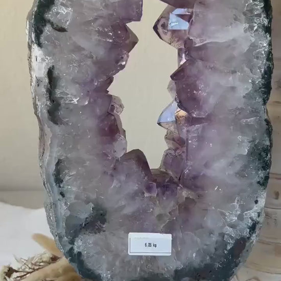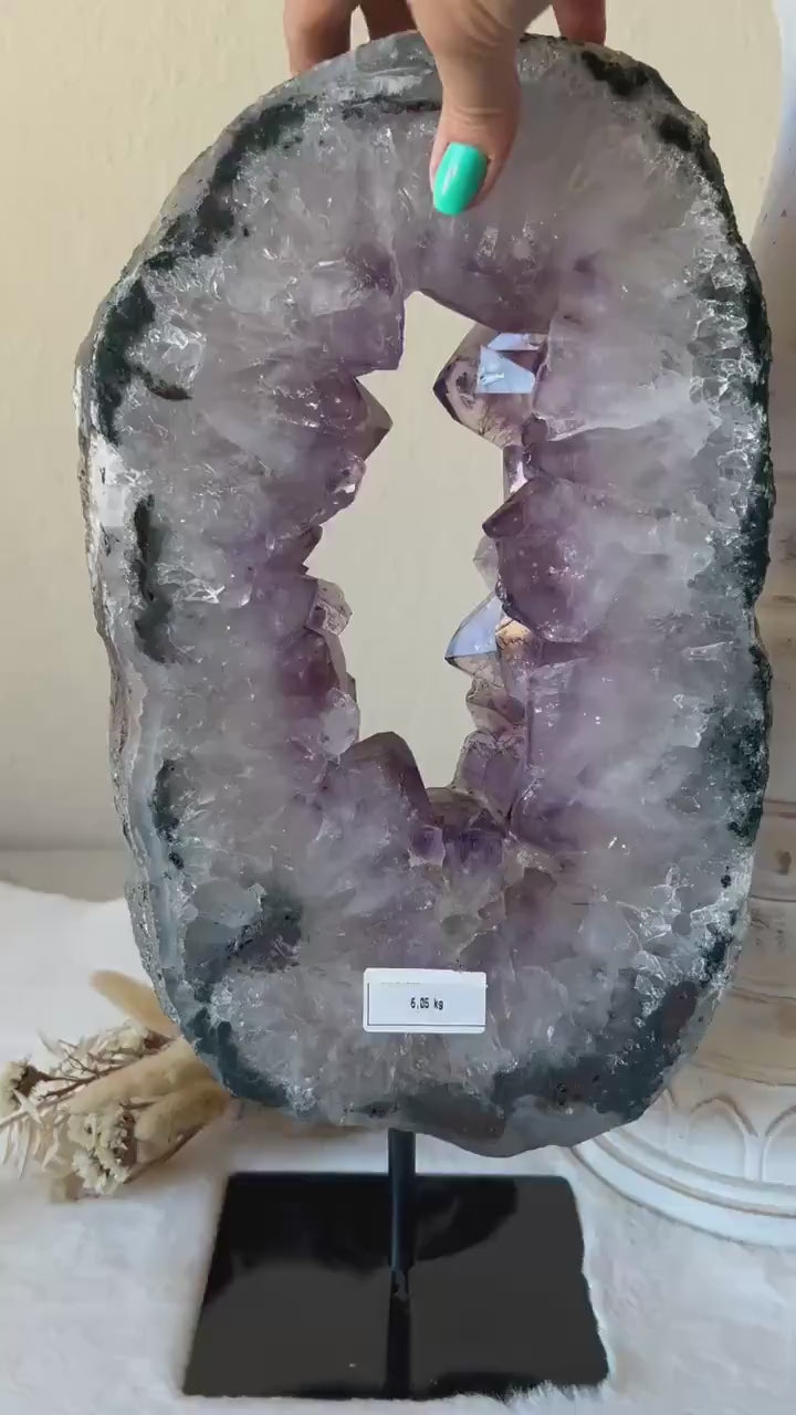Dieses eindrucksvolle, länglich geformte Amethyst-Portal bringt kraftvolle Erdenergie und spirituelle Tiefe in perfekter Harmonie zusammen. Mit einem Gewicht von 6,05 kg ist es nicht nur ein visuelles Highlight, sondern auch ein energetisches Zentrum für jeden Raum. Der äußere Rand aus grünem Achat erinnert an Natur, Wachstum und Stabilität, während das Innere aus hochreinem Quarz besteht - durchzogen von leuchtend lilafarbenen Amethystspitzen, die wie ein Herzstück strahlen.