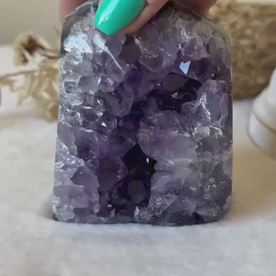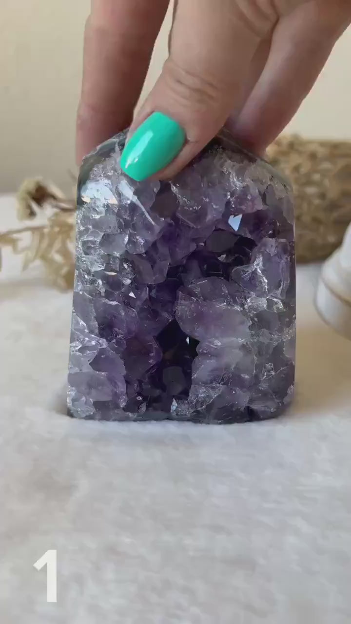 Diese eindrucksvollen Amethyst-Türme aus Uruguay vereinen intensives Violett mit der rohen Kraft von dunklem Basaltgestein. Der Kristall wächst direkt in der vulkanischen Matrix und bildet durch natürlichen Druck und Zeit diese ausdrucksstarken Spitzen. Poliert zur Turmform, bleibt ein Teil der Basaltmatrix sichtbar - eine kraftvolle Verbindung von spirituellem Licht und erdender Tiefe.