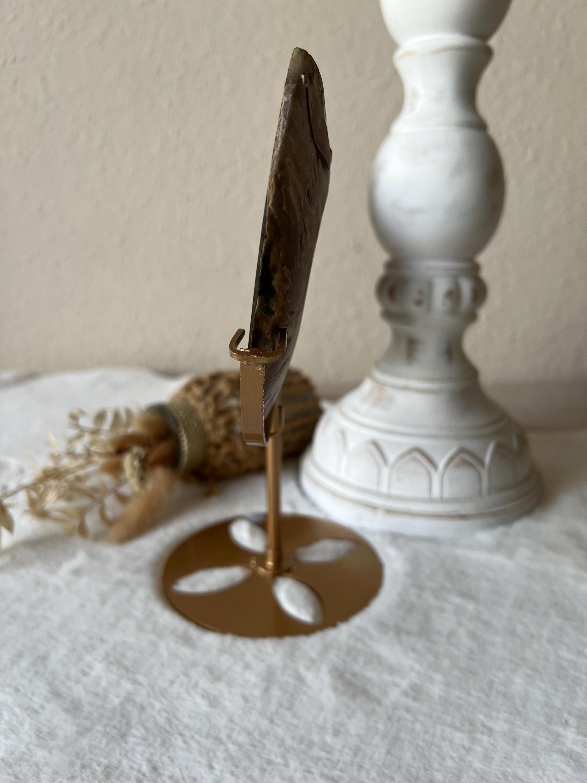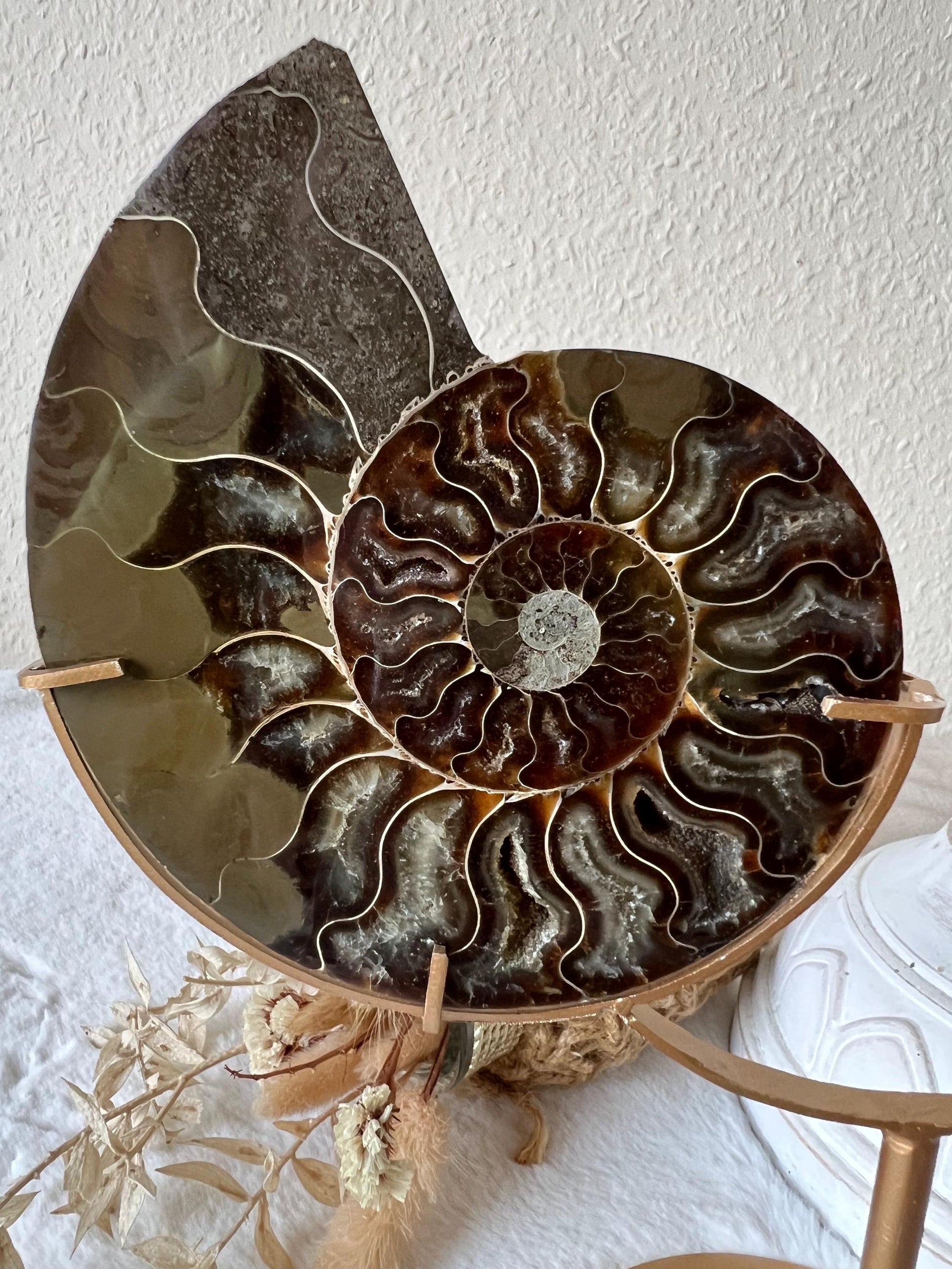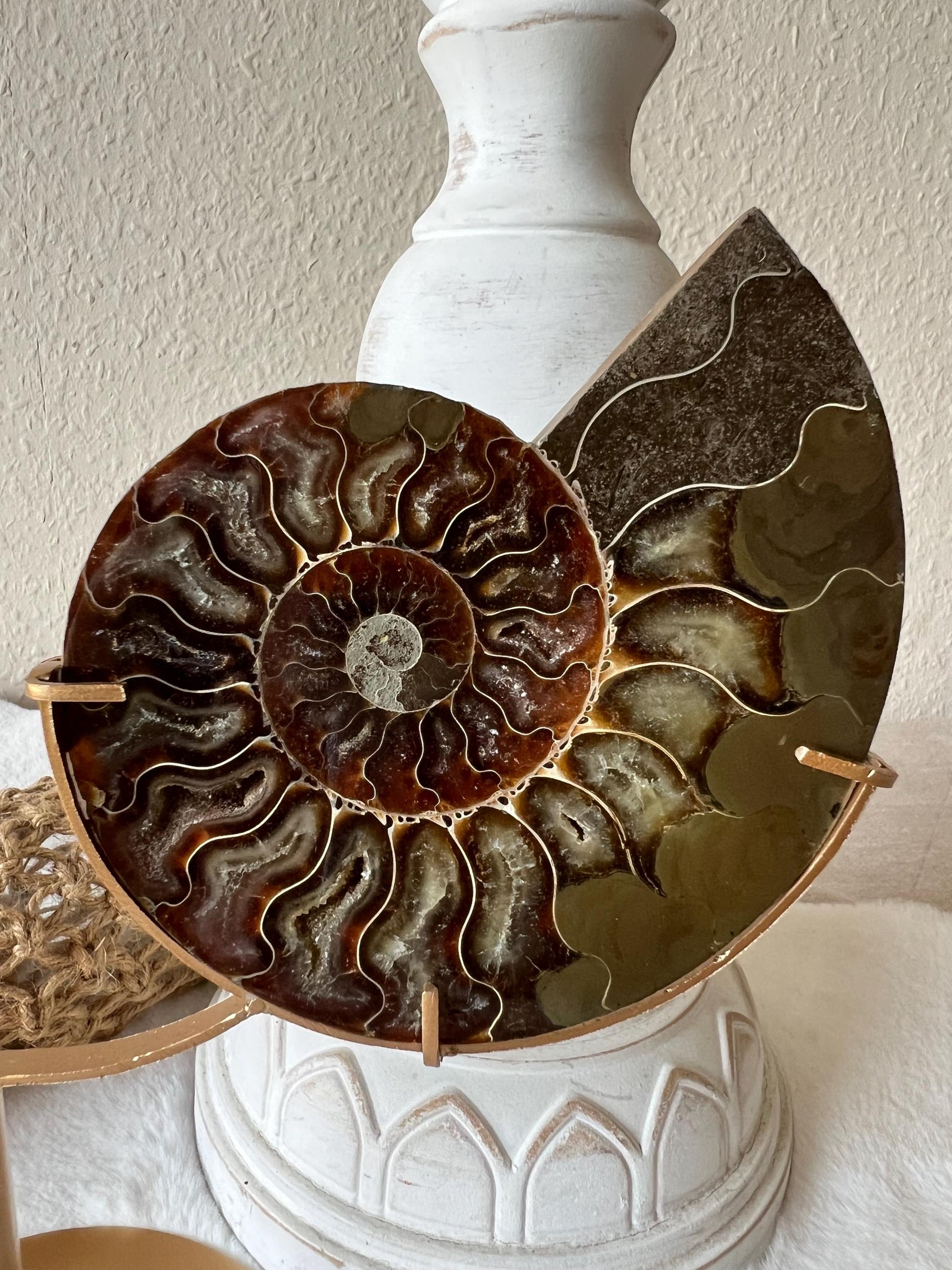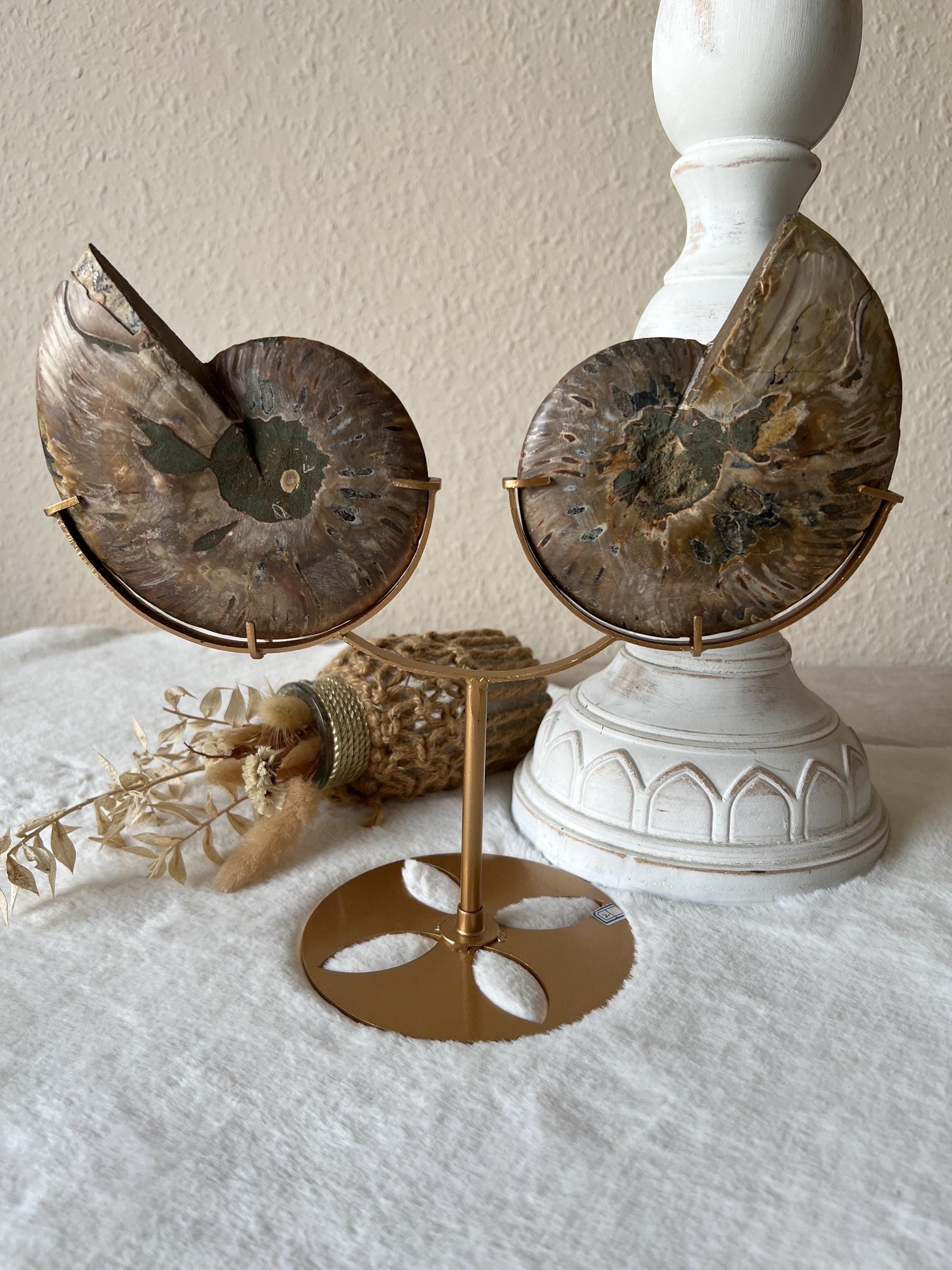 Dieses wunderschöne Ammoniten Paar ist ein echtes Geschenk aus der Urzeit. Die beiden Hälften ergänzen sich perfekt und zeigen die faszinierende, spiralförmige Struktur dieser Millionen Jahre alten Fossilien. Präsentiert auf dem eleganten Ständer werden sie zu einem absoluten Blickfang 🌍✨