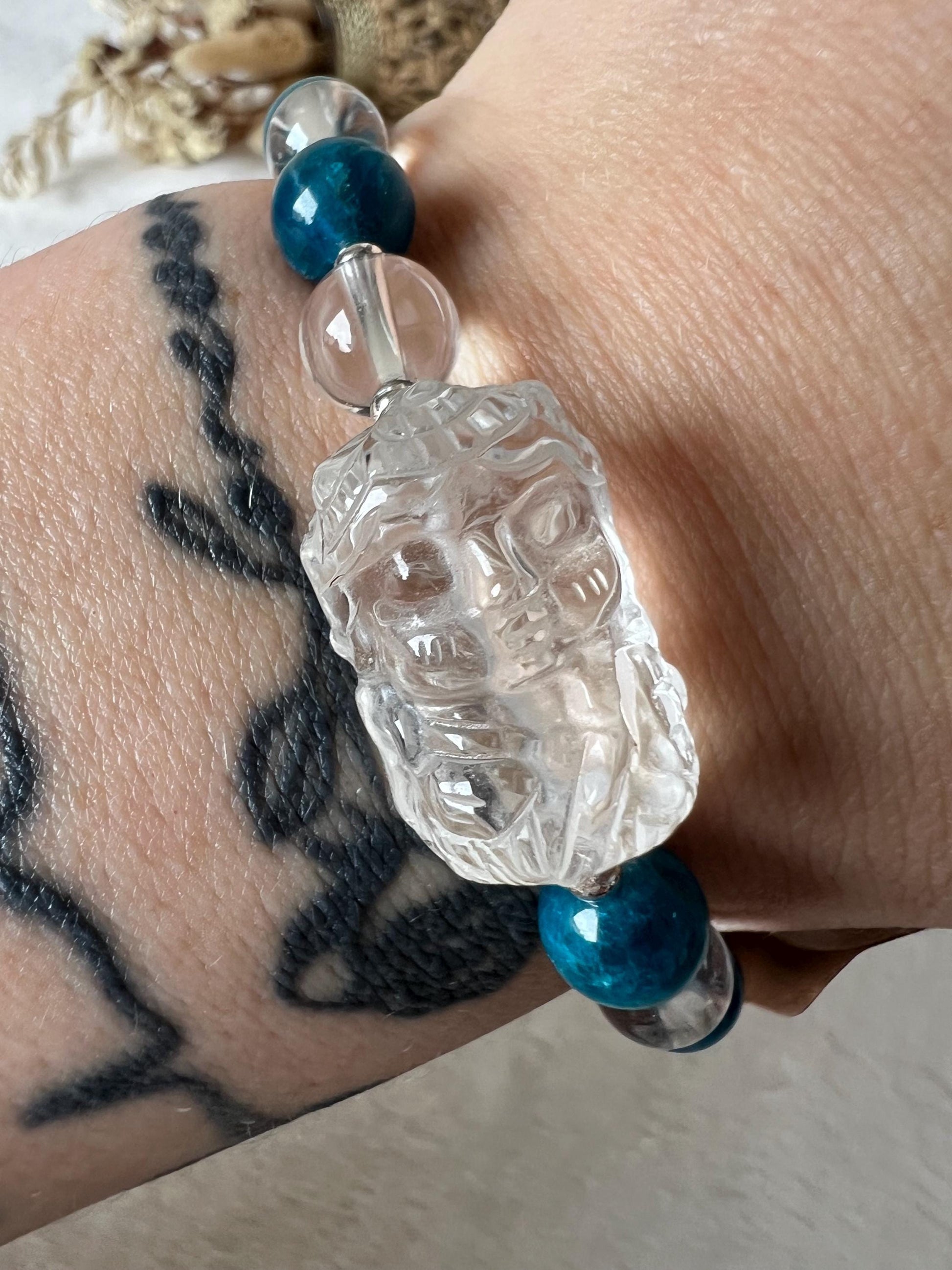 Dieses Armband zeigt eine wunderschöne Bergkristall-Mädchen-Perle als Symbol für Wachstum, Schutz und eine klare Verbindung zu deiner inneren Weisheit. Der Apatit fügt dem Armband eine erfrischende Energie hinzu, die Kreativität und positive Veränderung fördert. Die 925 Silber-Elemente bringen einen Hauch von Raffinesse und ergänzen das Design perfekt.