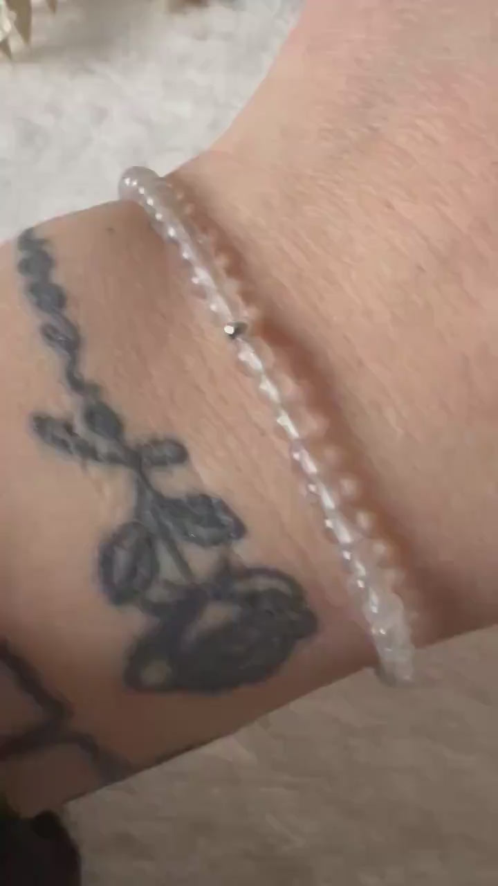 Die silberfarbene Perle in der Mitte symbolisiert Reinheit, Ruhe und Ausgeglichenheit und verstärkt die reinigende und energetisierende Wirkung des Bergkristalls. Während der Bergkristall für Klarheit und spirituelles Wachstum steht, bringt Silber eine kühle Eleganz und innere Ruhe ins Spiel - eine perfekte Kombination für Balance und positive Energie.