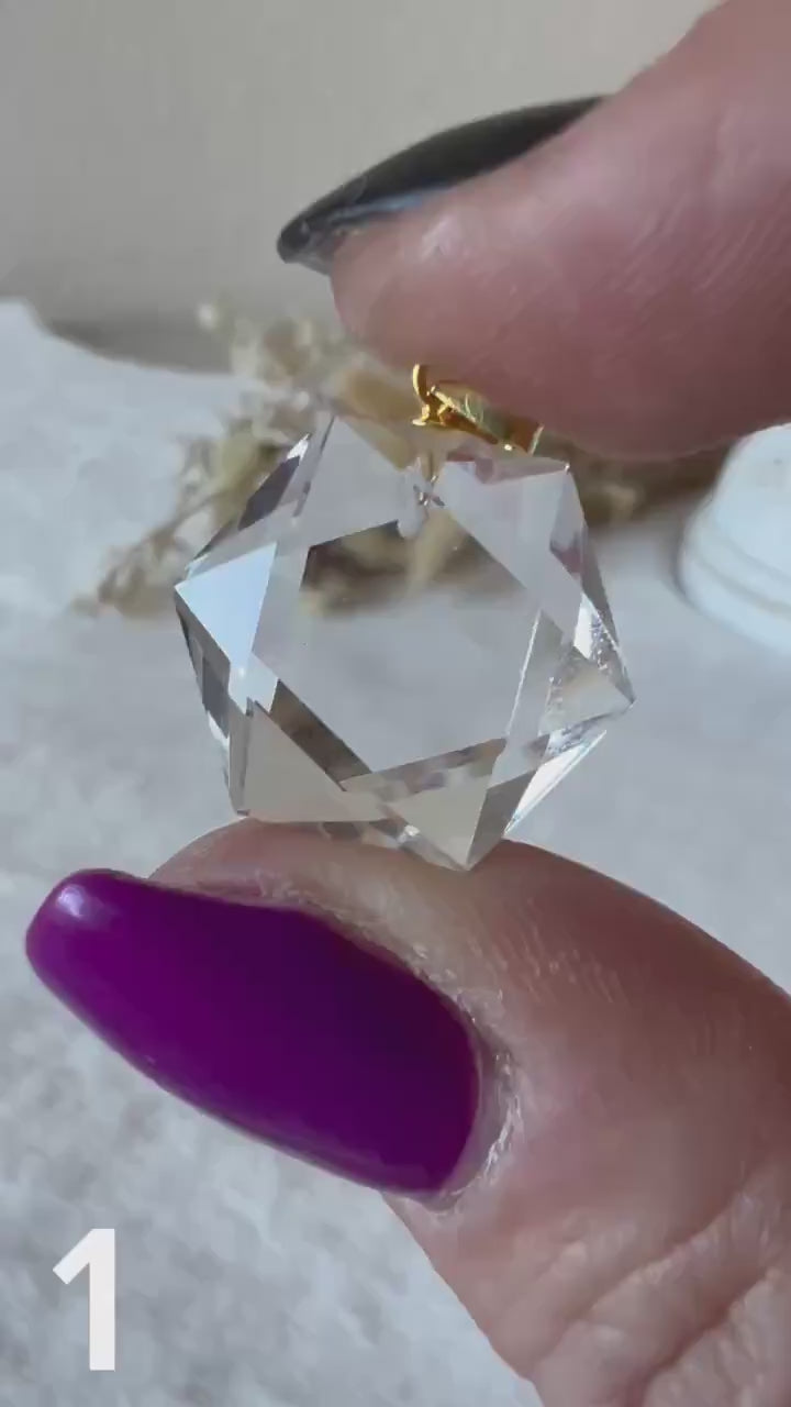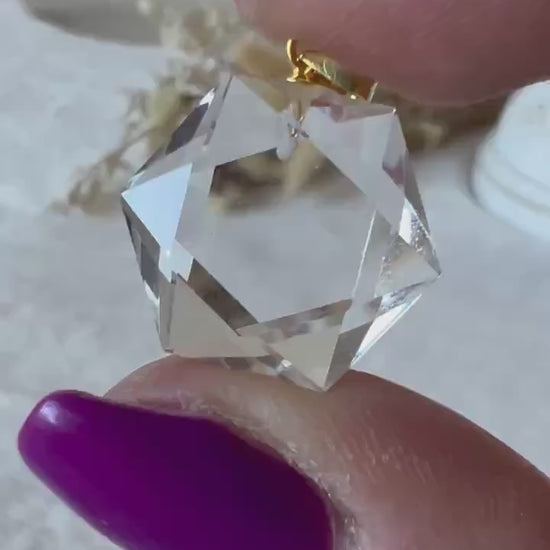 Ein Anhänger voller Licht, Reinheit und goldener Eleganz: Dieser Feenstein-Anhänger wurde aus echtem Bergkristall in die kraftvolle Hexagonform geschliffen - ein Symbol für Ordnung, Schutz und spirituelle Klarheit.