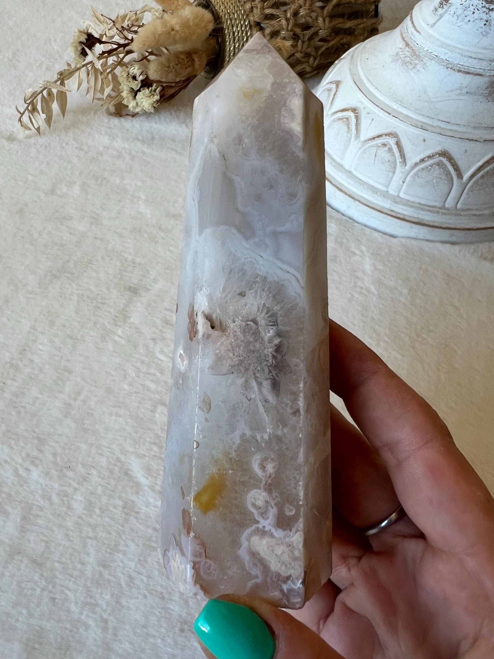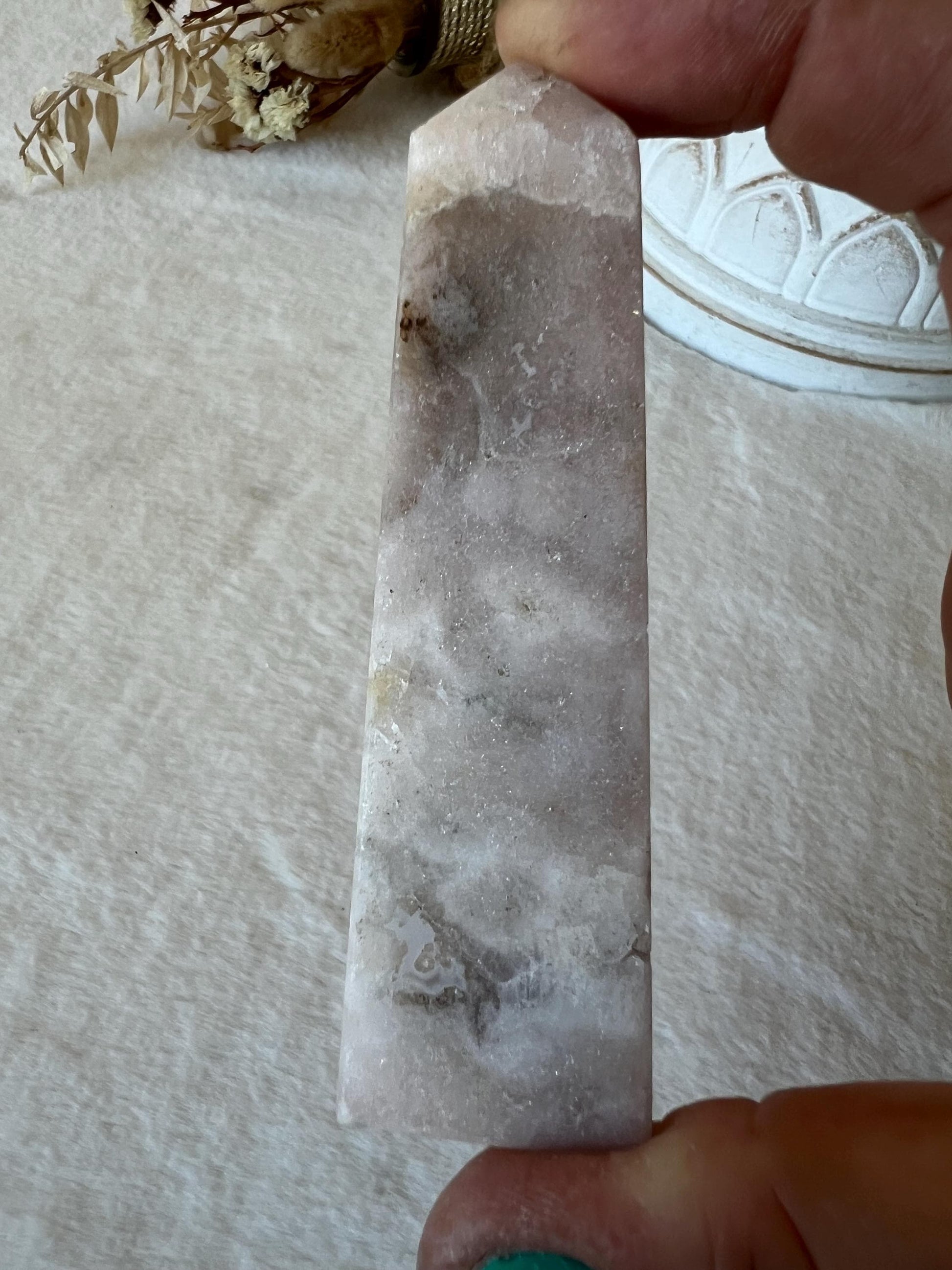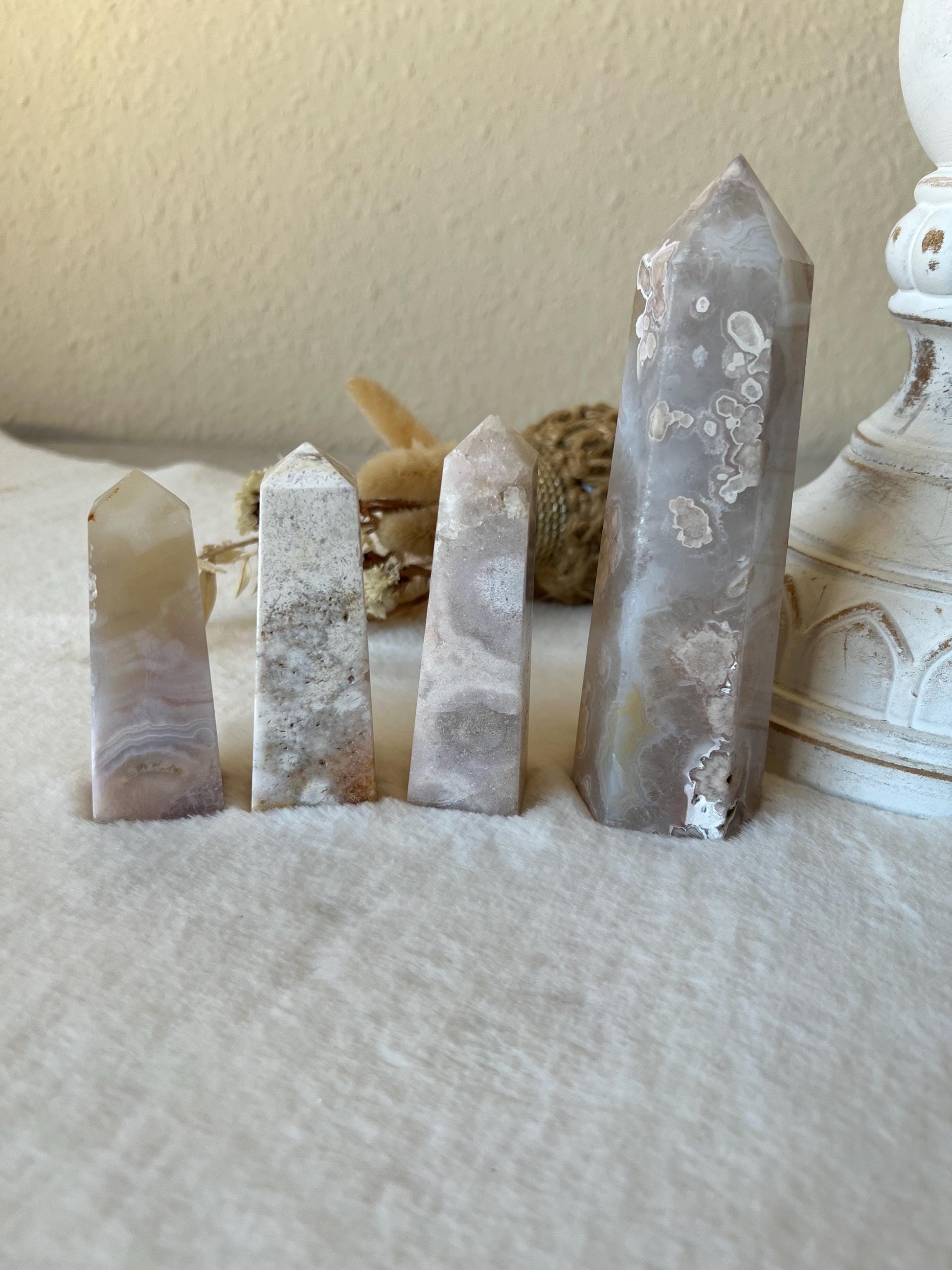 Diese wunderschönen Blumenachat-Türme (Flower Agate) vereinen zarte, blütenartige Strukturen mit der stabilen Form eines Kristallturms. Jeder Turm ist ein einzigartiges Naturkunstwerk mit weichen Rosa- und Cremetönen, durchzogen von weißen, blütenähnlichen Einschlüssen, die an aufblühende Blumen erinnern - ein Symbol für Wachstum, Selbstentfaltung und neue Anfänge.