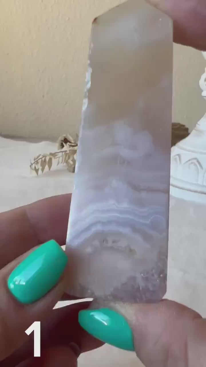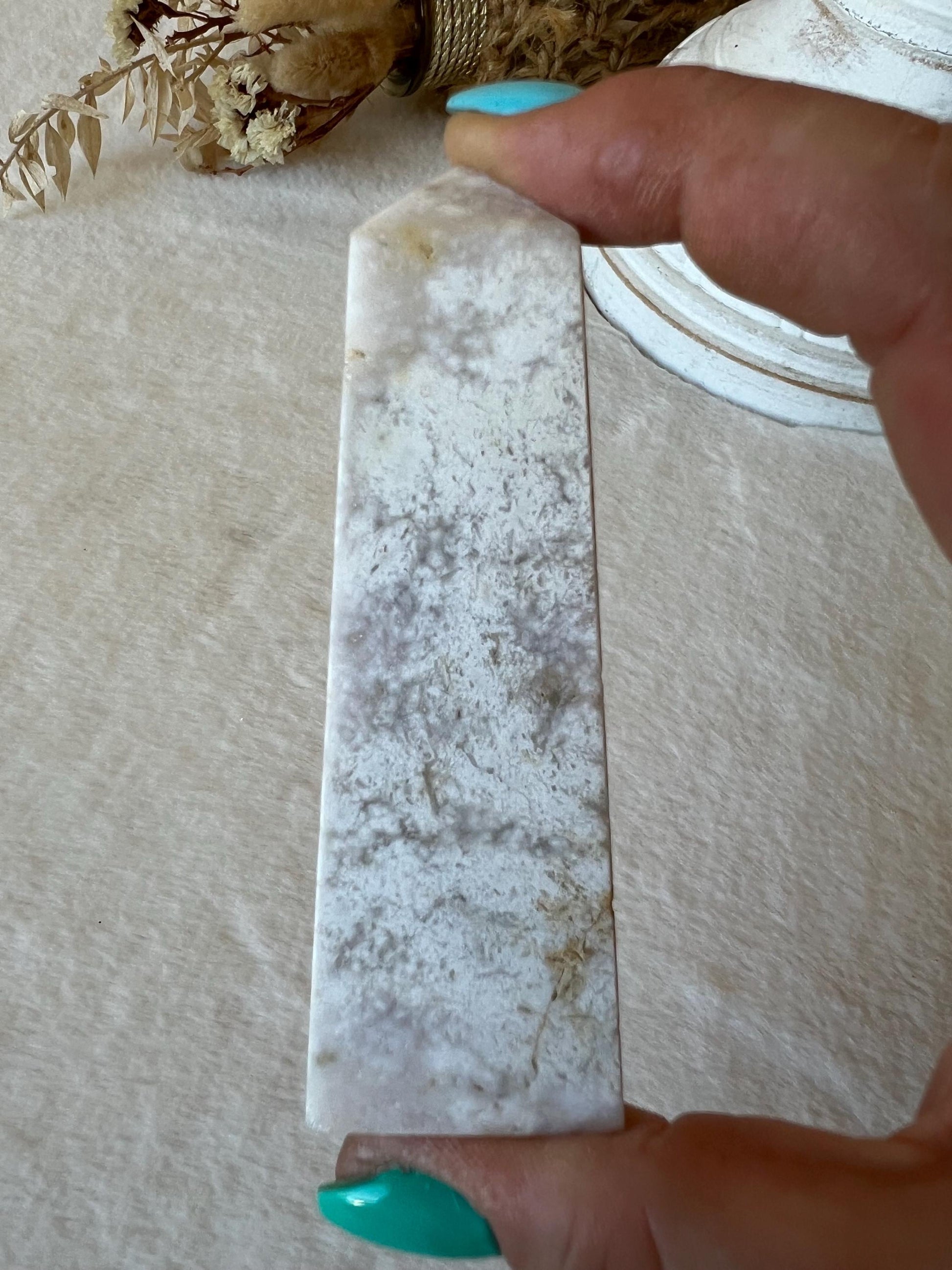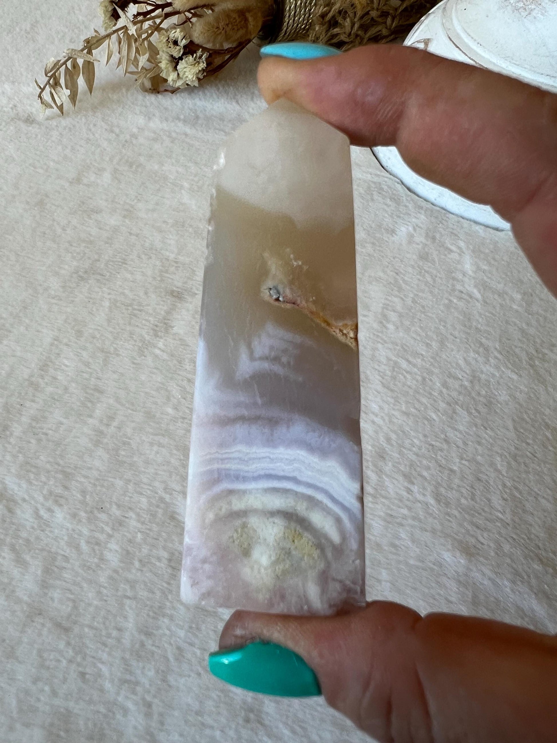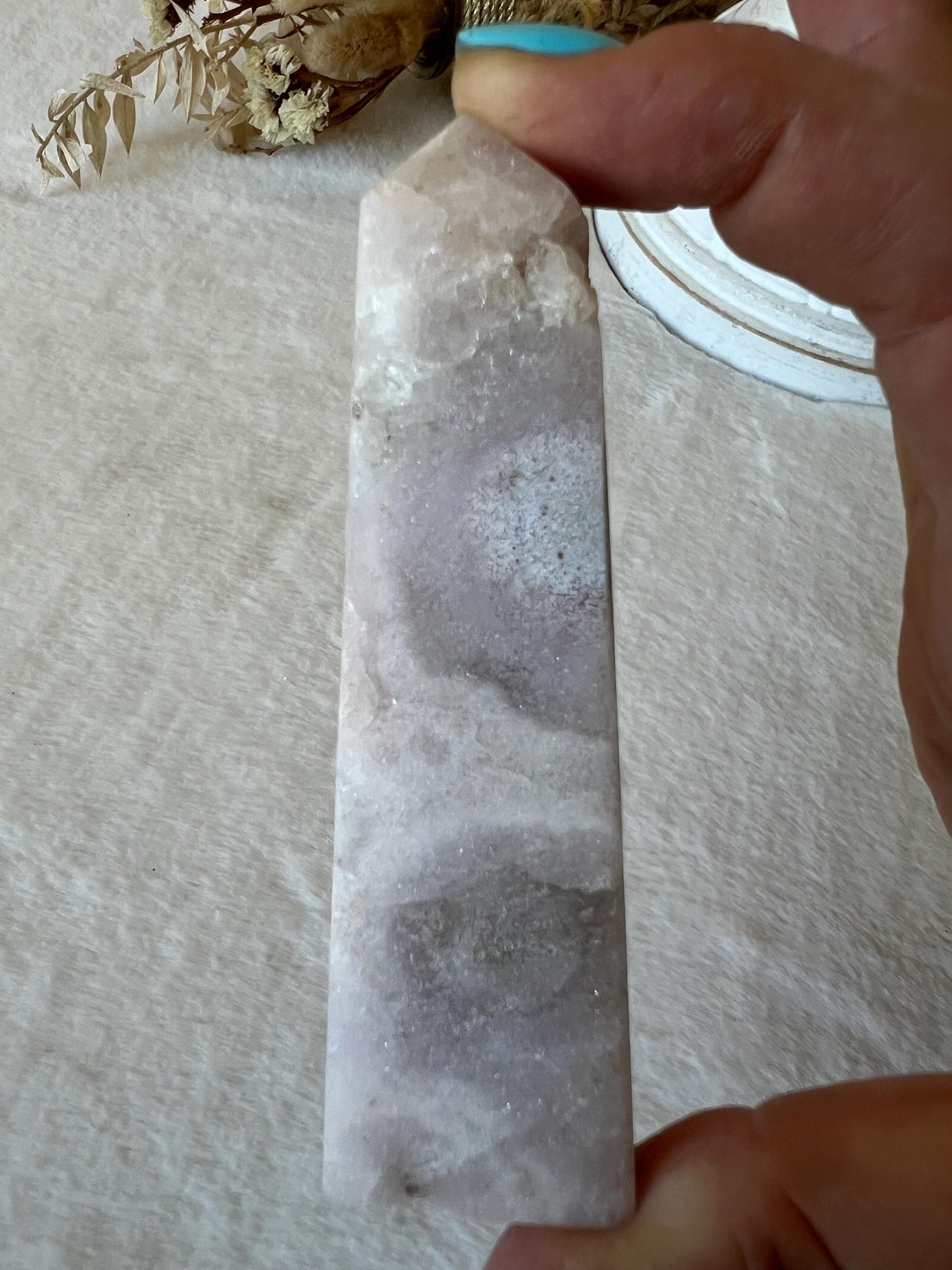 Diese wunderschönen Blumenachat-Türme (Flower Agate) vereinen zarte, blütenartige Strukturen mit der stabilen Form eines Kristallturms. Jeder Turm ist ein einzigartiges Naturkunstwerk mit weichen Rosa- und Cremetönen, durchzogen von weißen, blütenähnlichen Einschlüssen, die an aufblühende Blumen erinnern - ein Symbol für Wachstum, Selbstentfaltung und neue Anfänge.
