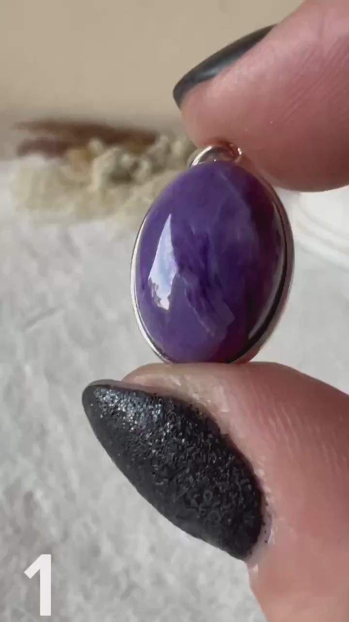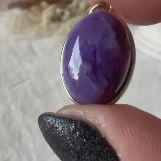 Dieser besondere Anhänger besteht aus echtem 925 Silber und einem intensiv violetten Charoit in ovaler Form.