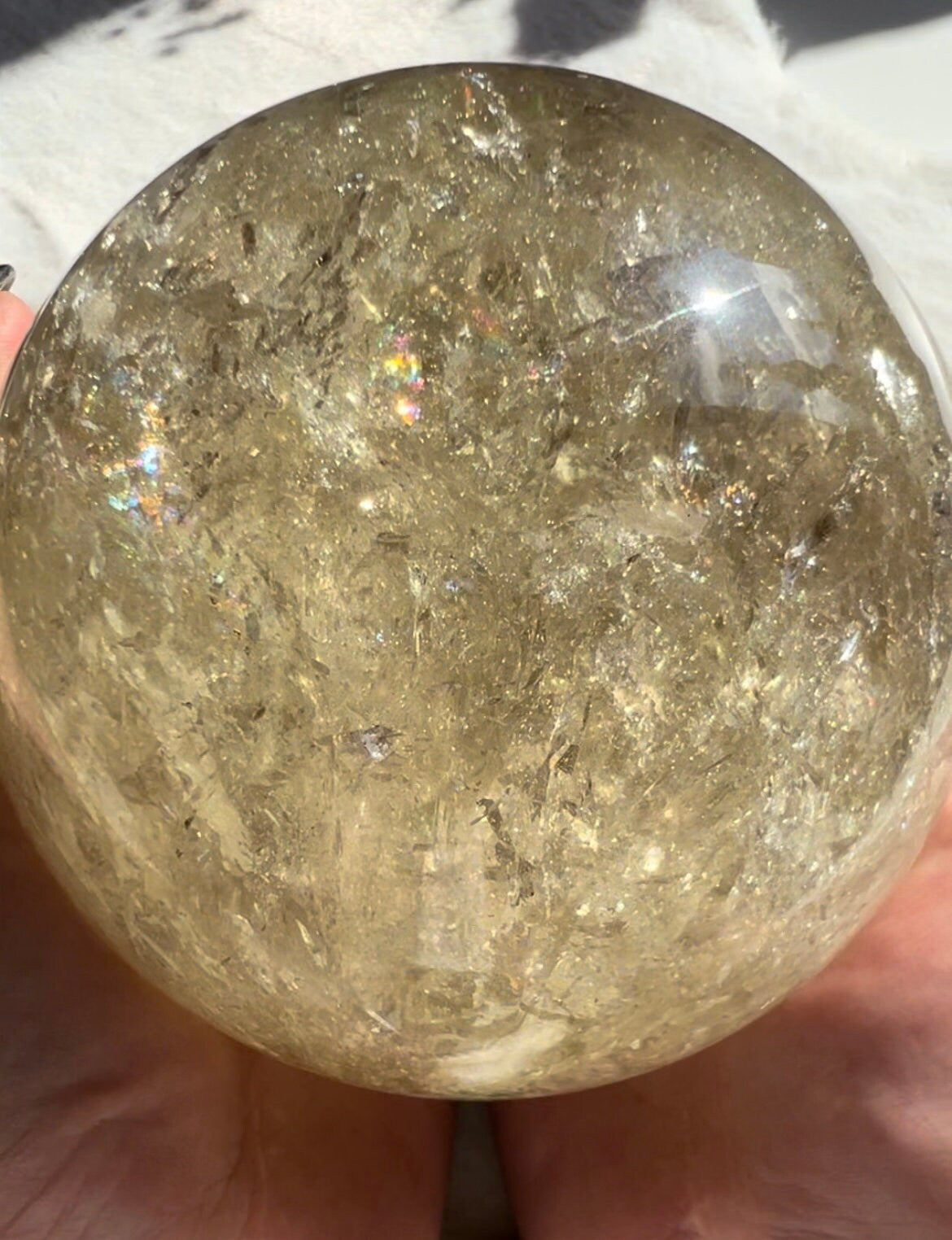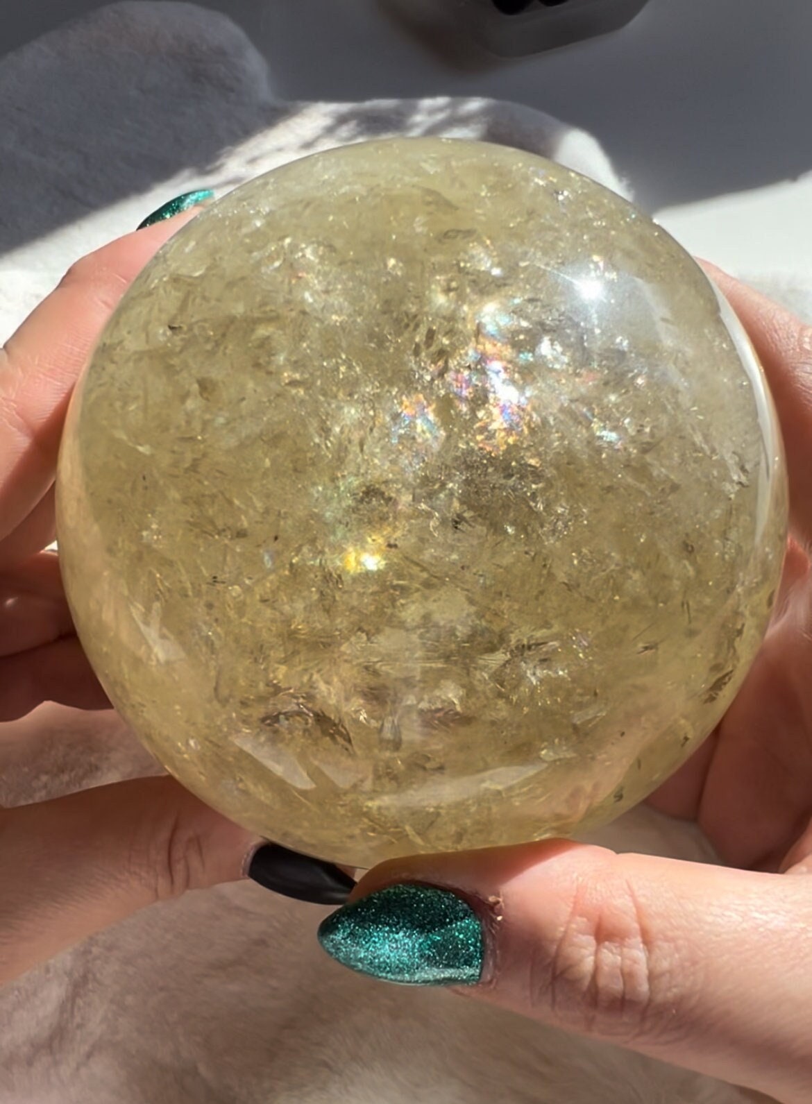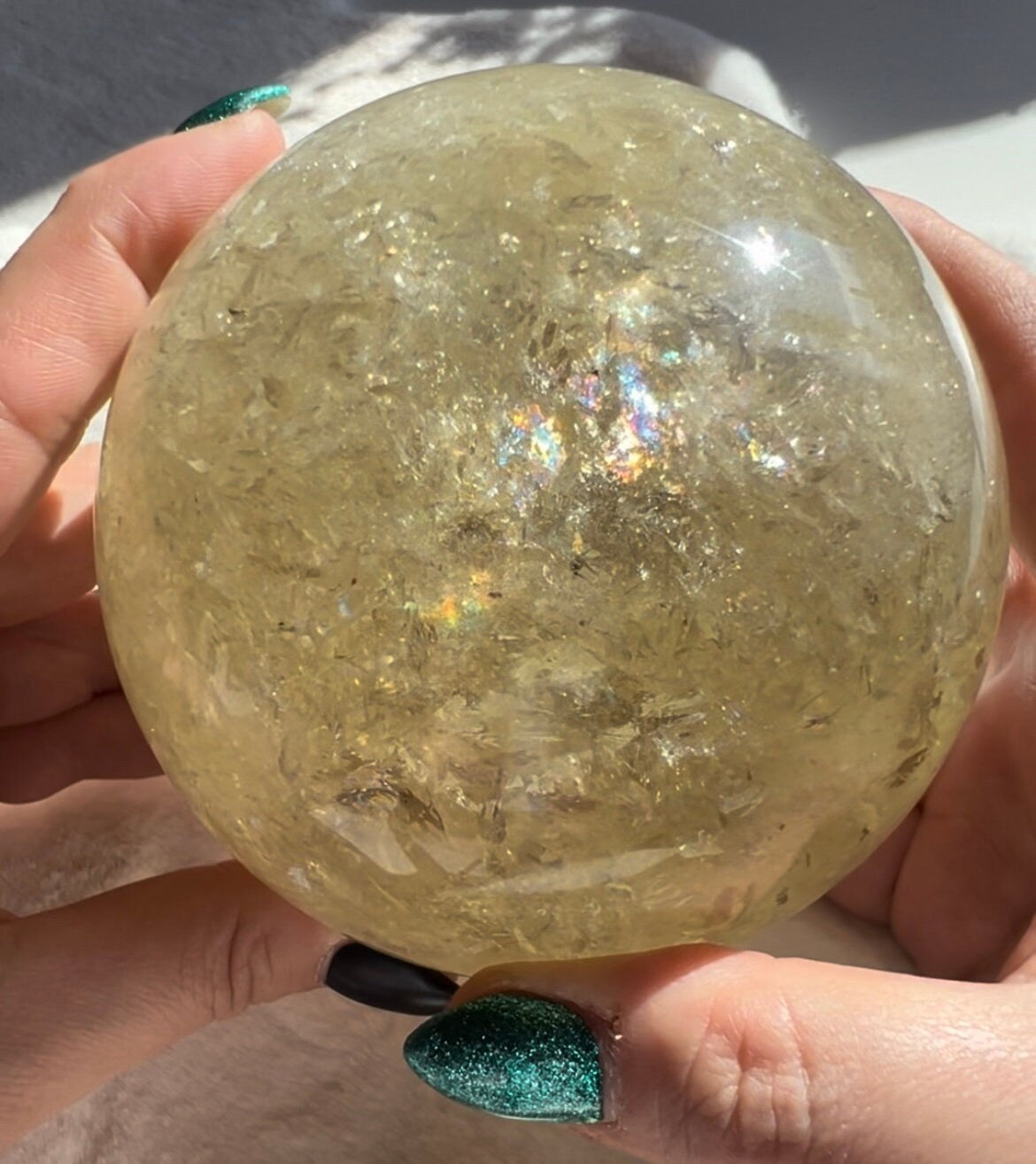 Citrin, bekannt für seine warmen, sonnigen Farben, wird oft als Stein der Freude und des Optimismus betrachtet. Die Regenbogeneinschlüsse in dieser Kugel verleihen ihr eine zusätzliche Schicht der Magie, da sie das Licht einfangen und in ein Spektrum von Farben brechen, was die Energie des Steins noch verstärkt.