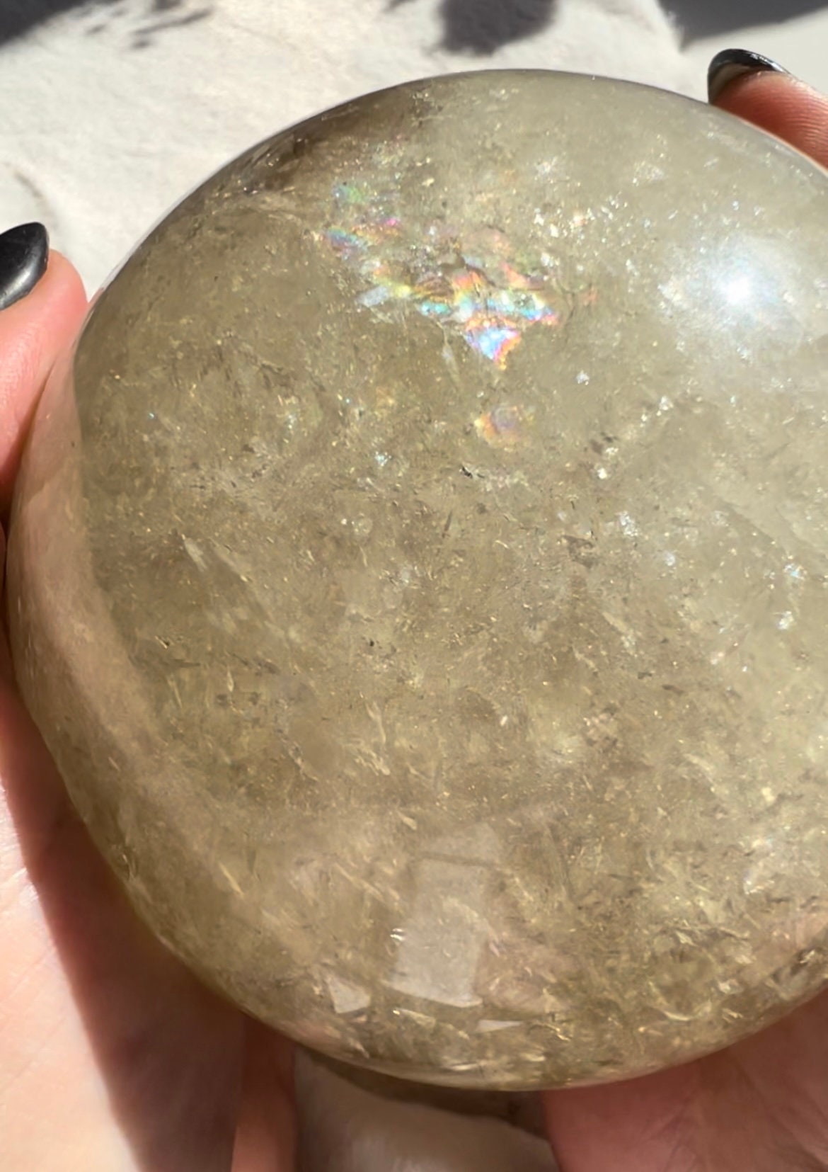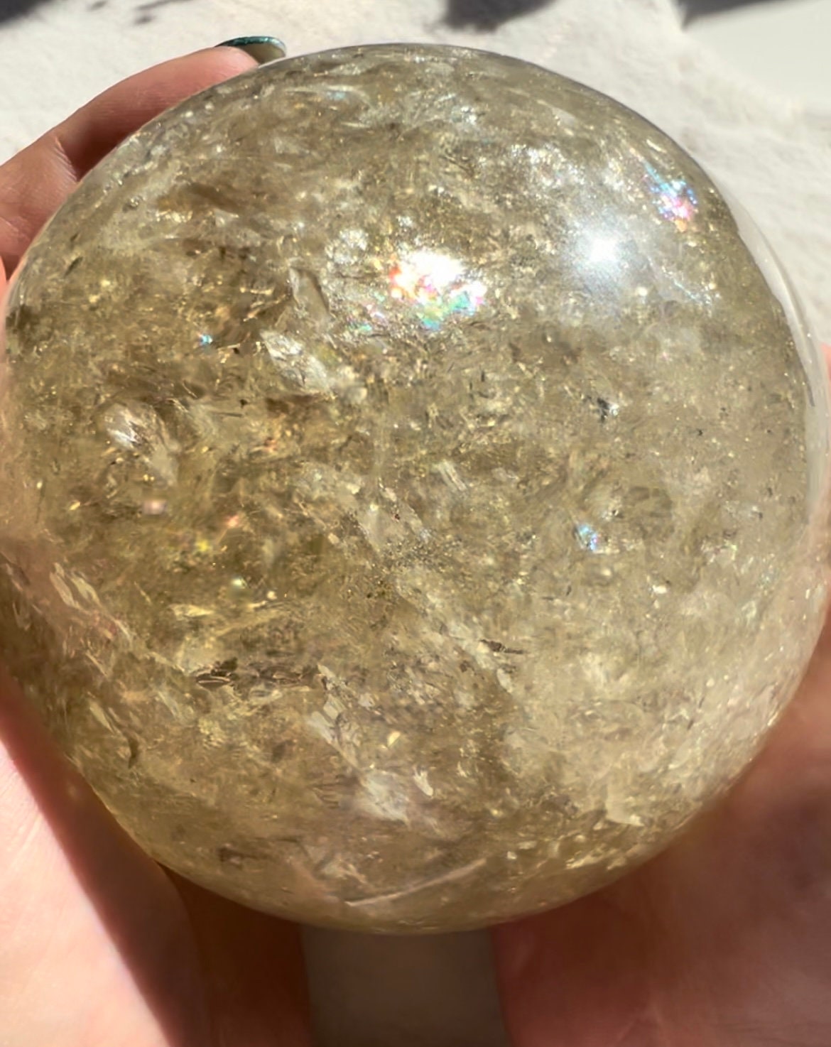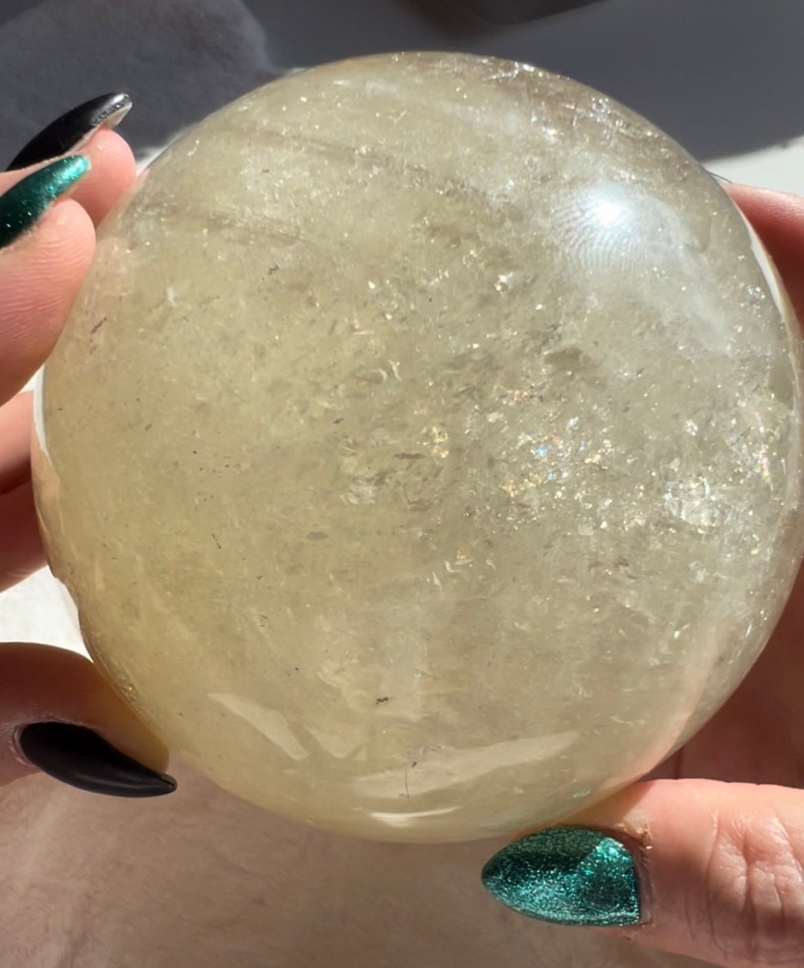 Citrin, bekannt für seine warmen, sonnigen Farben, wird oft als Stein der Freude und des Optimismus betrachtet. Die Regenbogeneinschlüsse in dieser Kugel verleihen ihr eine zusätzliche Schicht der Magie, da sie das Licht einfangen und in ein Spektrum von Farben brechen, was die Energie des Steins noch verstärkt.