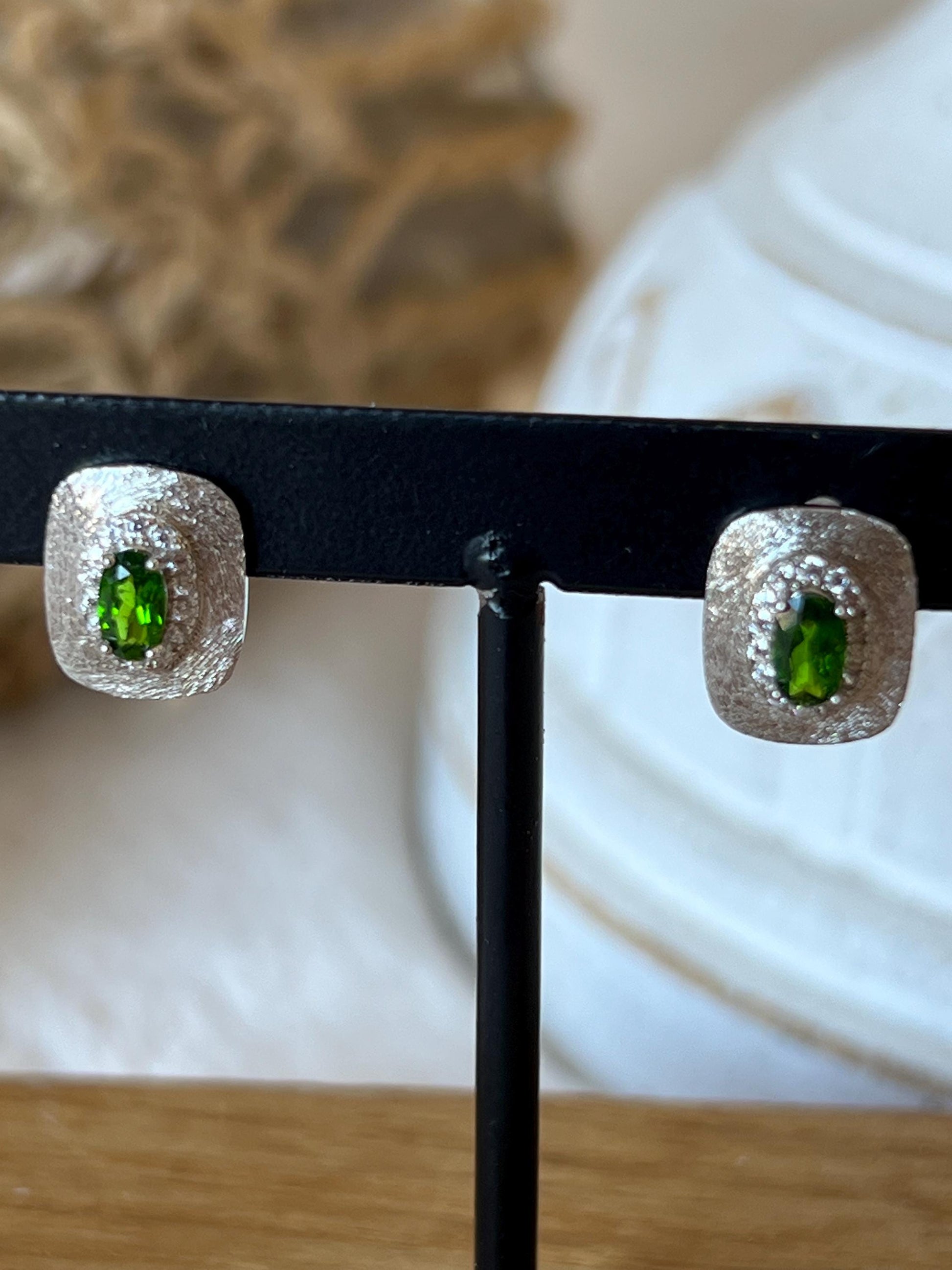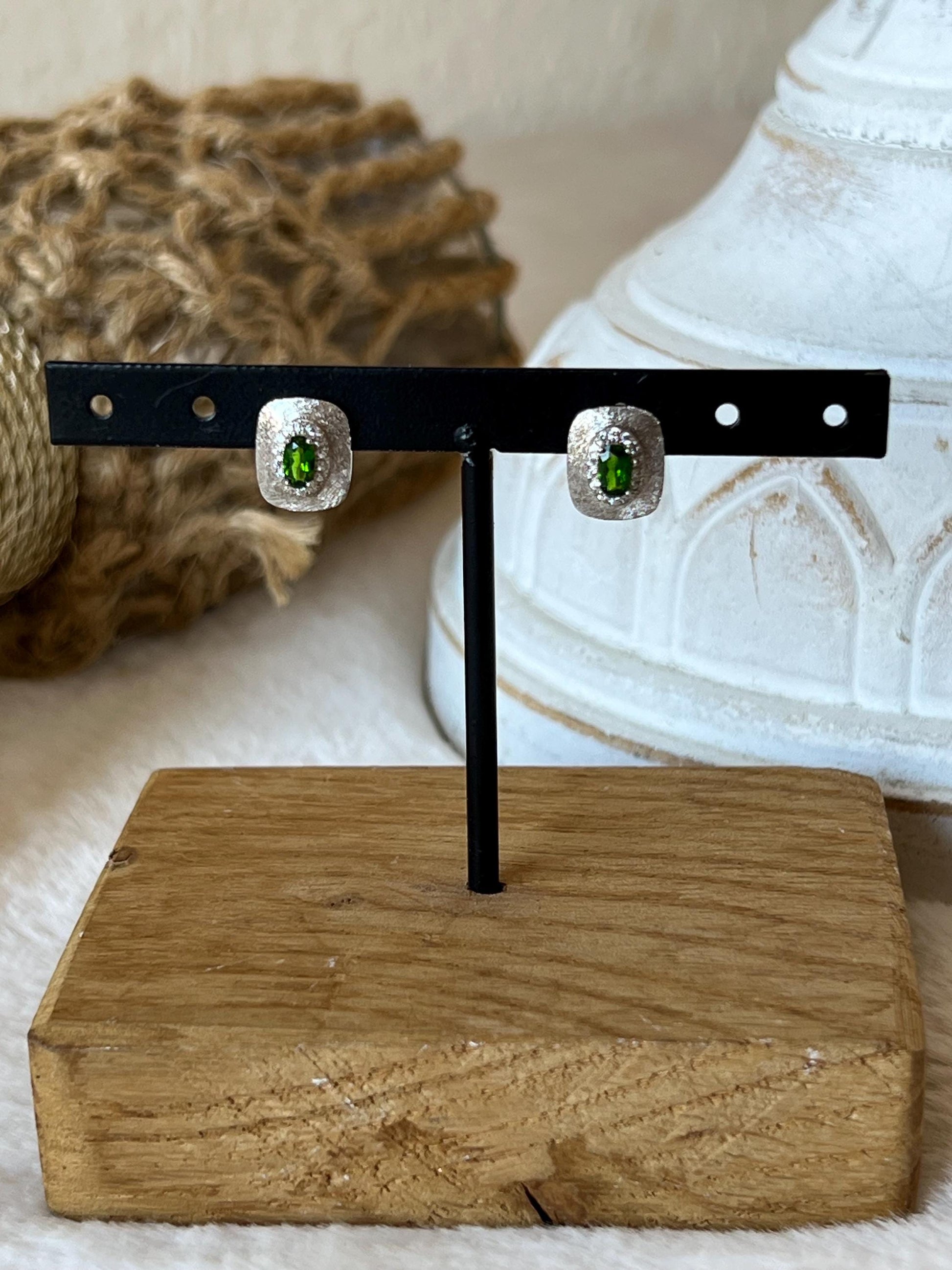 Diese einzigartigen Ohrstecker aus 925 Sterling Silber faszinieren mit ihrer strukturierten, mattierten Oberfläche und dem intensiv grünen Diopsid-Edelstein, der von zarten Akzenten umrahmt wird. Der natürliche Glanz des Diopsids verleiht den Ohrringen eine edle Ausstrahlung, während die kunstvolle Silberverarbeitung ihnen einen modernen und zugleich zeitlosen Look verleiht.