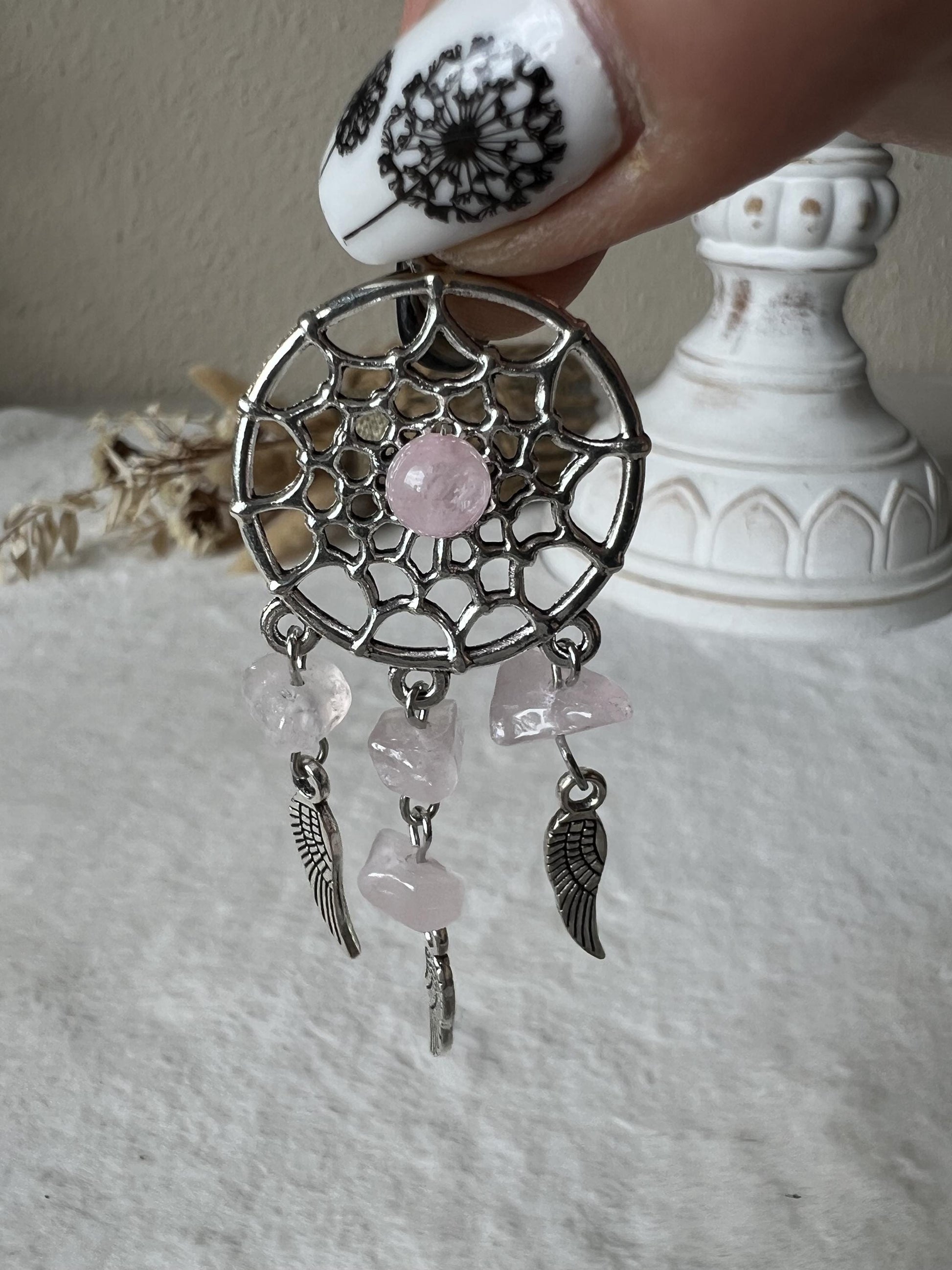 Silberne Edelstein Traumfänger-Schlüsselanhänger mit Rosenquarz, Amethyst, Karneol & Sodalith