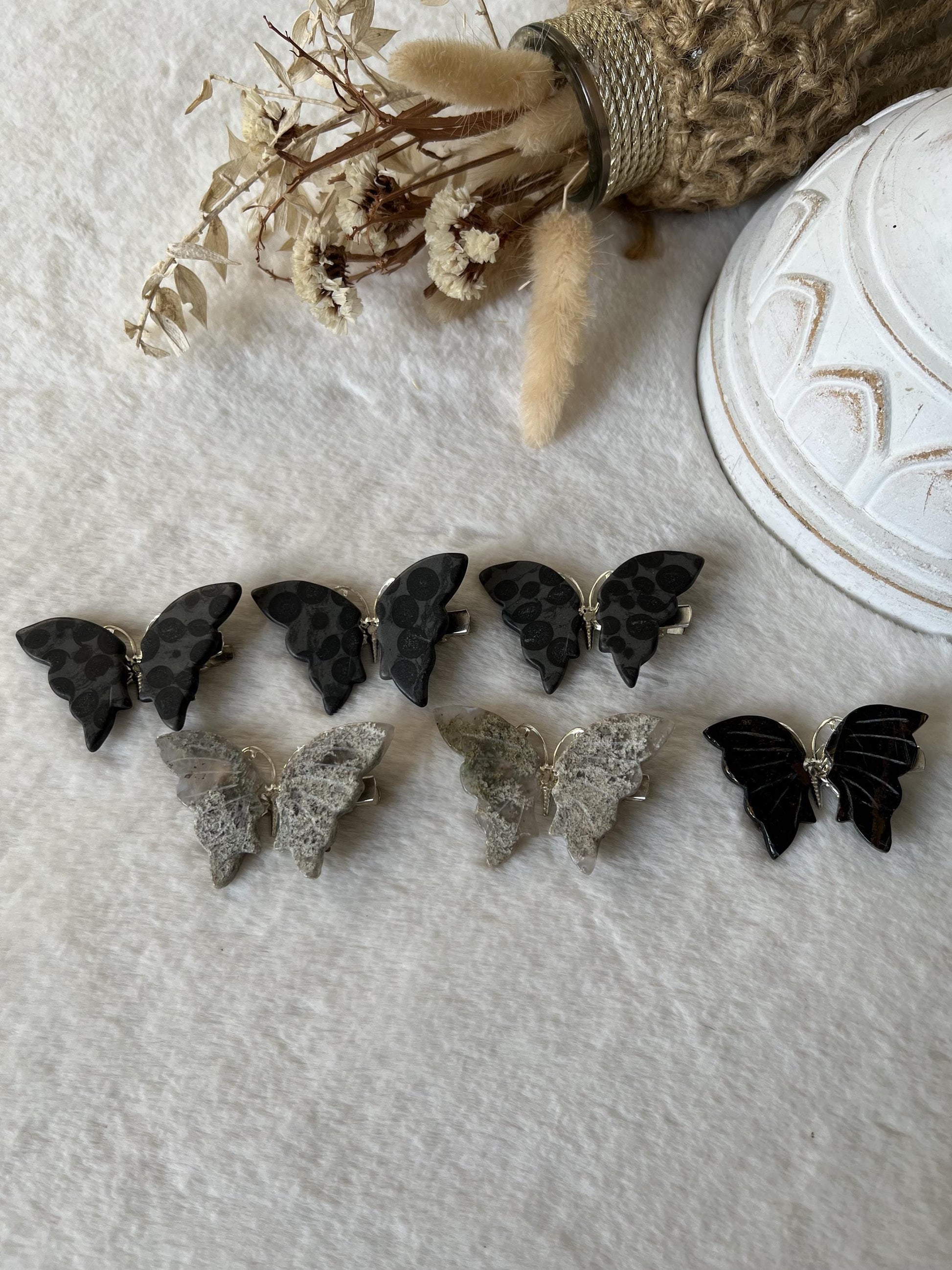 Diese zauberhaften Schmetterling Haarklammern aus echten Edelsteinen verbinden verspielte Eleganz mit der kraftvollen Symbolik der Natur. Jede Klammer ist kunstvoll in Schmetterlingsform gearbeitet und mit einem edlen silberfarbenen Clipverschluss ausgestattet, der einseitig geöffnet wird und sicheren Halt im Haar bietet - ideal für Hochsteckfrisuren, Seitenteile oder als stilvoller Akzent im offenen Haar.