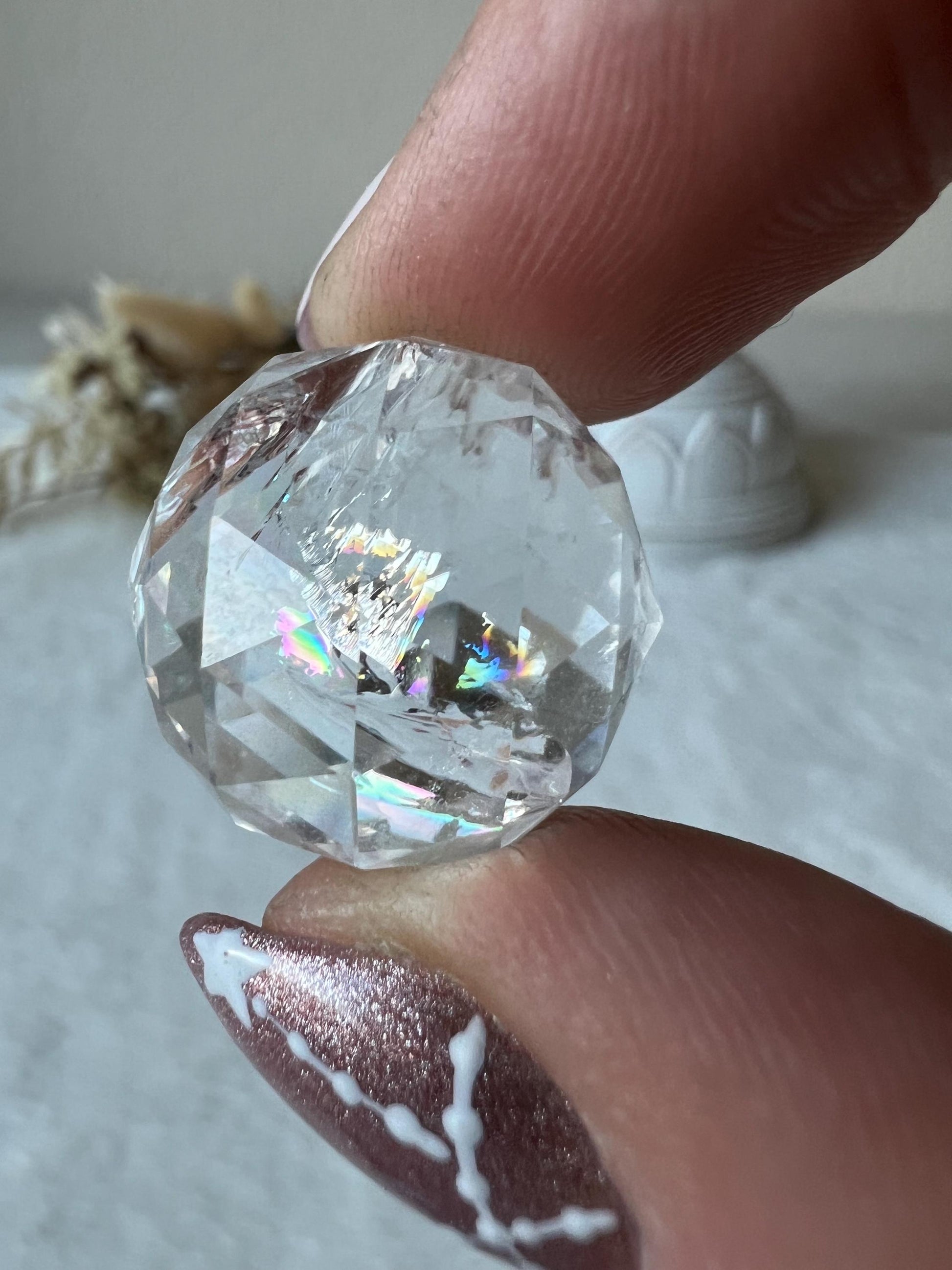 Die facettierte Bergkristall-Kugel ist ein beeindruckendes Kunstwerk, das Reinheit, Klarheit und Eleganz vereint. Bergkristall, bekannt als „Meisterheiler" unter den Kristallen, wird seit Jahrhunderten für seine außergewöhnliche Energie geschätzt. Die facettierte Oberfläche verstärkt das Lichtspiel und bringt die kristallklare Schönheit dieses Steins besonders zur Geltung.