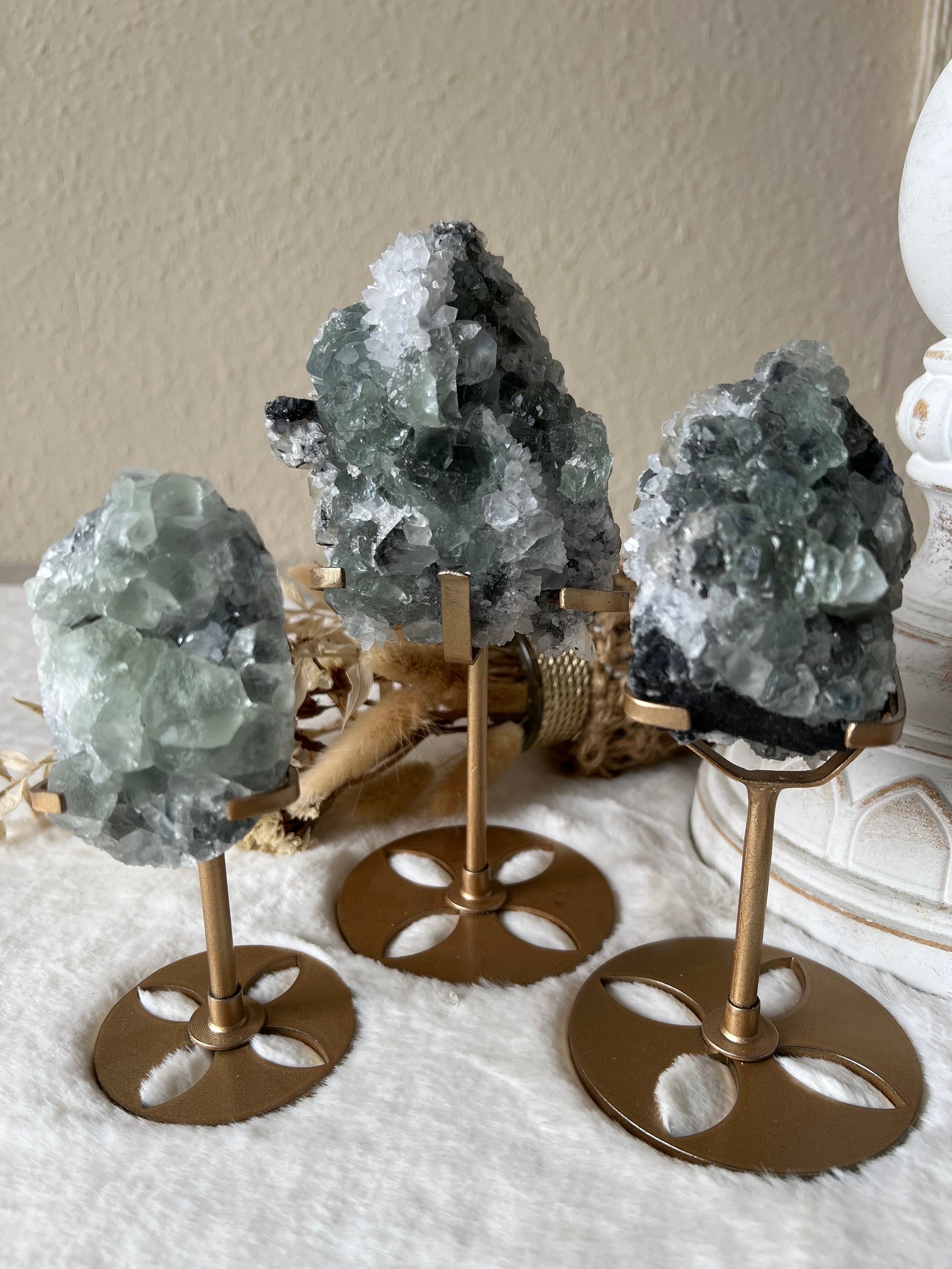 **Grüner Fluorit** wird für seine beruhigende, heilende Energie geschätzt und unterstützt mentale Klarheit und emotionale Heilung. **Calcit** verstärkt und reinigt Energien, fördert inneres Gleichgewicht und löst Blockaden. **Bergkristallspitzen**, als "Meisterheiler", verstärken die Wirkung der anderen Kristalle und fördern geistige Klarheit und Harmonie.