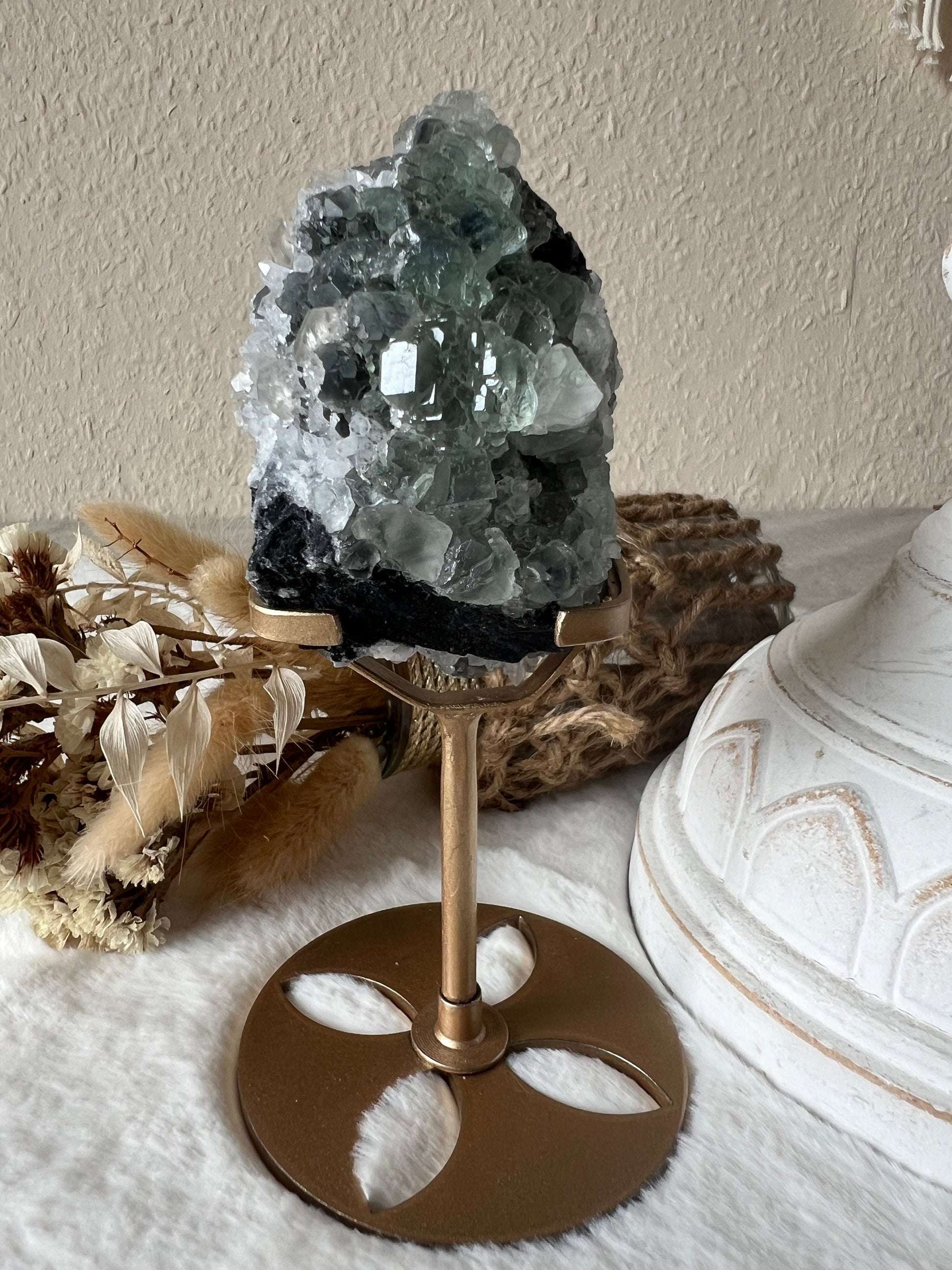 Mit Fluorit, Calcit und Bergkristall in Kombination schaffen diese Mineralien ein harmonisches Energiefeld, das sowohl dekorativ als auch therapeutisch wertvoll ist. Sie können zur Raumreinigung, Meditation und Unterstützung des physischen und emotionalen Wohlbefindens eingesetzt werden, indem sie eine friedliche und heilende Atmosphäre erzeugen.