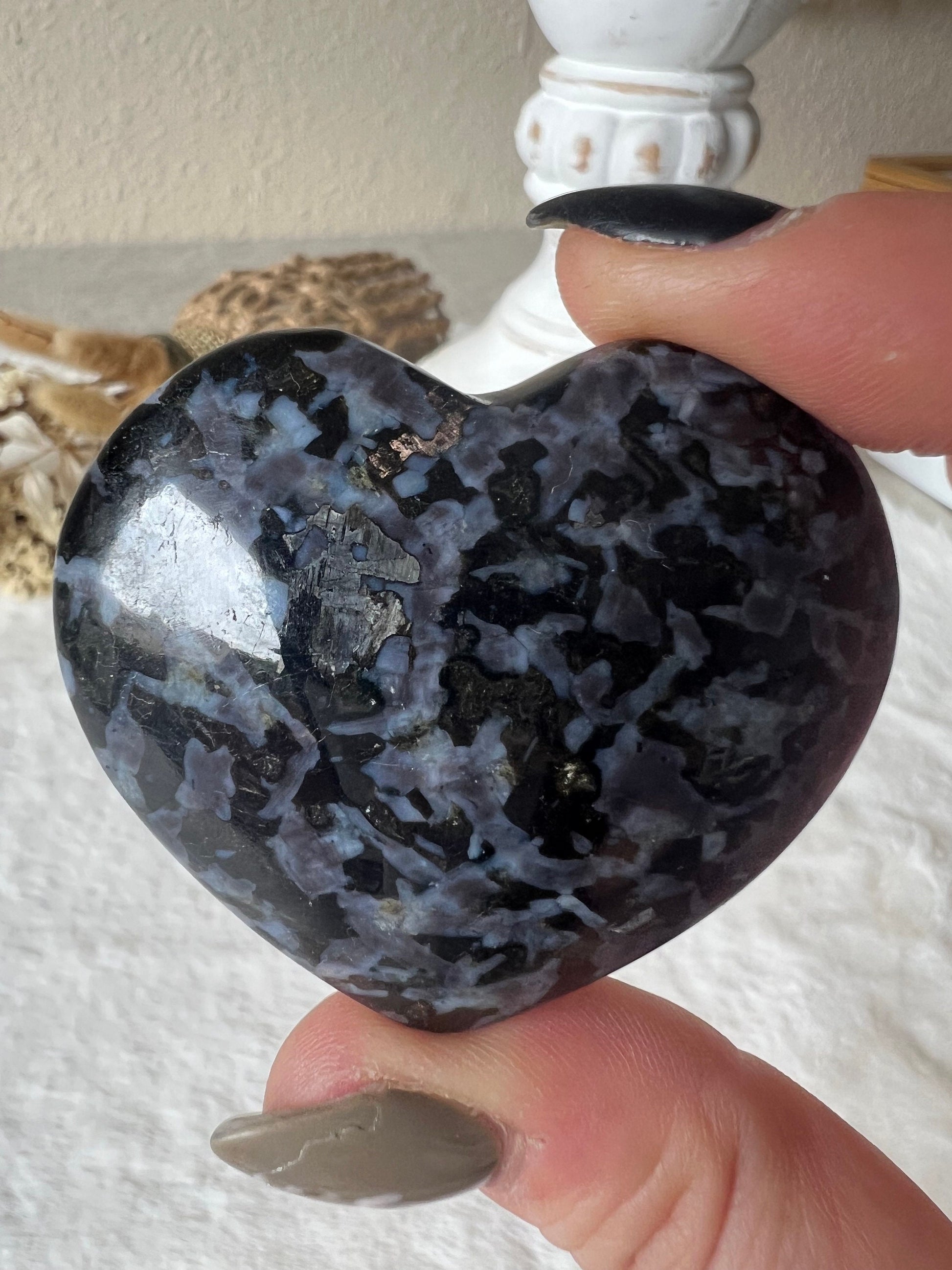 Dieses wunderschöne Gabbro-Herz ist ein einzigartiges Schmuckstück, das sowohl ästhetisch als auch energetisch beeindruckt. Der Gabbro, auch als „Schwarzer Labradorit" bekannt, ist ein faszinierender Stein mit schimmernden, irisierenden Effekten, die ihn besonders lebendig wirken lassen. Das Herzsymbol verstärkt die emotionale Kraft dieses Steins und macht ihn zu einem perfekten Begleiter auf dem Weg zu innerer Heilung und spiritueller Transformation.