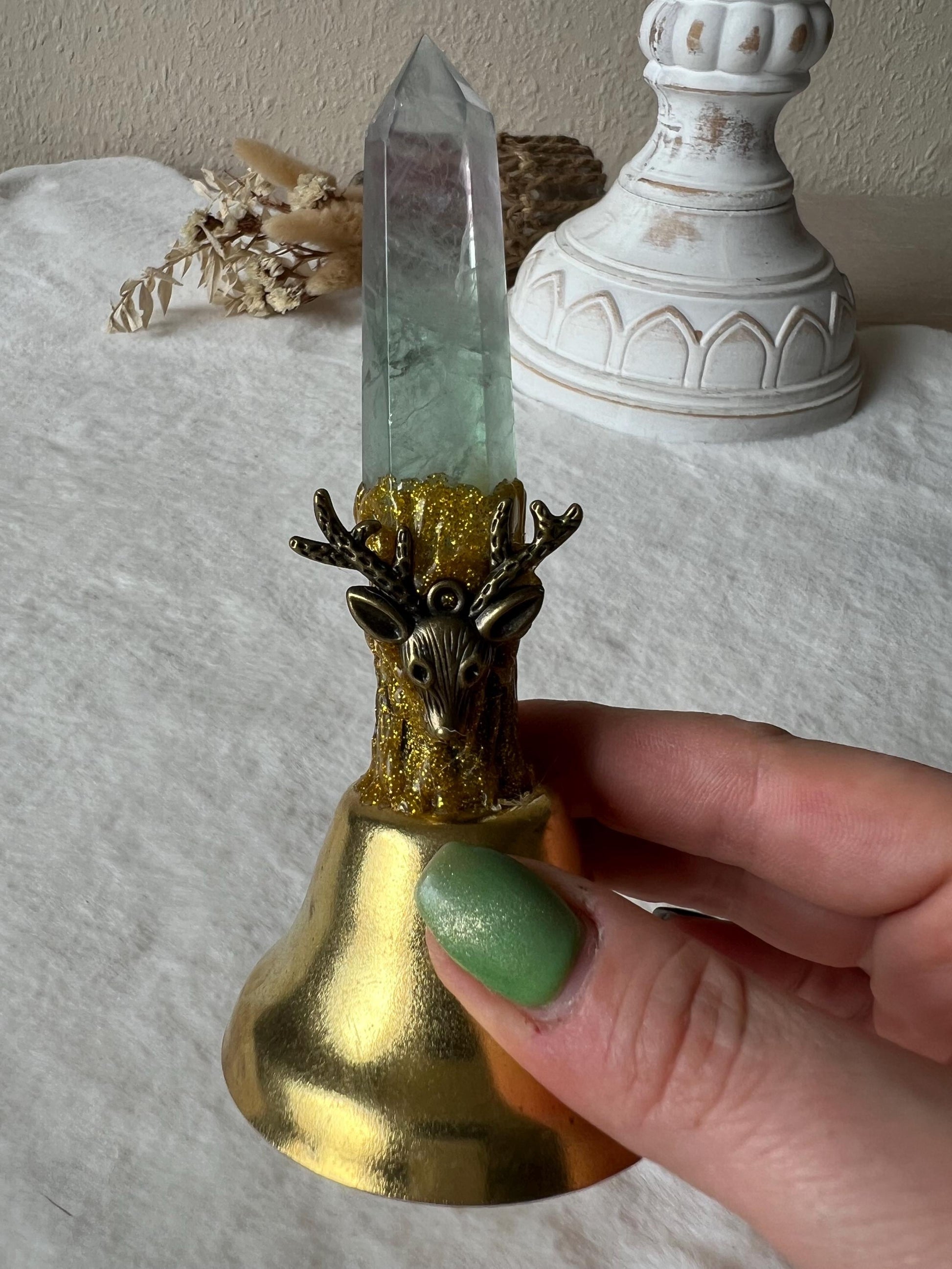 Diese handgefertigten Glocken vereinen kraftvolle Symbolik mit der reinigenden Energie des Klangs. Der Griff besteht aus einem Fluorit-Turm, der Klarheit, Schutz und spirituelle Führung schenkt. Jede Glocke trägt ein einzigartiges Symbol und ist ein besonderes Werkzeug für Rituale, Meditation oder als magisches Dekorationsstück.