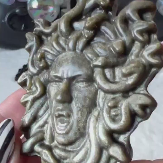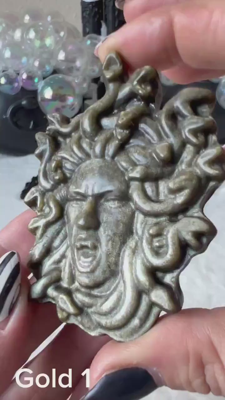 Das Medusa-Gesicht, kunstvoll in Goldschein- und Silberschein-Obsidian eingraviert, ist ein beeindruckendes Symbol, das die geheimnisvolle Kraft und Schönheit der antiken Mythologie einfängt. Medusa, mit ihrem furchterregenden Blick und den Schlangen, die ihr Haar bilden, verkörpert sowohl Schutz als auch Transformation. In vielen spirituellen Traditionen gilt sie als Wächterin und Hüterin, die das Böse abwehrt und diejenigen schützt, die sich ihrer Macht bewusst sind.