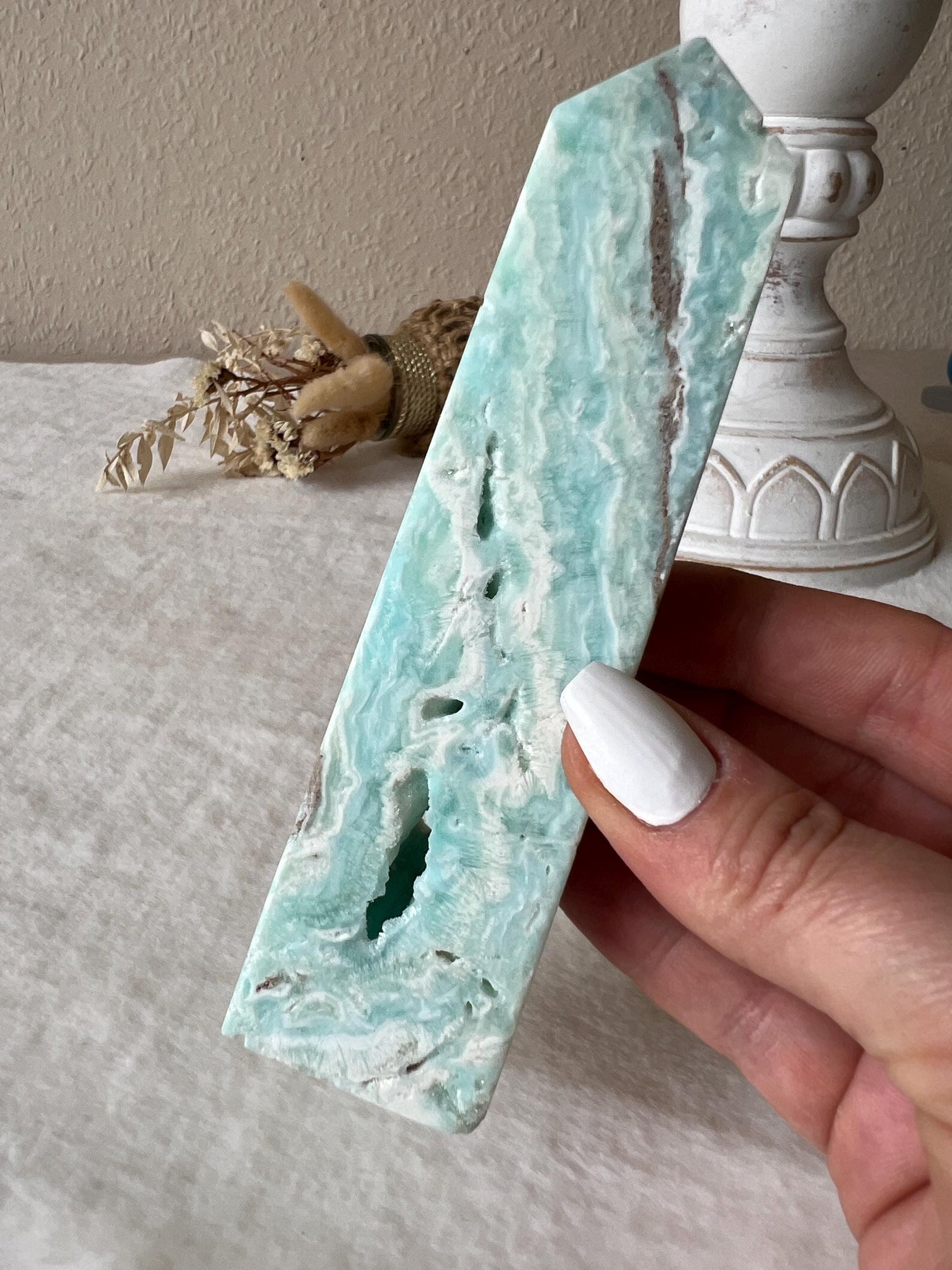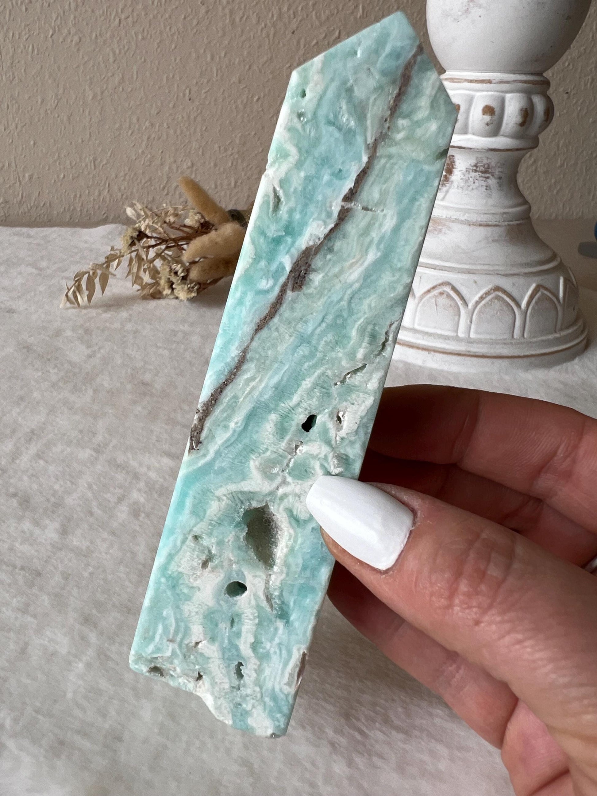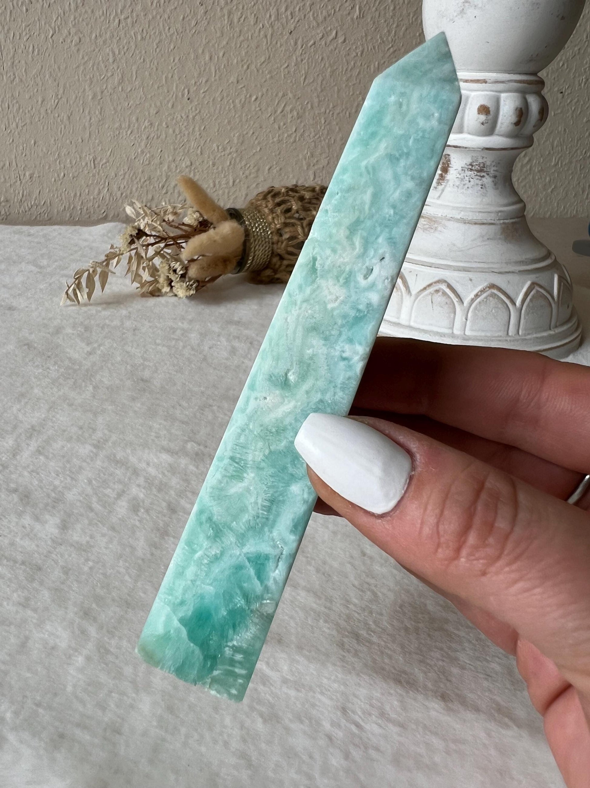 Tauche ein in die beruhigende Energie des Meeres mit unserem Karibischen Calcit Turm in High Quality. Dieser außergewöhnliche Kristall vereint die Farben von türkisblauem Wasser und weißen Sandstränden und bringt die pure Essenz tropischer Inseln direkt in dein Zuhause.