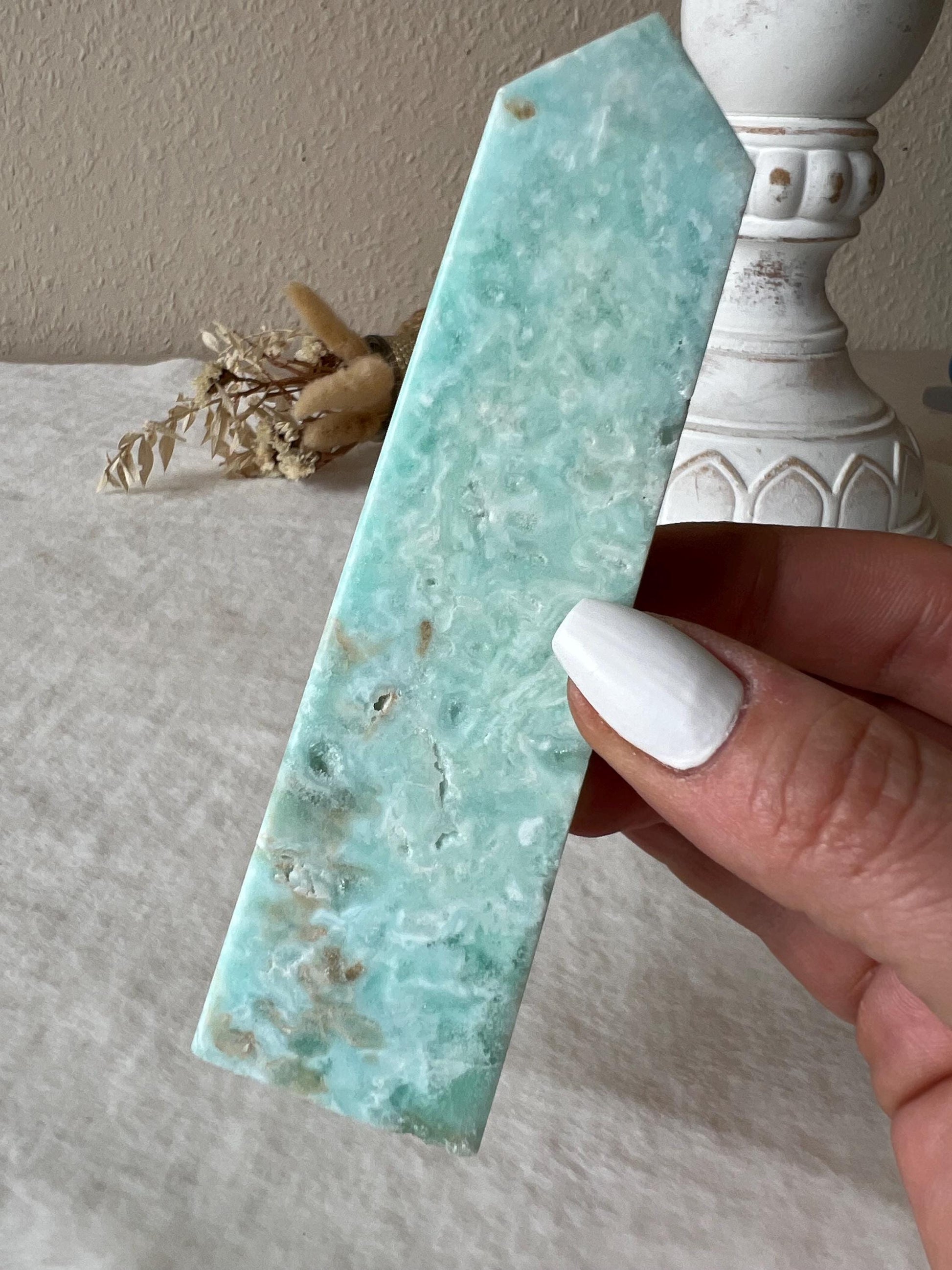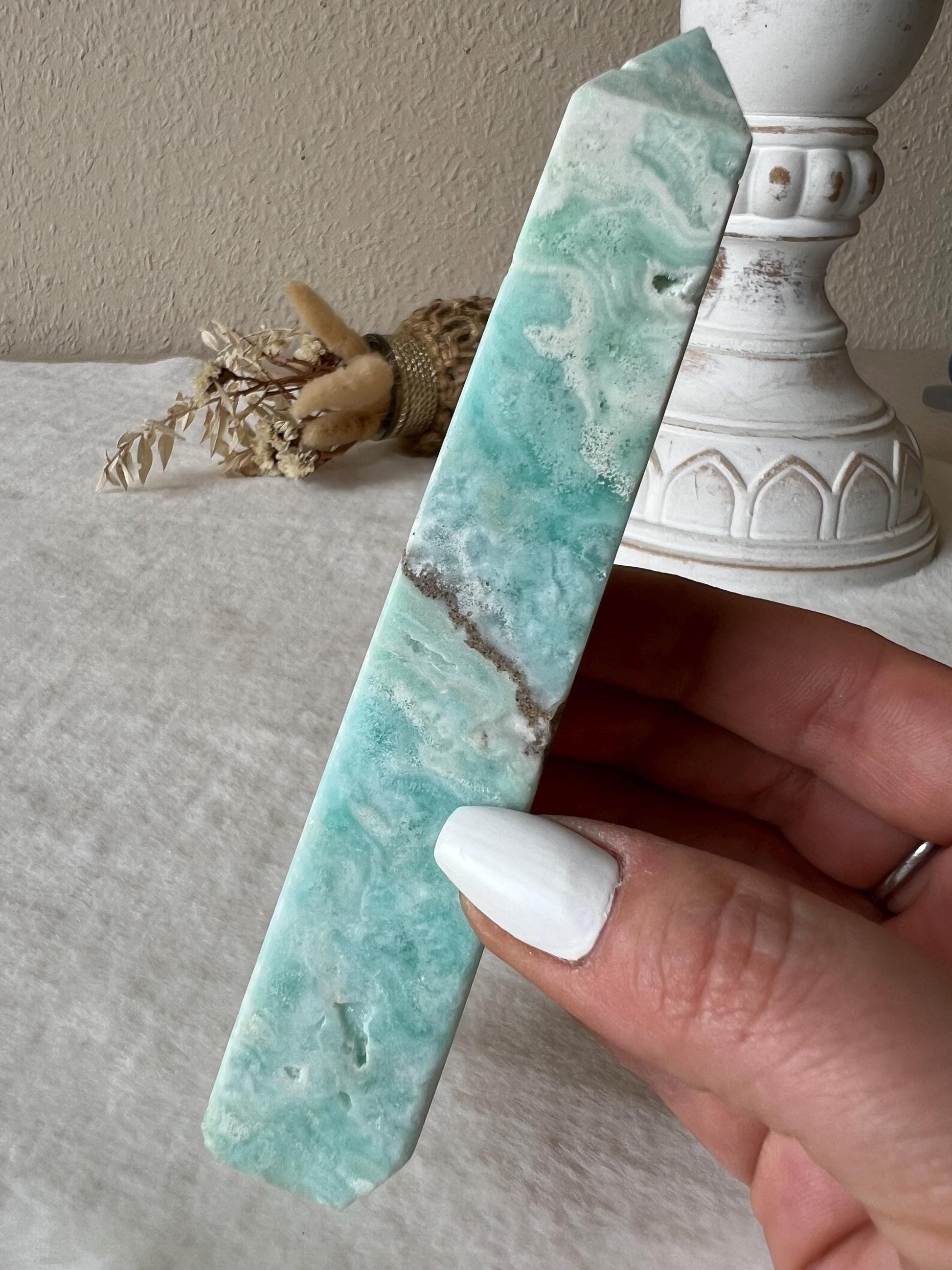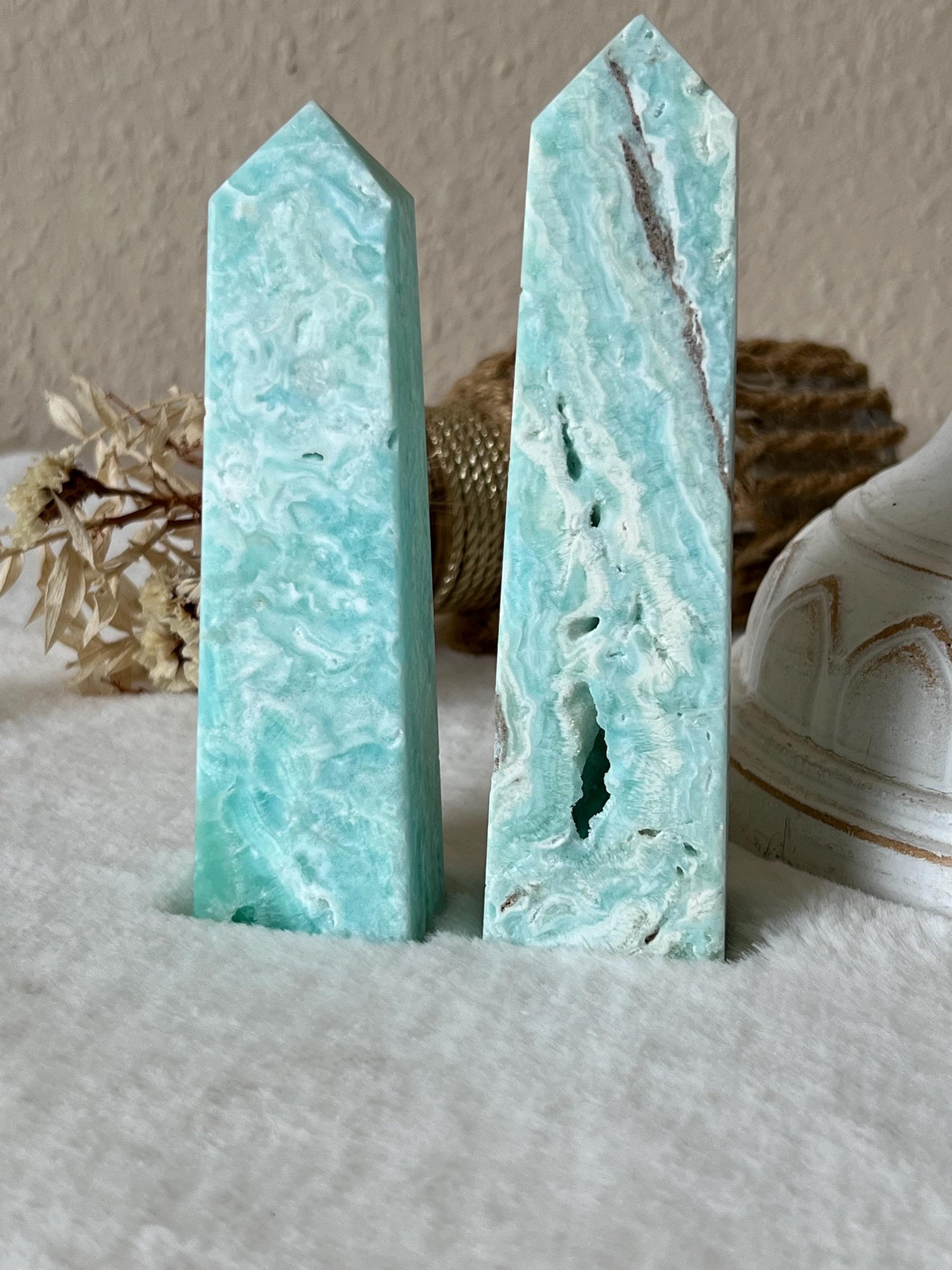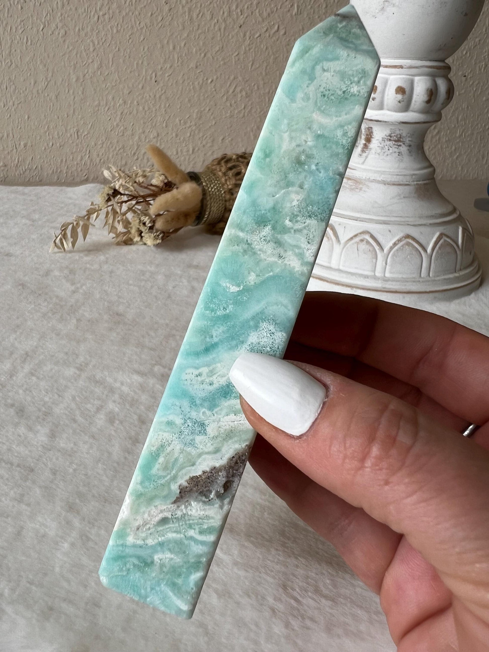Tauche ein in die beruhigende Energie des Meeres mit unserem Karibischen Calcit Turm in High Quality. Dieser außergewöhnliche Kristall vereint die Farben von türkisblauem Wasser und weißen Sandstränden und bringt die pure Essenz tropischer Inseln direkt in dein Zuhause.