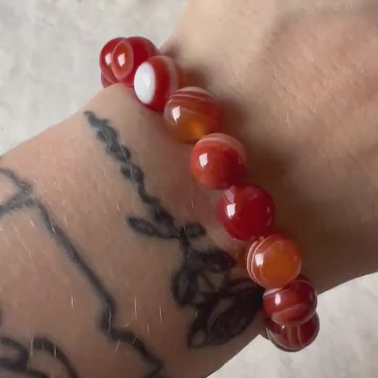 Dieses Armband kombiniert die natürliche Schönheit des Karneols mit einer besonderen optischen Tiefe, die durch die einzigartigen Bänderungen entsteht. Es ist ein Schmuckstück, das sowohl Energie ausstrahlt als auch stilvolle Eleganz verkörpert - perfekt, um jedem Outfit eine warme, kraftvolle Note zu verleihen.