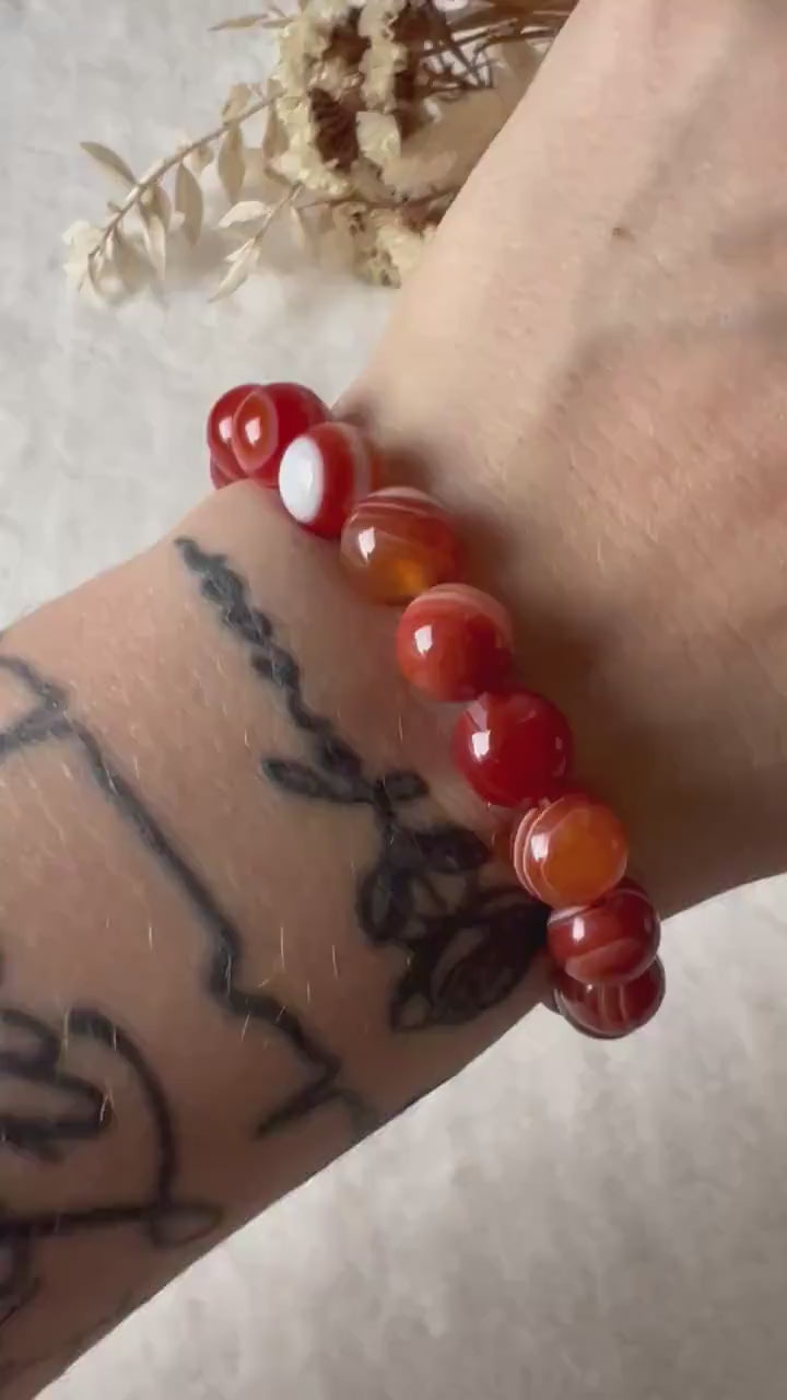 Karneol wird seit der Antike als Stein der Vitalität, des Mutes und der Lebensfreude geschätzt. Er soll das Selbstvertrauen stärken und Motivation fördern. Die Bänderungen im Karneol symbolisieren den Fluss der Energie und die Verbindung zwischen Stabilität und Bewegung, was das Armband zu einem idealen Begleiter für Menschen macht, die nach innerer Stärke und Inspiration suchen.