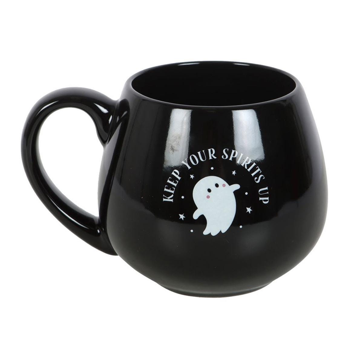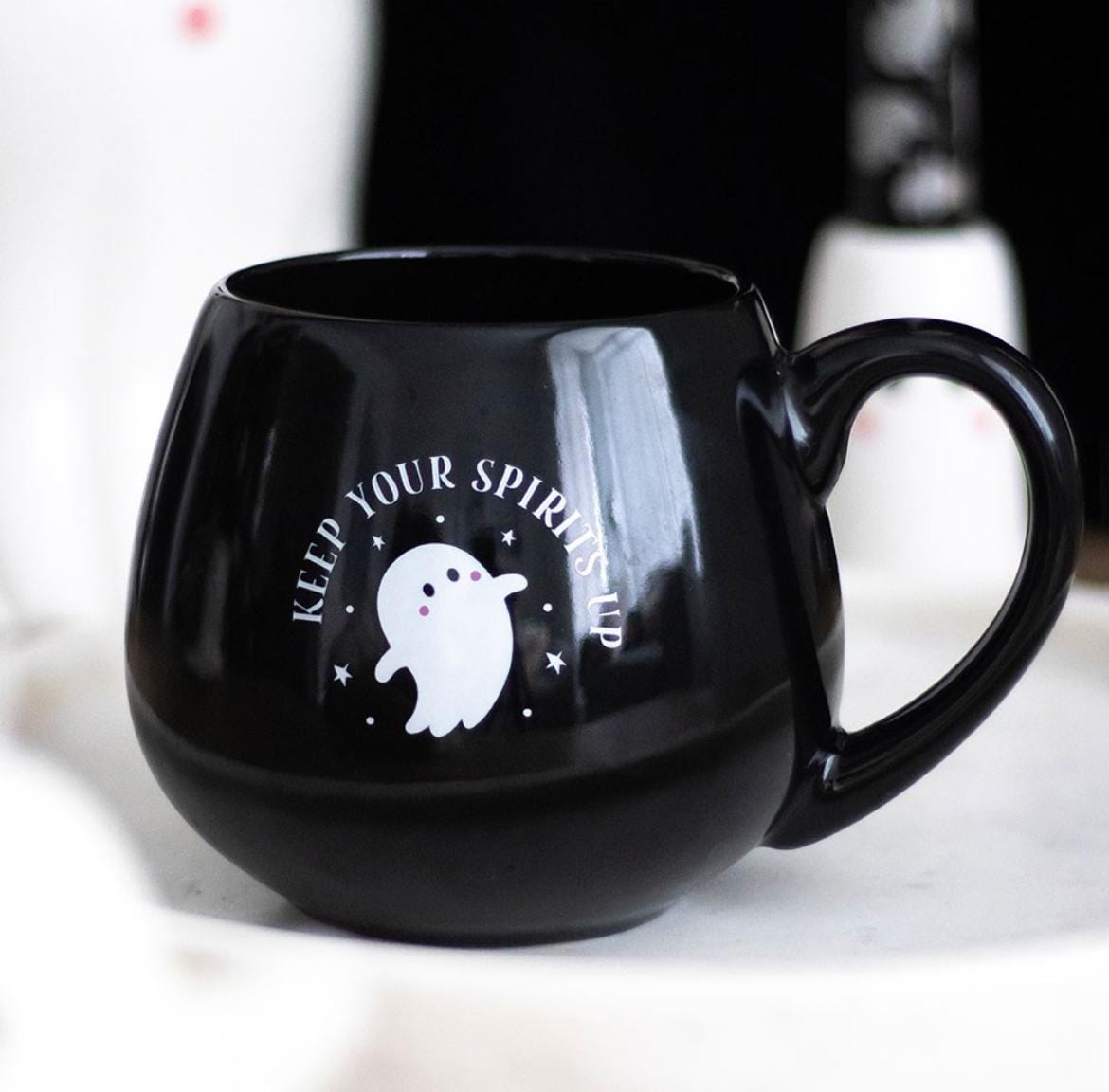 Diese runde Keramiktasse sorgt garantiert für gute Laune - selbst an grauen Tagen. Mit ihrem süßen Geister-Design und dem motivierenden Schriftzug „Keep Your Spirits Up" ist sie der perfekte Begleiter für gemütliche Herbstabende, kalte Halloween-Nächte oder einfach für deinen täglichen Kaffee- oder Tee-Moment.