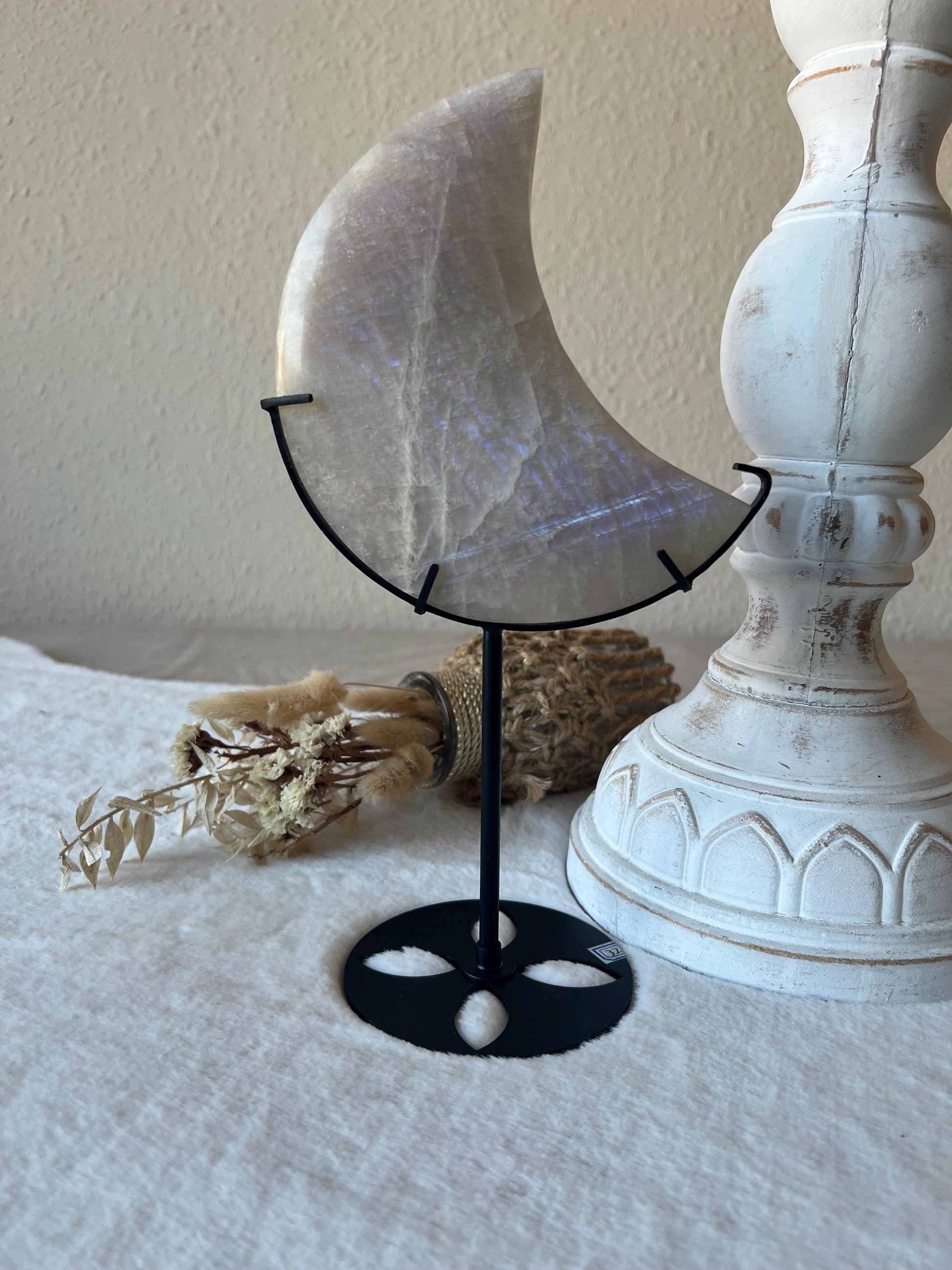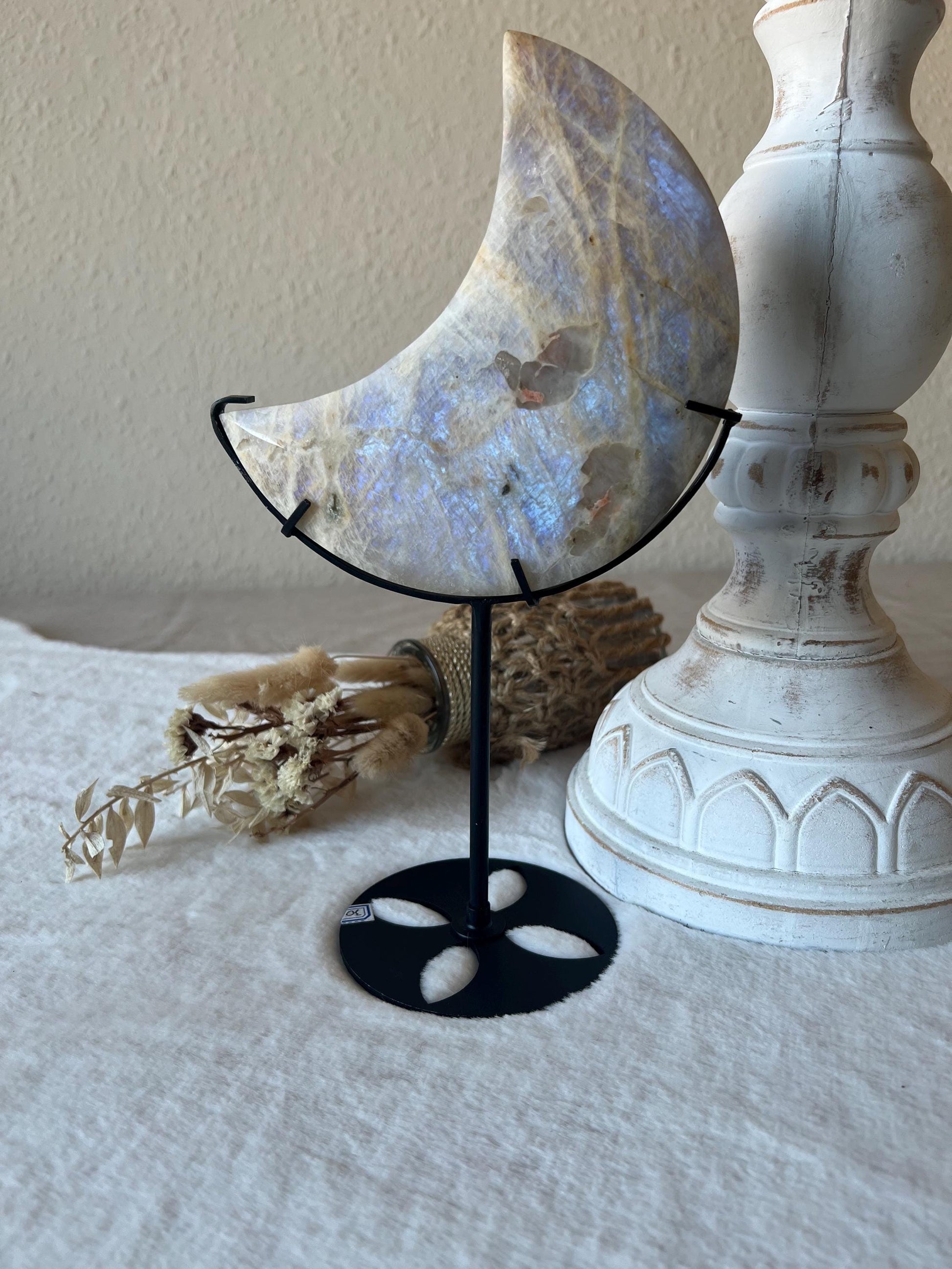 Große Mondstein Monde auf schwarzem Halter - Sanftes Leuchten & weibliche Intuition in vollendeter Form