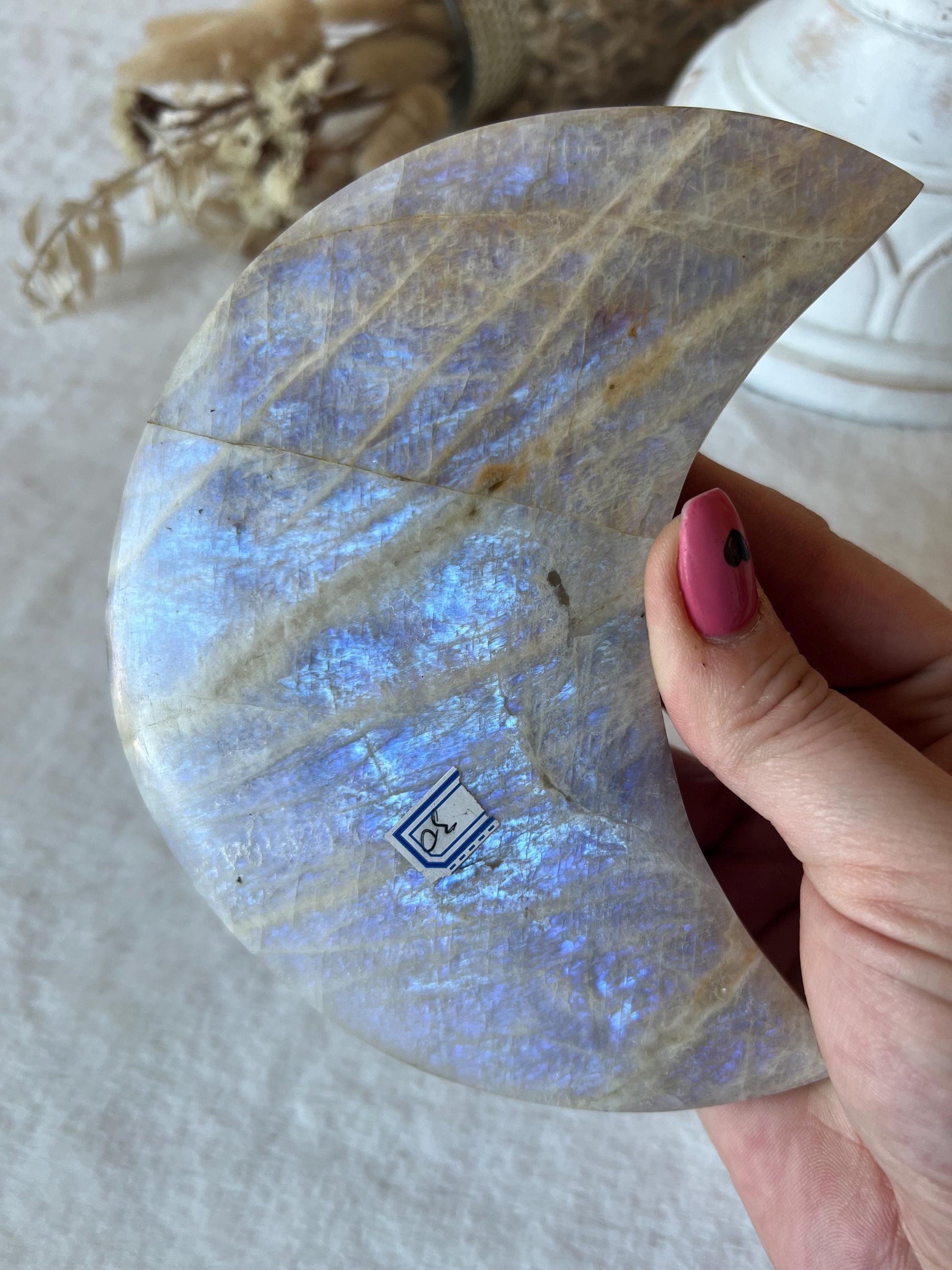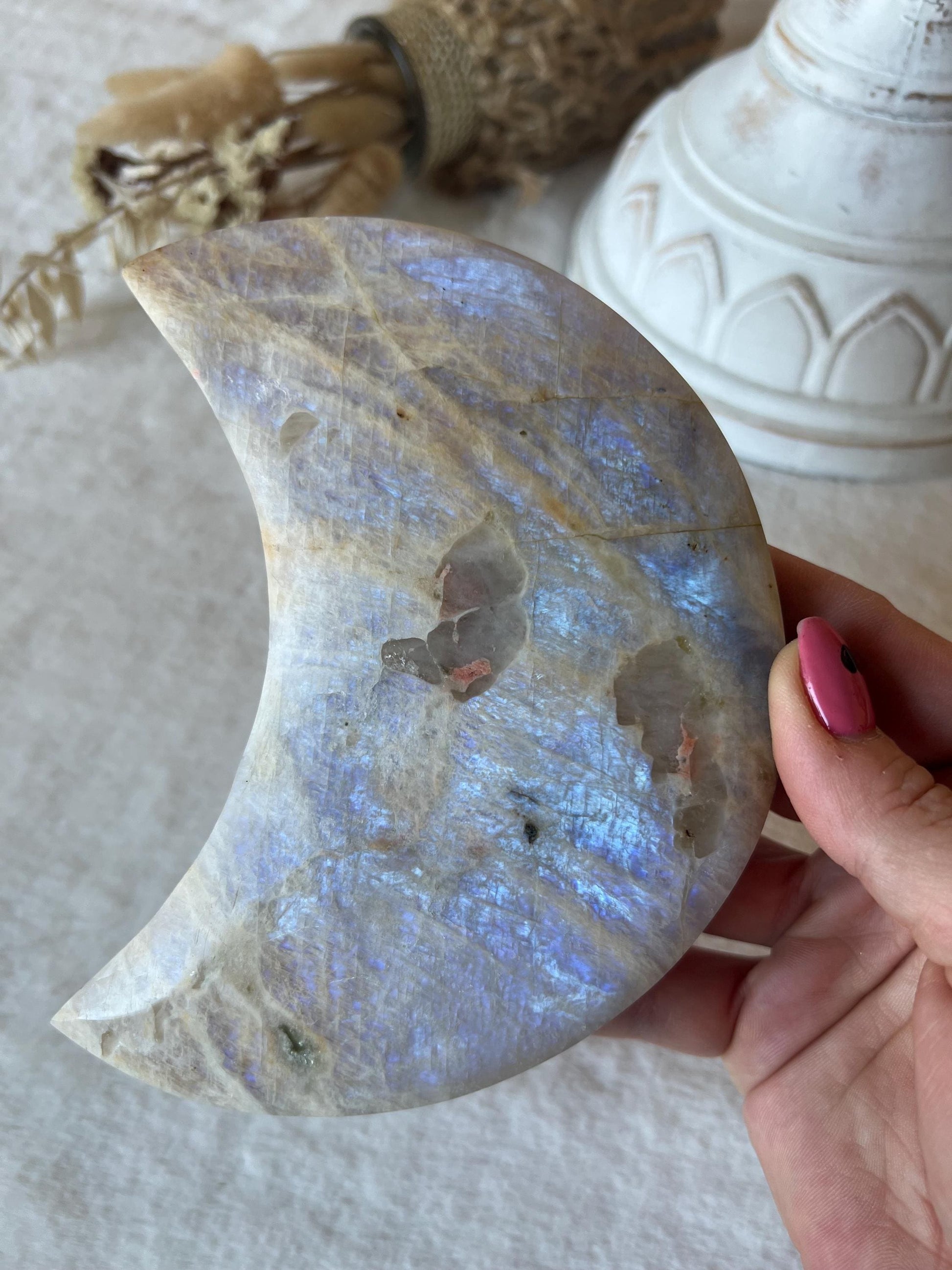 Diese eindrucksvollen Monde aus echtem weißem Mondstein strahlen eine sanfte, geheimnisvolle Energie aus. In ihrer schimmernden Oberfläche spiegelt sich das Licht wie silberner Nebel auf ruhigem Wasser - ein faszinierendes Spiel aus Zartheit und Tiefe. Gehalten werden sie von einem schlichten, schwarzen Halter, der das elegante Leuchten des Mondsteins perfekt in Szene setzt und gleichzeitig für Stabilität sorgt.