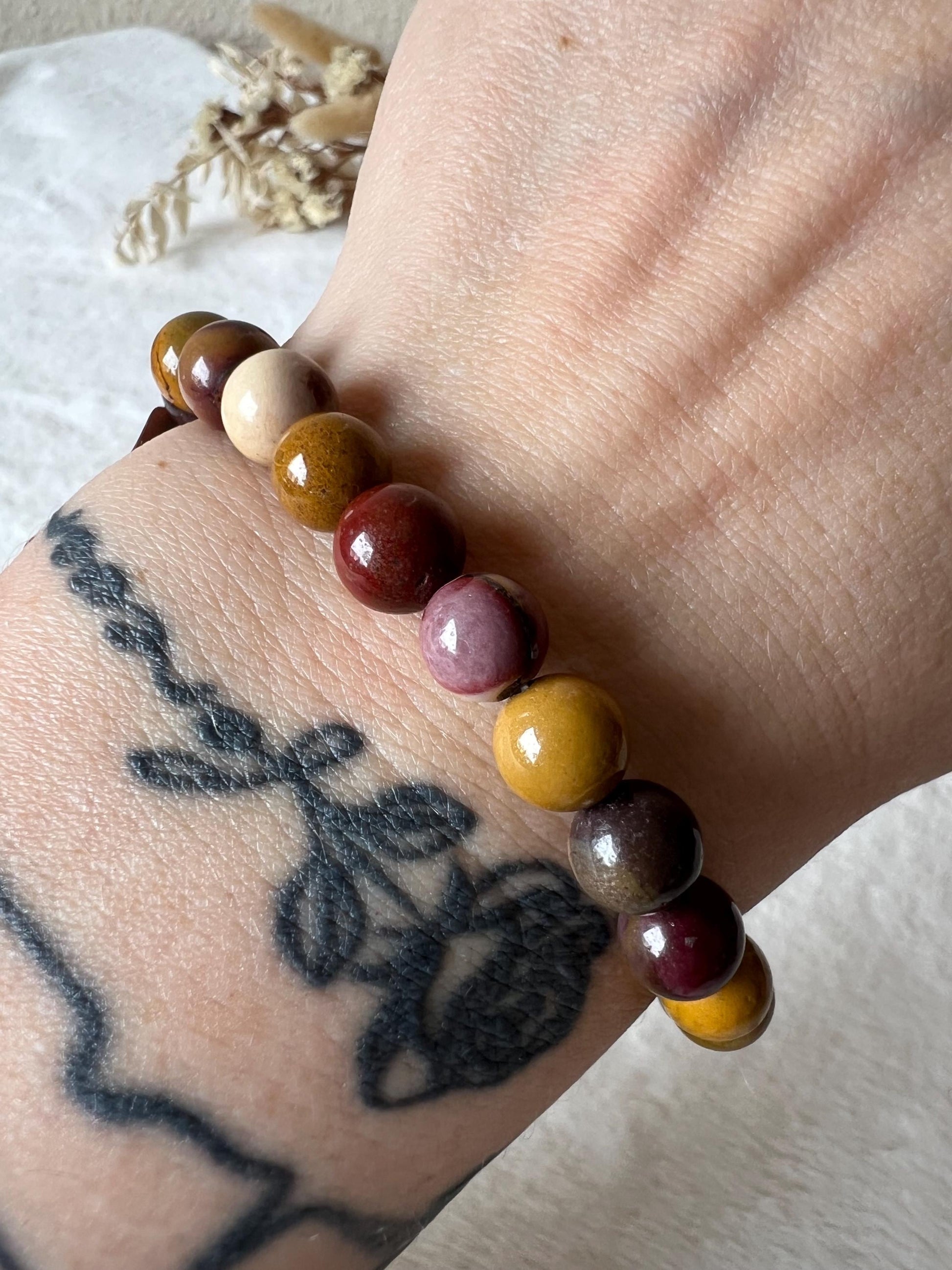 Dieses wunderschöne Mookait Armband besteht aus 8mm Perlen des einzigartigen Mookait-Jaspis, einem Edelstein, der für seine warme Farbpalette bekannt ist - von tiefem Rot und Gelb bis hin zu sanften Brauntönen. Mookait ist ein kraftvoller Stein, der für seine Fähigkeit geschätzt wird, Stabilität und Ausgeglichenheit zu fördern. Er unterstützt dabei, neue Perspektiven zu gewinnen und die eigene innere Stärke zu entfalten.