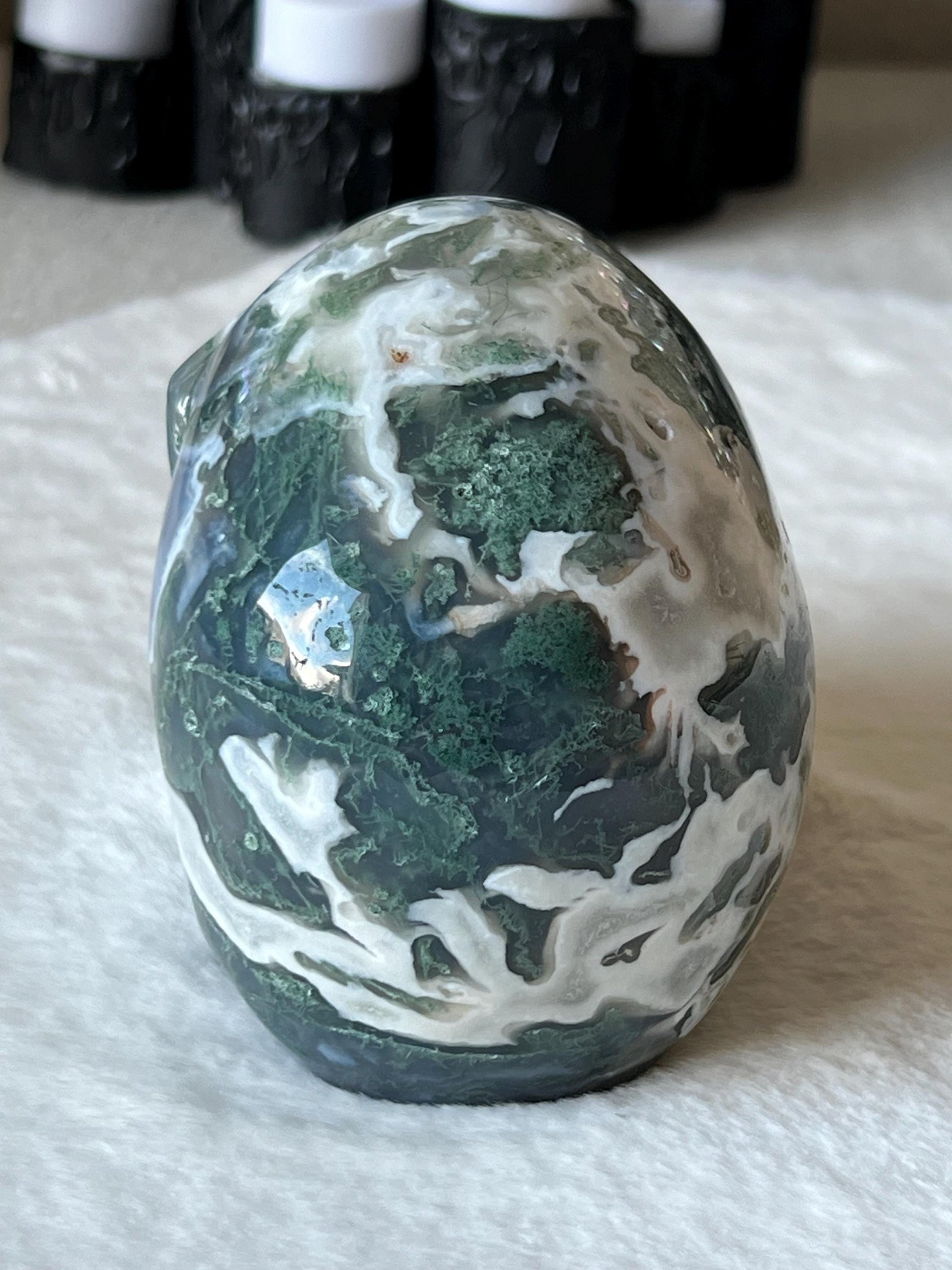 3. Förderung von Kreativität und Wachstumsprozessen: Die natürlichen, moosartigen Einschlüsse des Moosachats stehen in direkter Verbindung zur Natur und ihrem ständigen Wachstum. Der Stein wird oft als Unterstützer für Menschen angesehen, die sich in einer Phase des persönlichen Wachstums oder der spirituellen Transformation befinden.