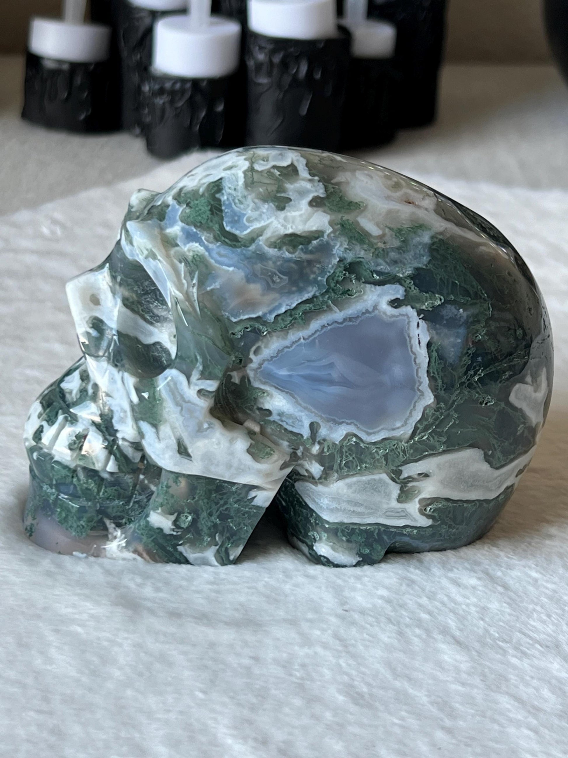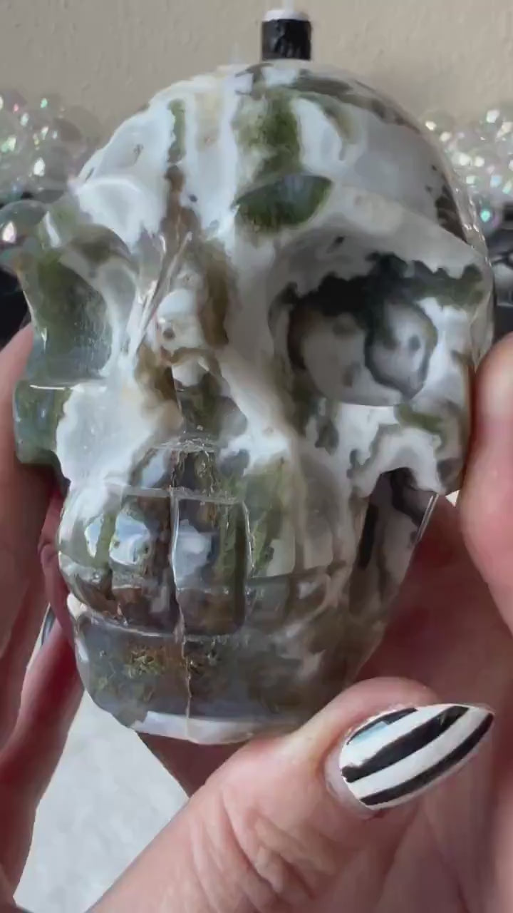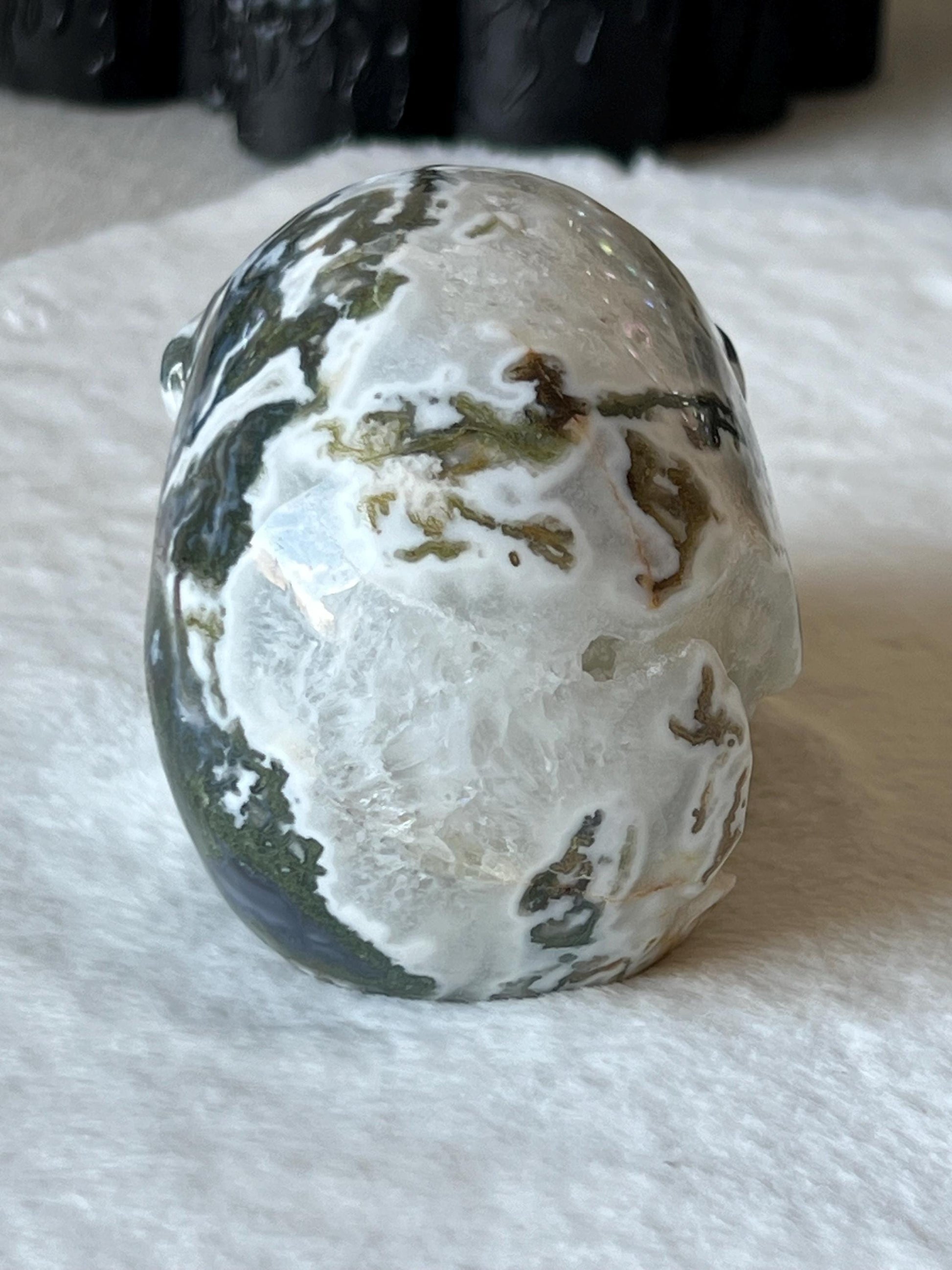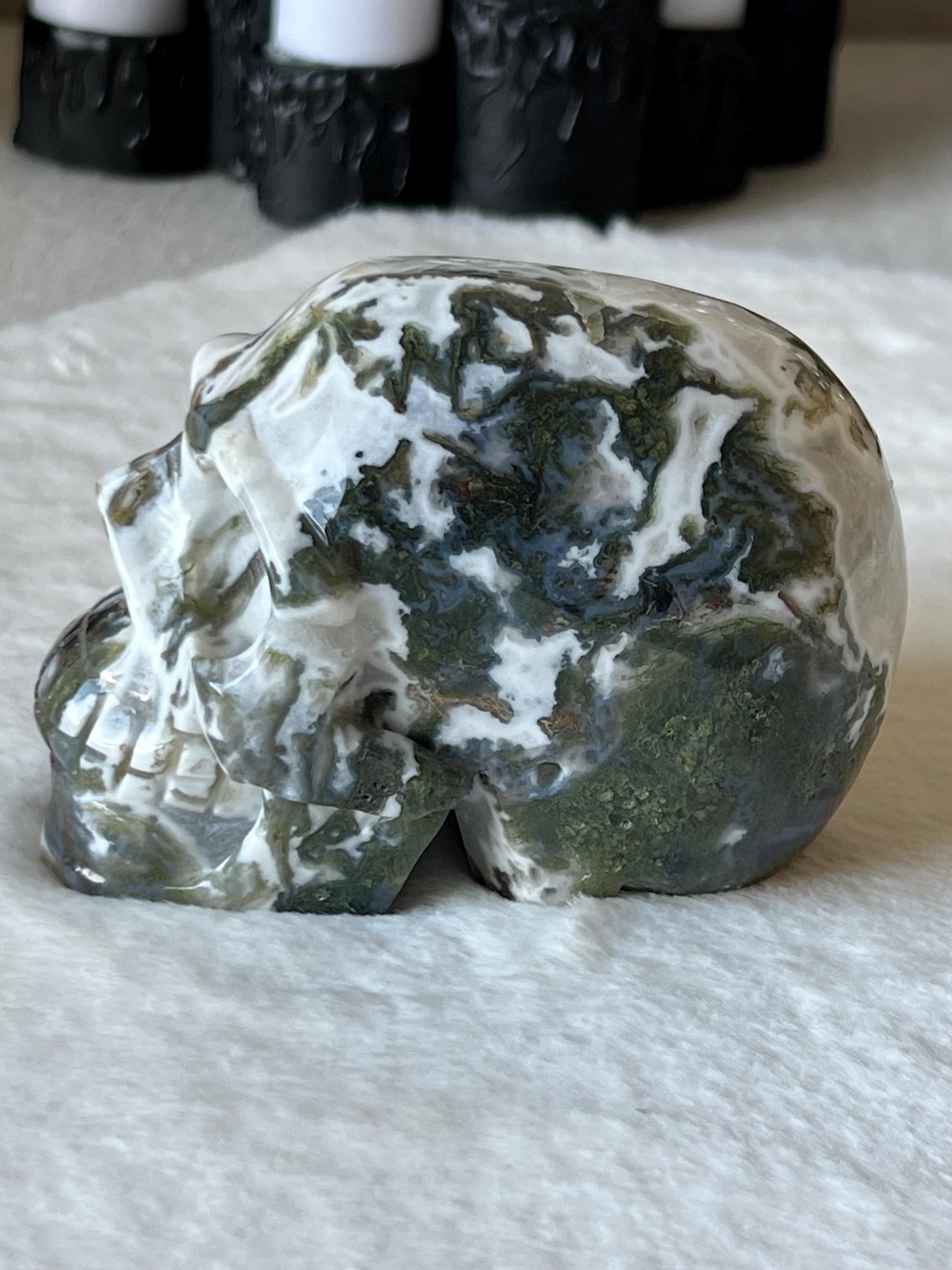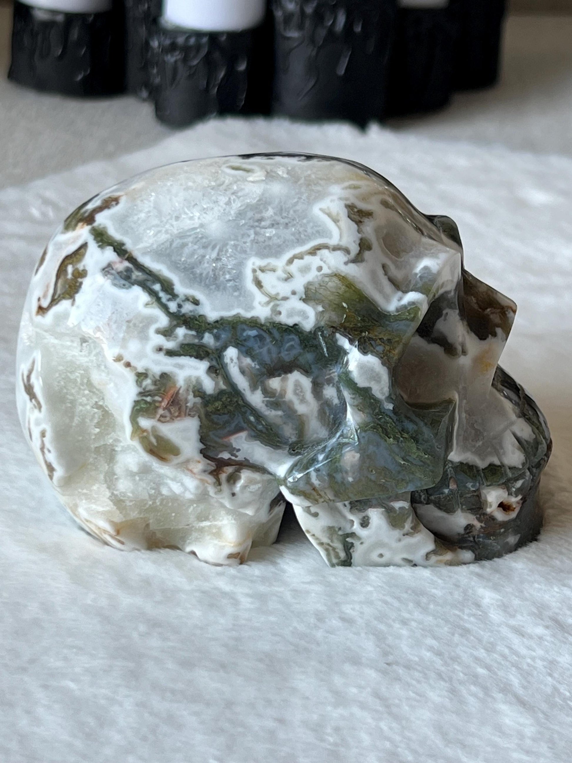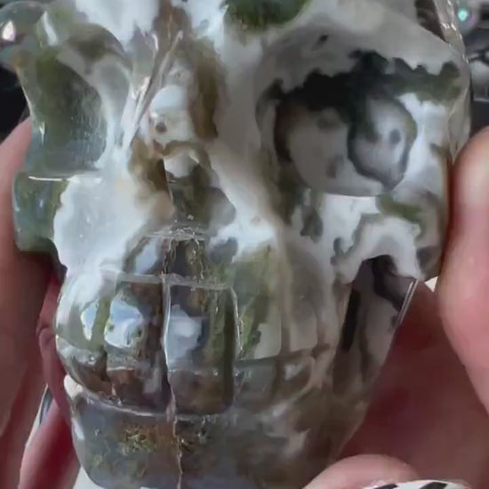Moosachat Schädel sind faszinierende Edelsteinkunstwerke, die sowohl ästhetisch als auch spirituell von Bedeutung sind. Der Moosachat, eine Varietät des Chalcedons, ist bekannt für seine grünlichen Einschlüsse, die an Moos oder Pflanzen erinnern und ihm ein unverwechselbares, erdverbundenes Aussehen verleihen.