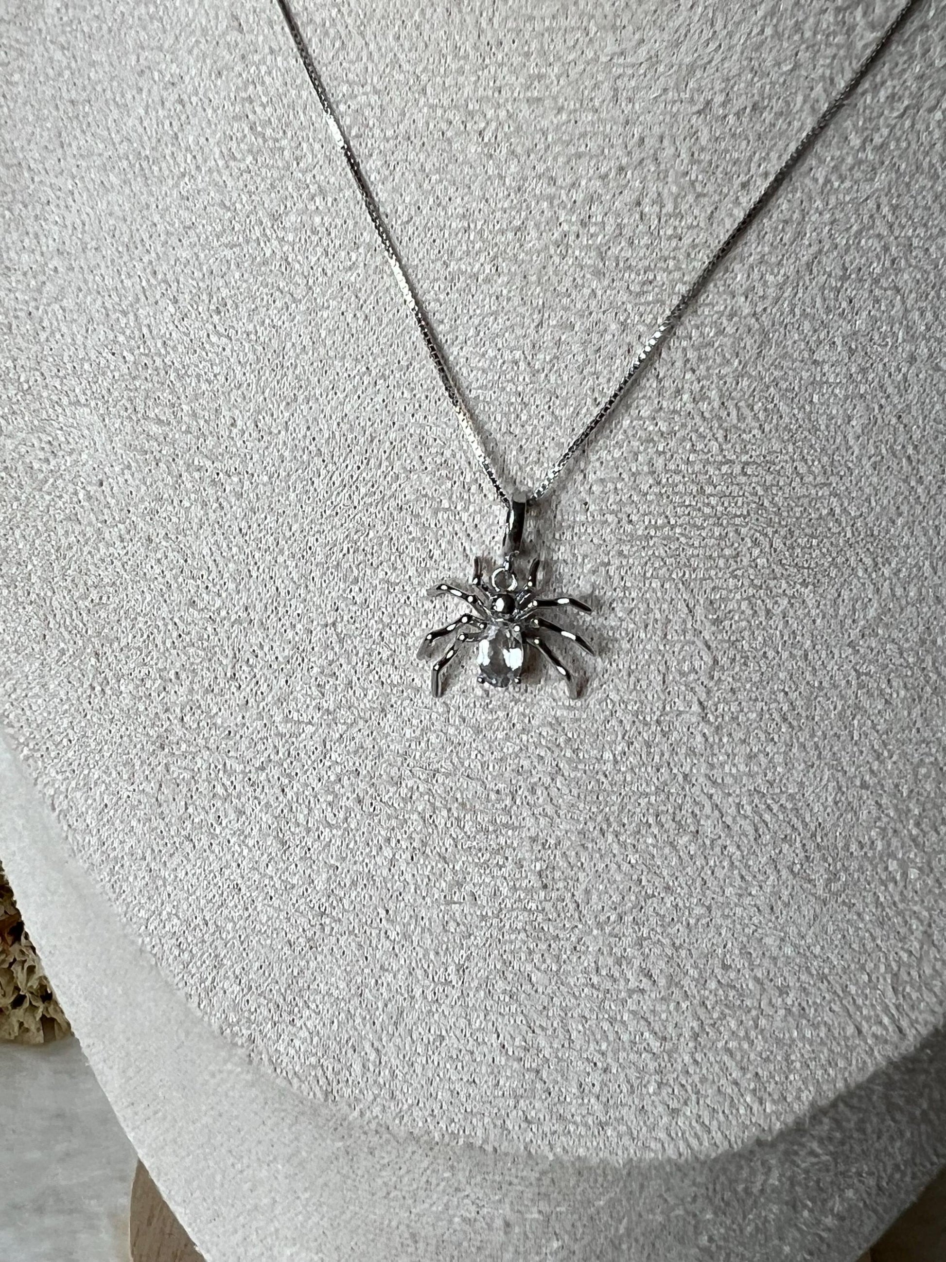 Die zweite Variation präsentiert einen Spinnenkörper aus klarem Bergkristall. Bergkristall gilt als einer der stärksten Heilsteine und ist bekannt für seine Fähigkeit, Energie zu verstärken und Klarheit zu bringen. Der transparente Stein lässt Licht durchscheinen und sorgt für eine strahlende Eleganz. Bergkristall wird oft zur Harmonisierung von Körper und Geist verwendet und soll die Intuition fördern. Dieser Anhänger ist ideal für Menschen, die auf der Suche nach innerer Balance und spiritueller Klarheit sind und die Kraft der natürlichen Elemente in ihrem Leben nutzen möchten.