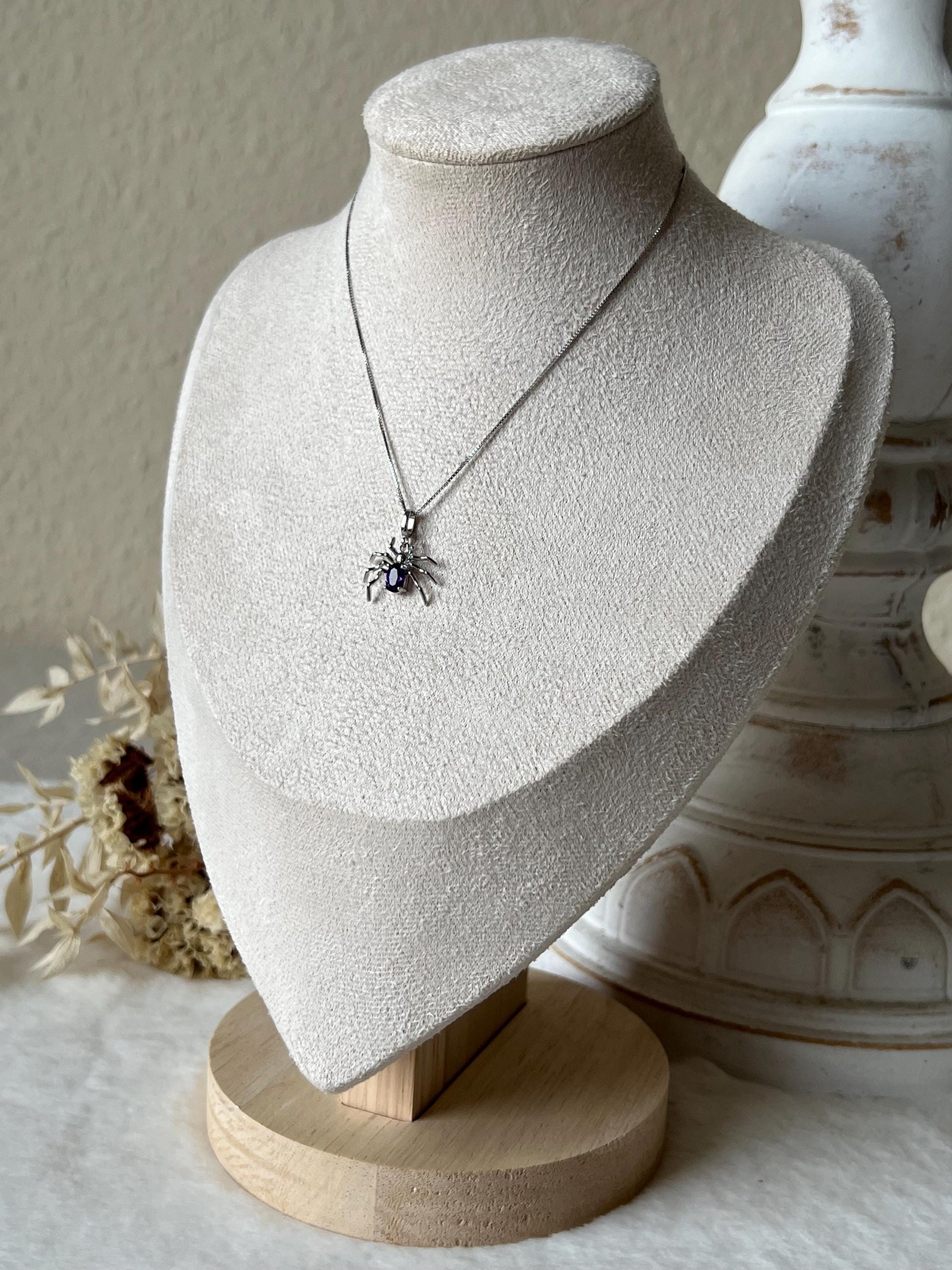 Die dritte Variation zeigt die Spinne mit einem Körper aus tiefviolettem Amethyst. Dieser Edelstein ist bekannt für seine beruhigende Wirkung und seine Fähigkeit, die spirituelle Wahrnehmung zu fördern. Amethyst wird oft als Stein der Transformation bezeichnet und soll helfen, emotionale Blockaden zu lösen und den Geist zu beruhigen. Sein reicher Farbton verleiht dem Anhänger eine luxuriöse Ausstrahlung und macht ihn zu einem idealen Schmuckstück für besondere Anlässe. Der Spinnen-Anhänger aus Amethyst ist perfekt für diejenigen, die nach innerem Frieden streben und ihre Intuition stärken möchten.