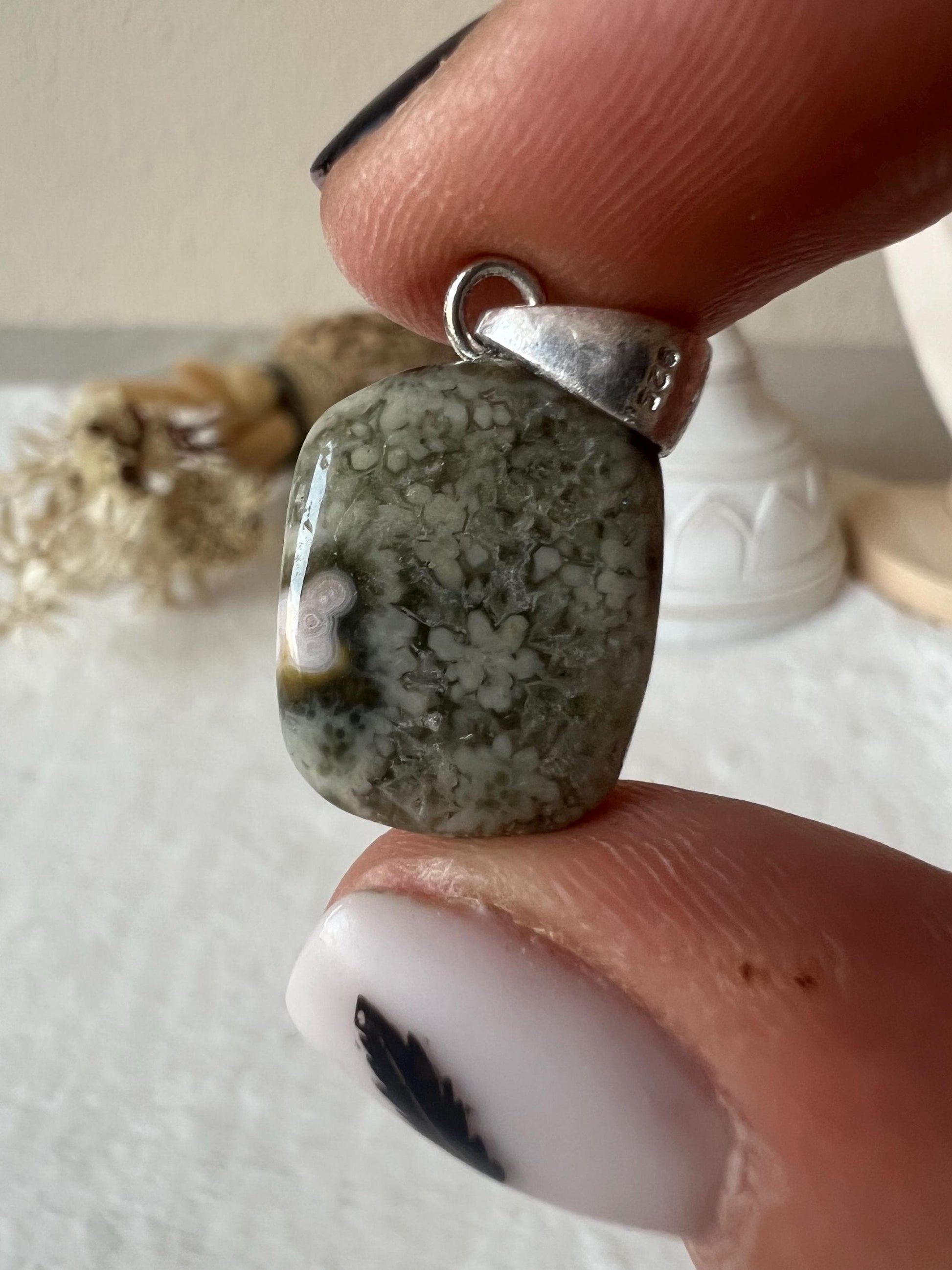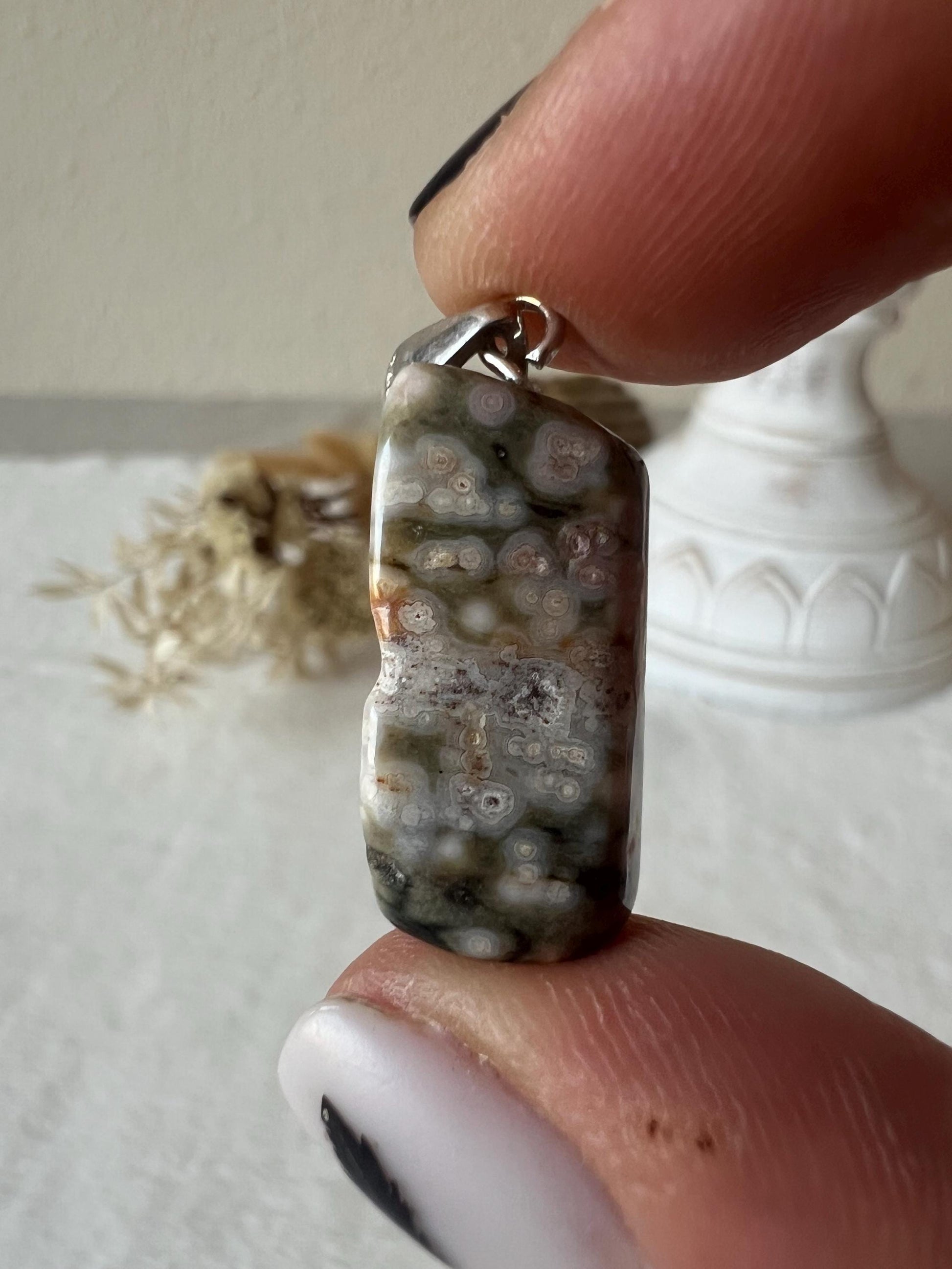 Ob als spiritueller Begleiter oder einfach als wunderschönes Accessoire - ein Old Stock Ozean Jaspis Kettenanhänger mit einer 925er Silber Öse vereint natürliche Schönheit und die Kraft uralter Mineralien.