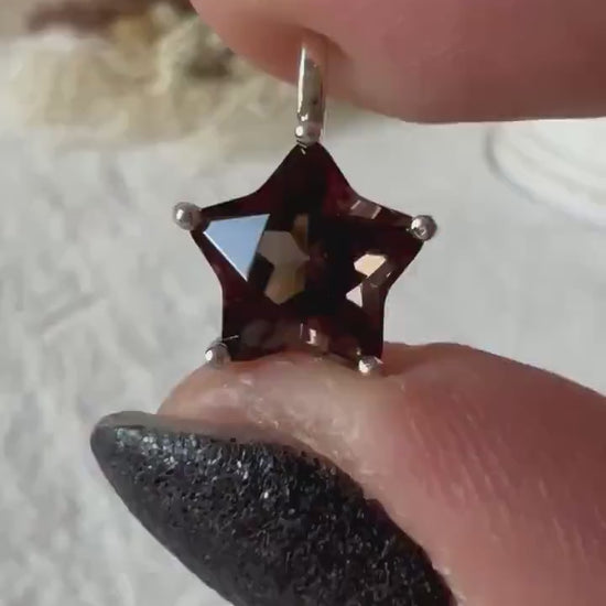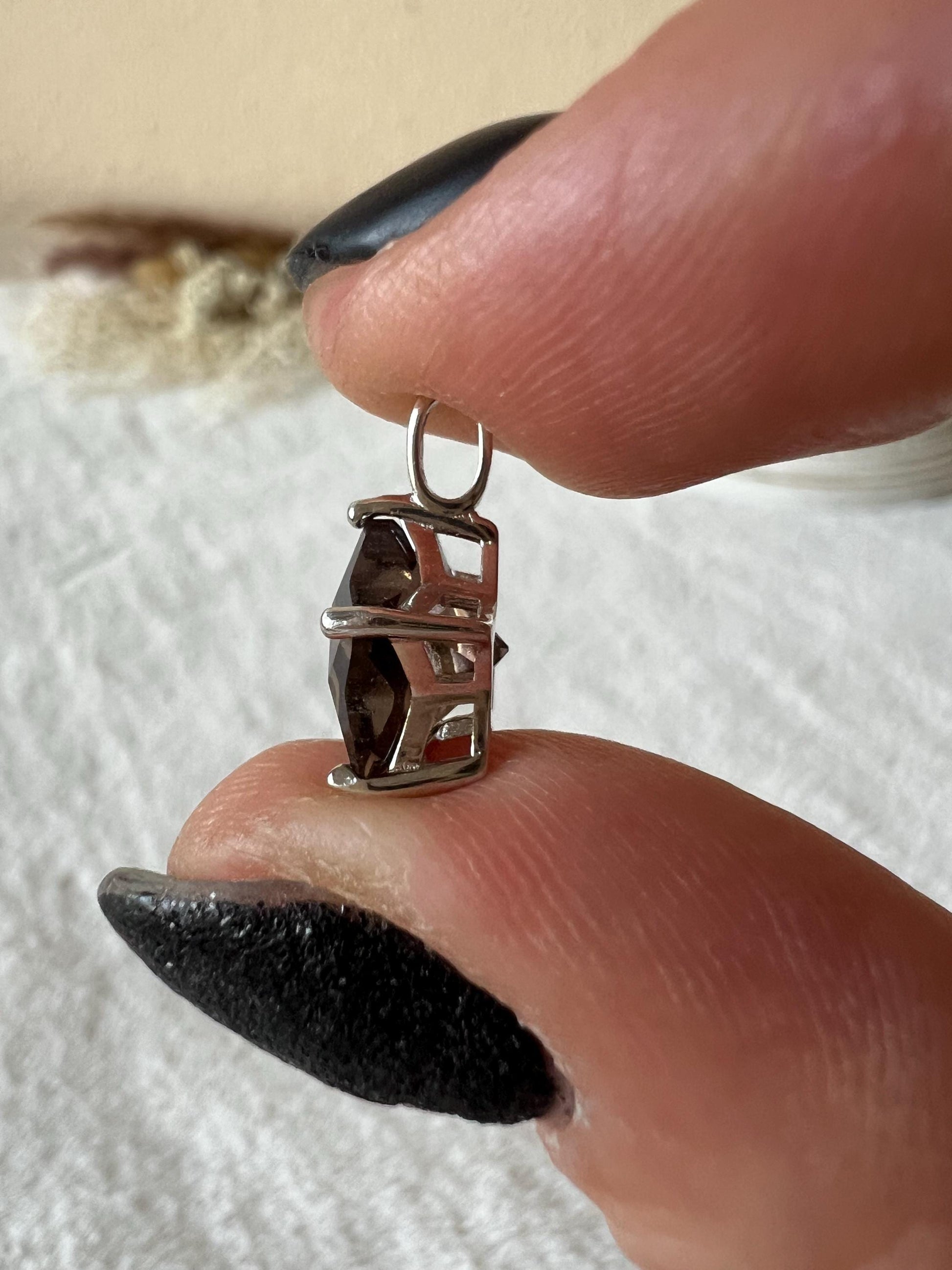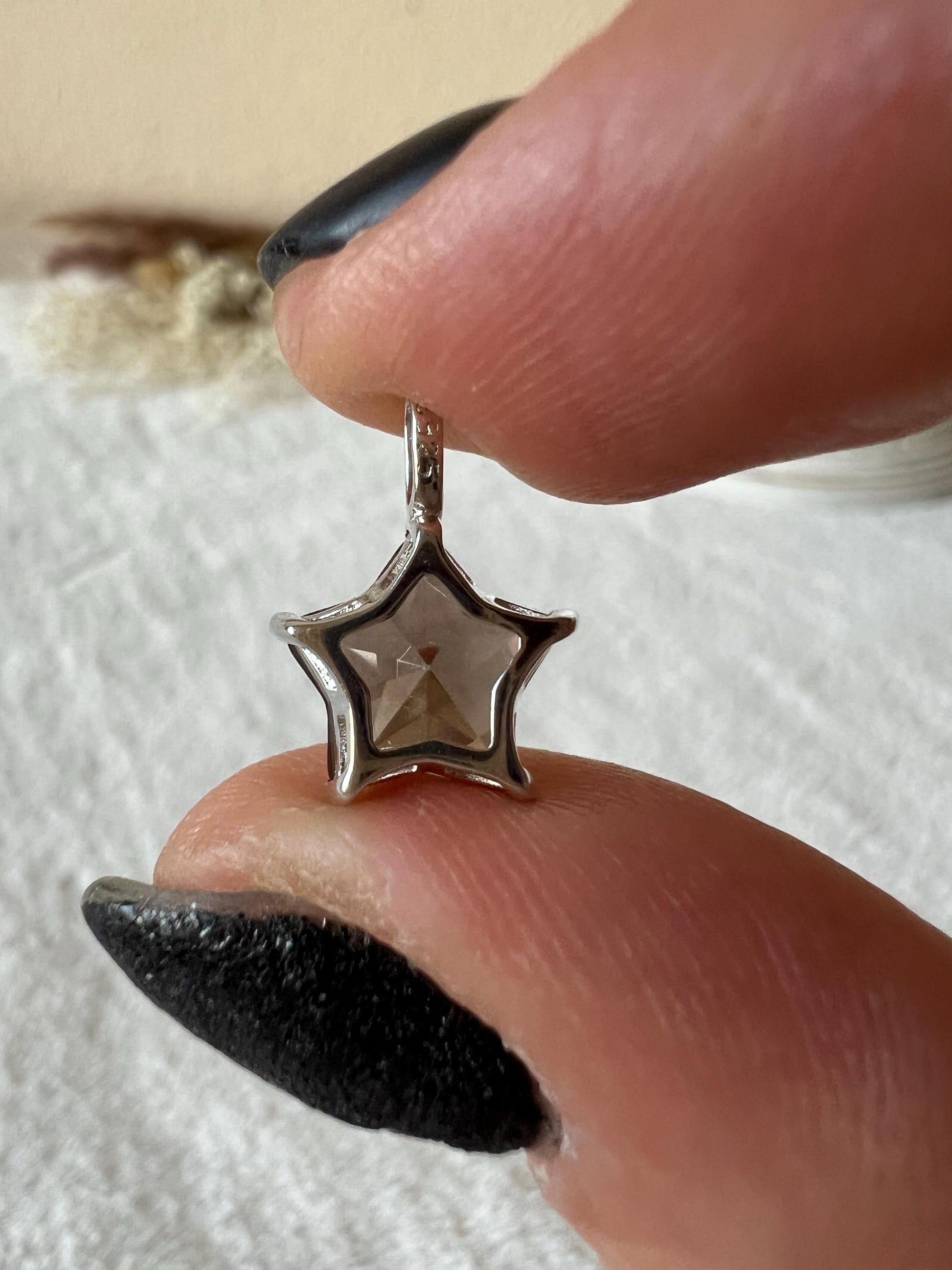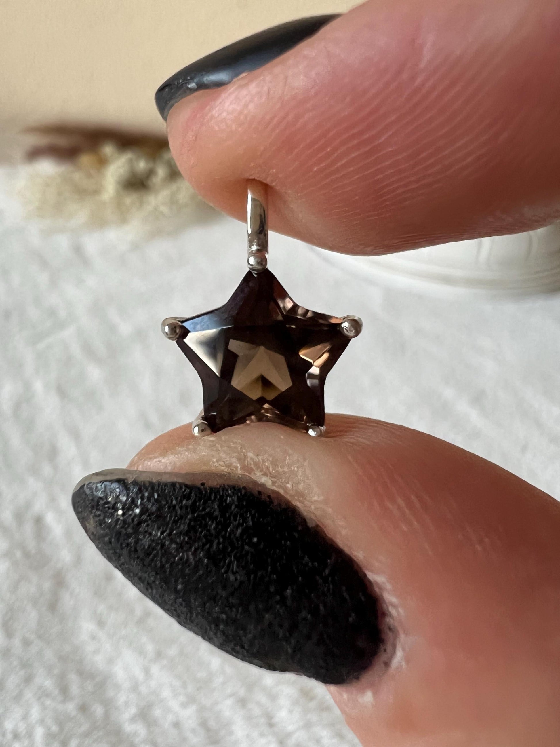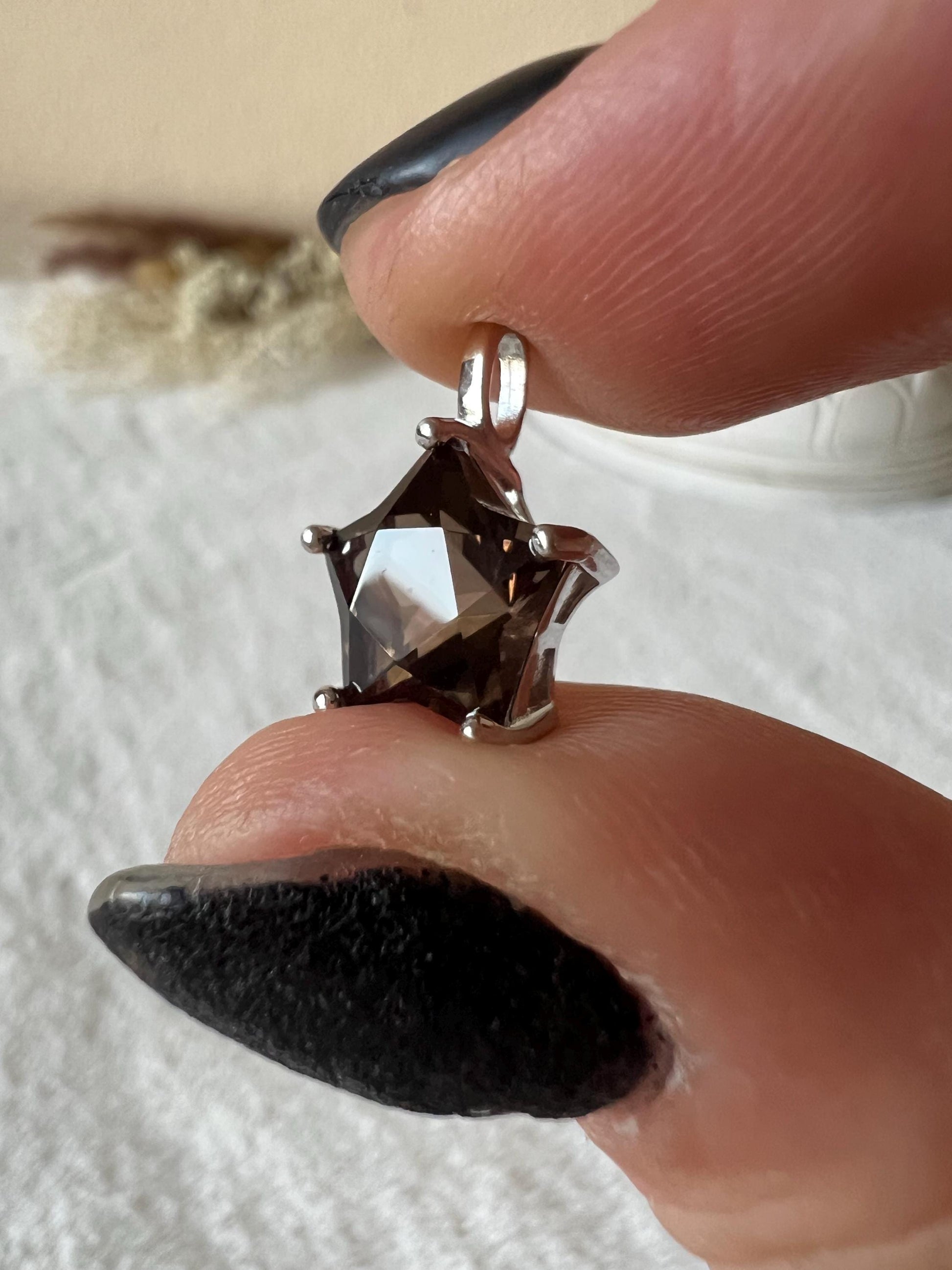 Dieser besondere Anhänger besteht aus echtem 925 Silber und einem klar facettierten Rauchquarz, geschliffen in einer einzigartigen Sternform.