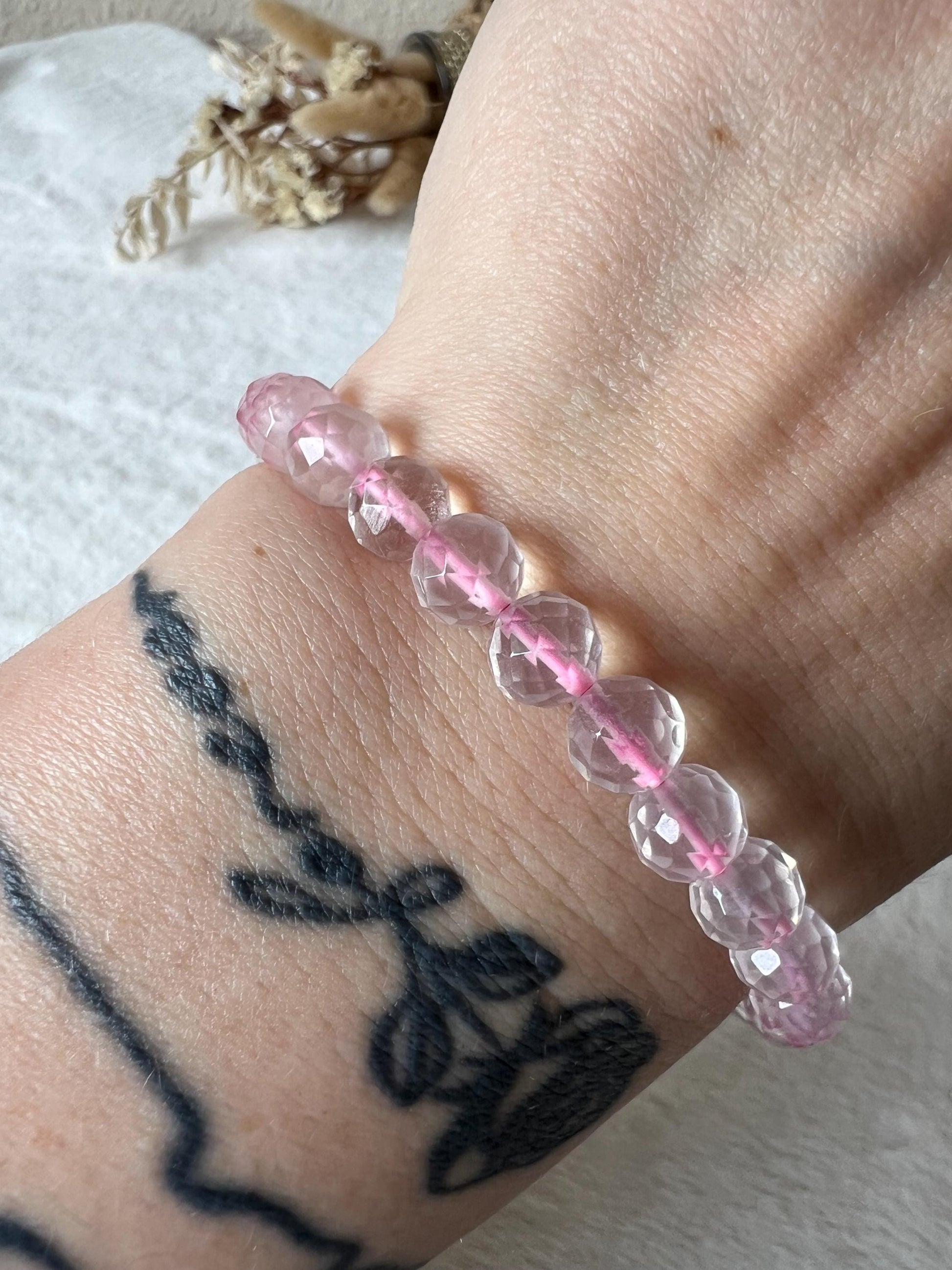Dieses elegante Rosenquarz Armband besteht aus 7,7mm facettierten Perlen und strahlt eine zarte, romantische Energie aus. Der Rosenquarz, als Stein der Liebe, fördert emotionale Heilung, Mitgefühl und das Öffnen des Herzens. Durch die facettierte Form erhält jede Perle einen besonderen Glanz und bringt das weiche Rosa des Rosenquarzes wunderschön zur Geltung.