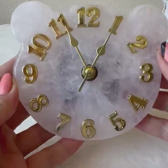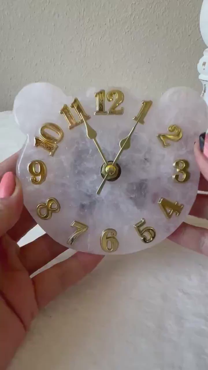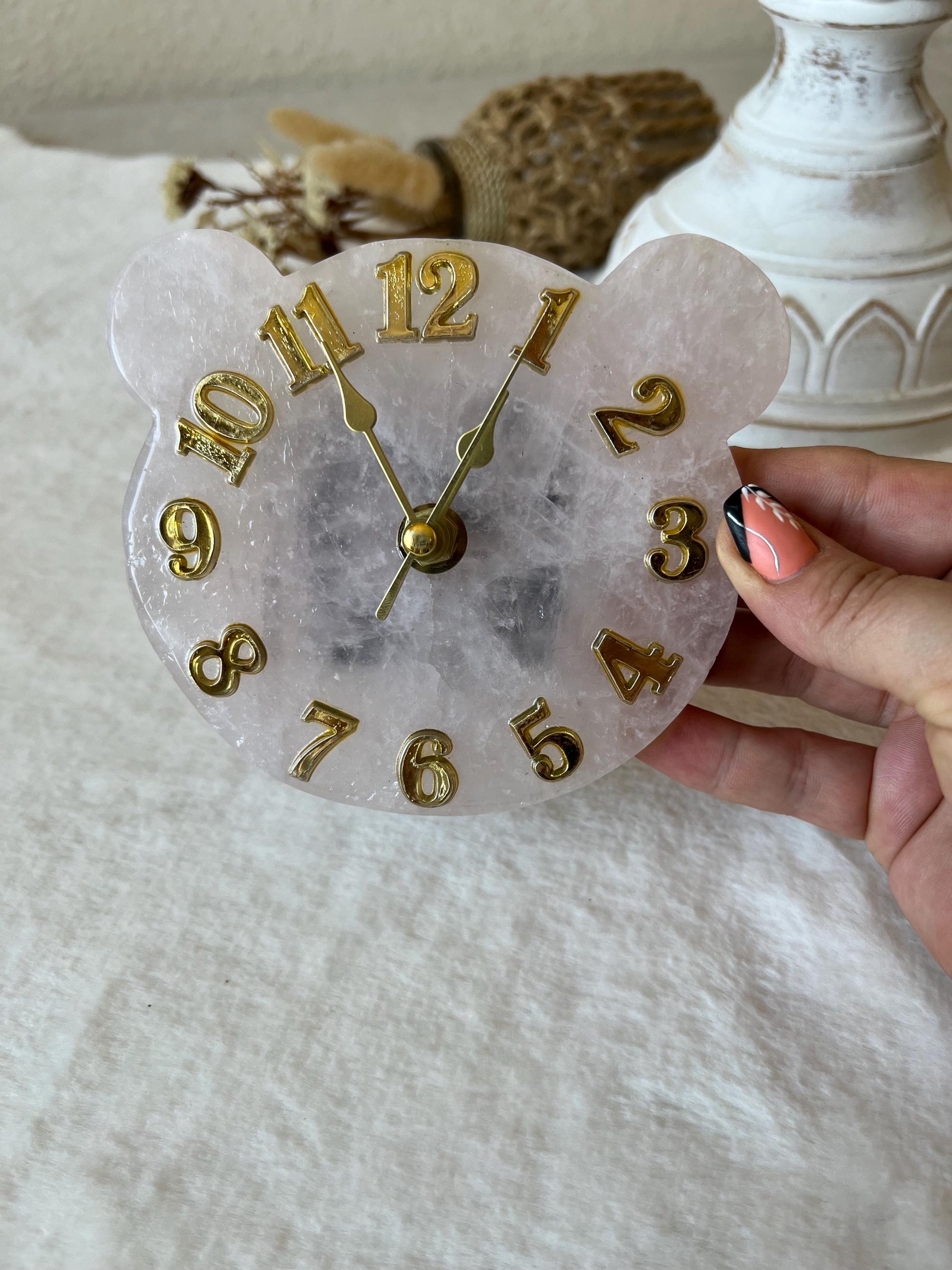 Diese verspielte und zugleich elegante Uhr ist ein echter Hingucker: Gefertigt aus echtem Rosenquarz in der Form eines süßen Teddybärkopfes verbindet sie die sanfte, rosige Energie des Steins mit praktischer Funktionalität.