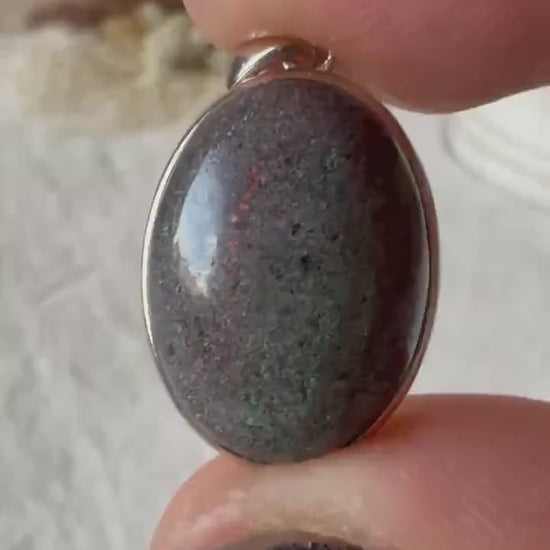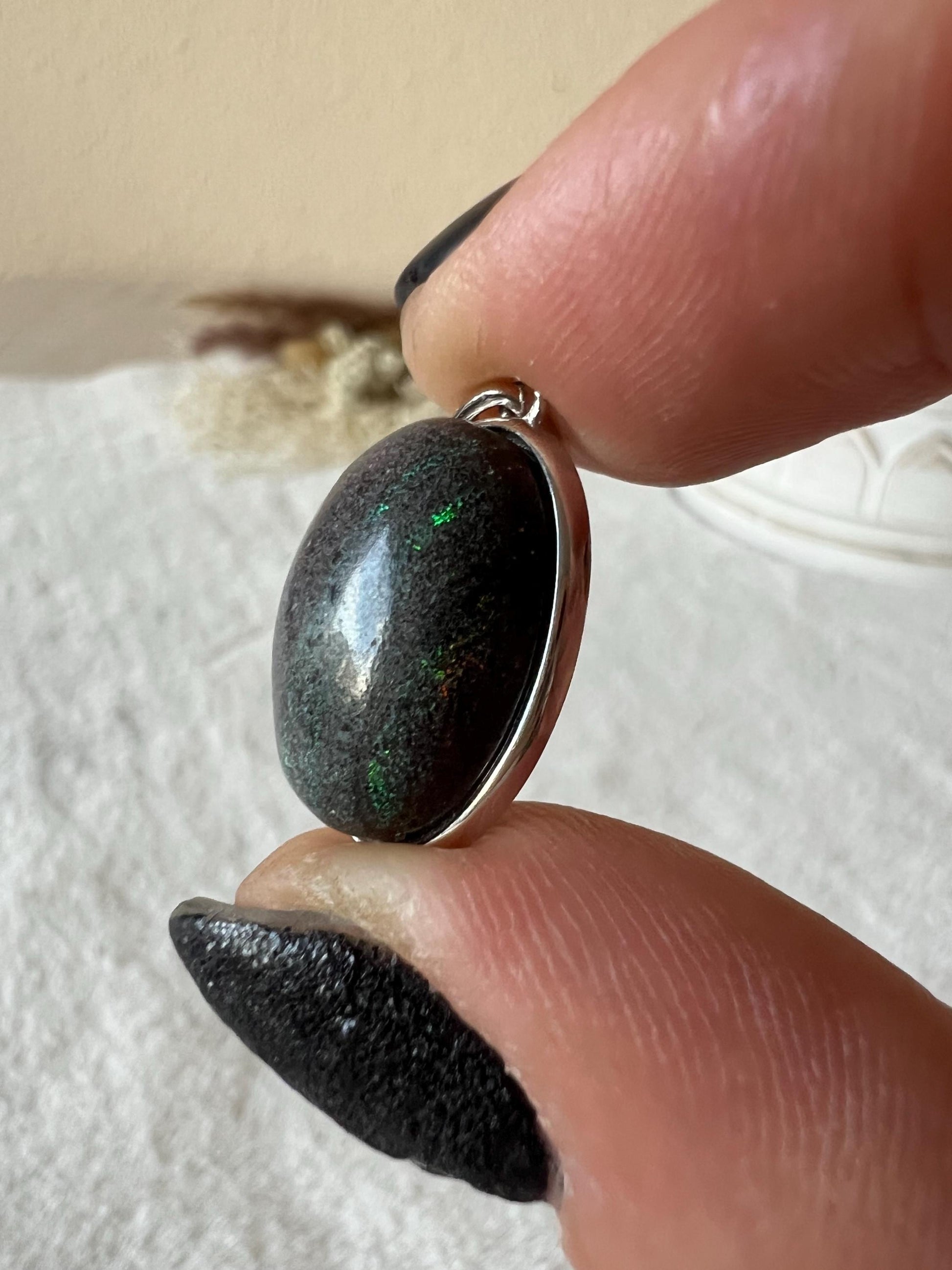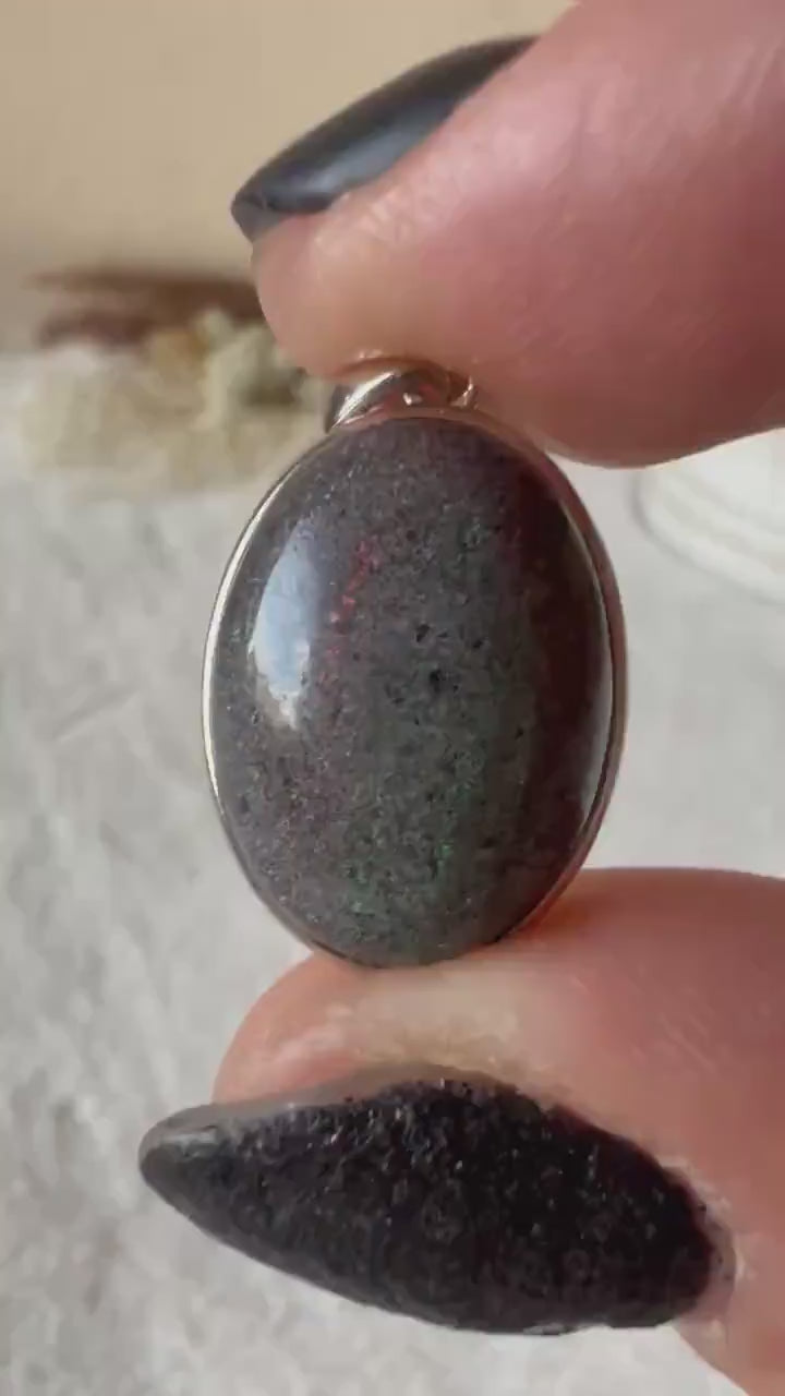 Dieser besondere Anhänger besteht aus echtem 925 Silber und einem tiefdunklen, schimmernden schwarzen Opal in ovaler Form.