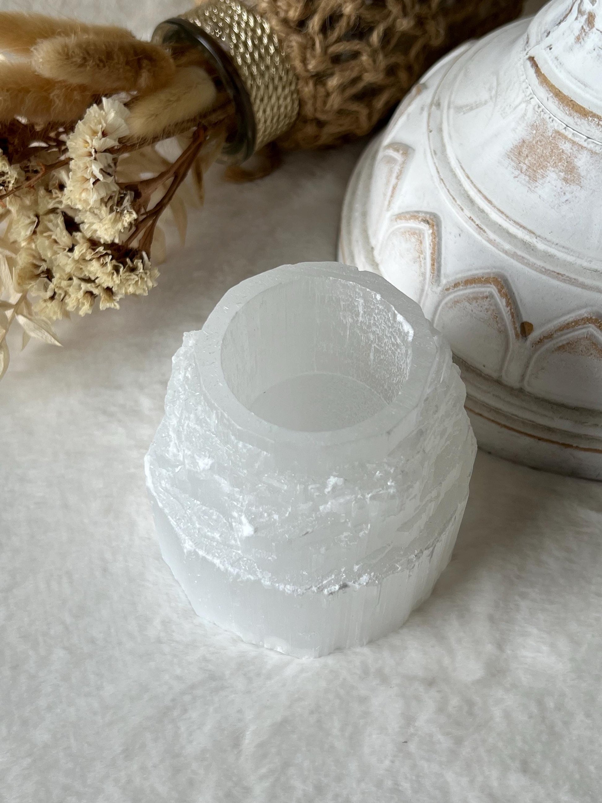 Ein Teelichthalter aus Selenit kombiniert diese energetischen Eigenschaften mit dem beruhigenden Licht einer Kerze und verstärkt so das Gefühl von Geborgenheit und innerer Balance.