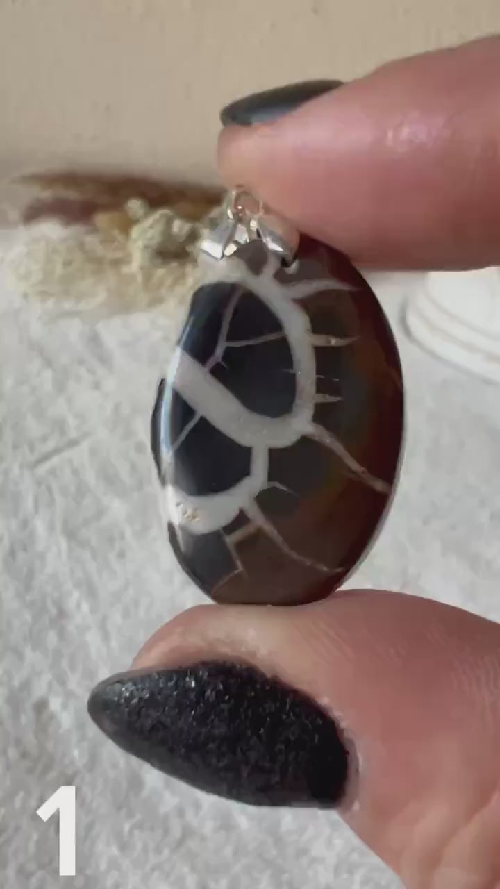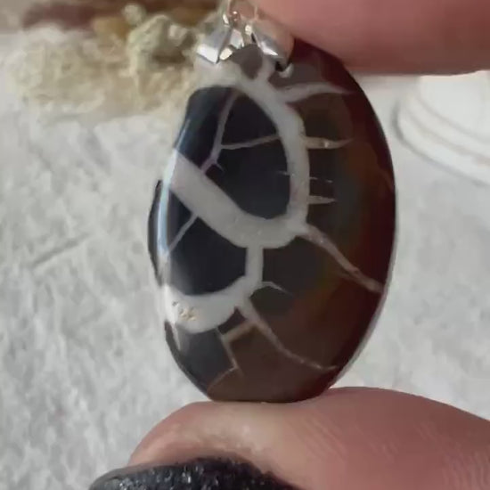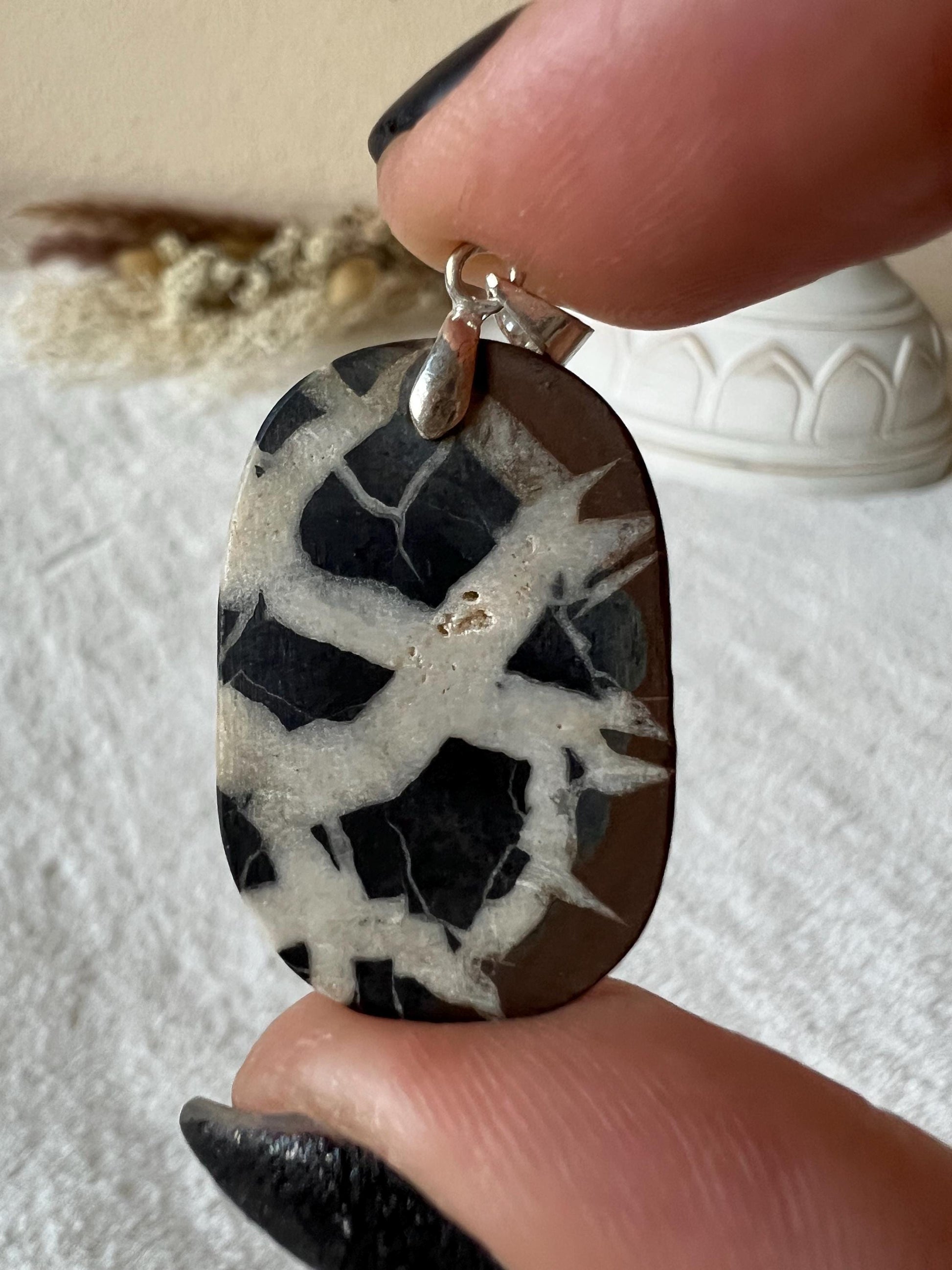 Diese außergewöhnlichen Anhänger bestehen aus echtem 925 Silber und natürlichen Septarie-Steinen, deren einzigartige Muster aus erdigen Brauntönen, Schwarz und hellen Calciteinschlüssen entstehen.