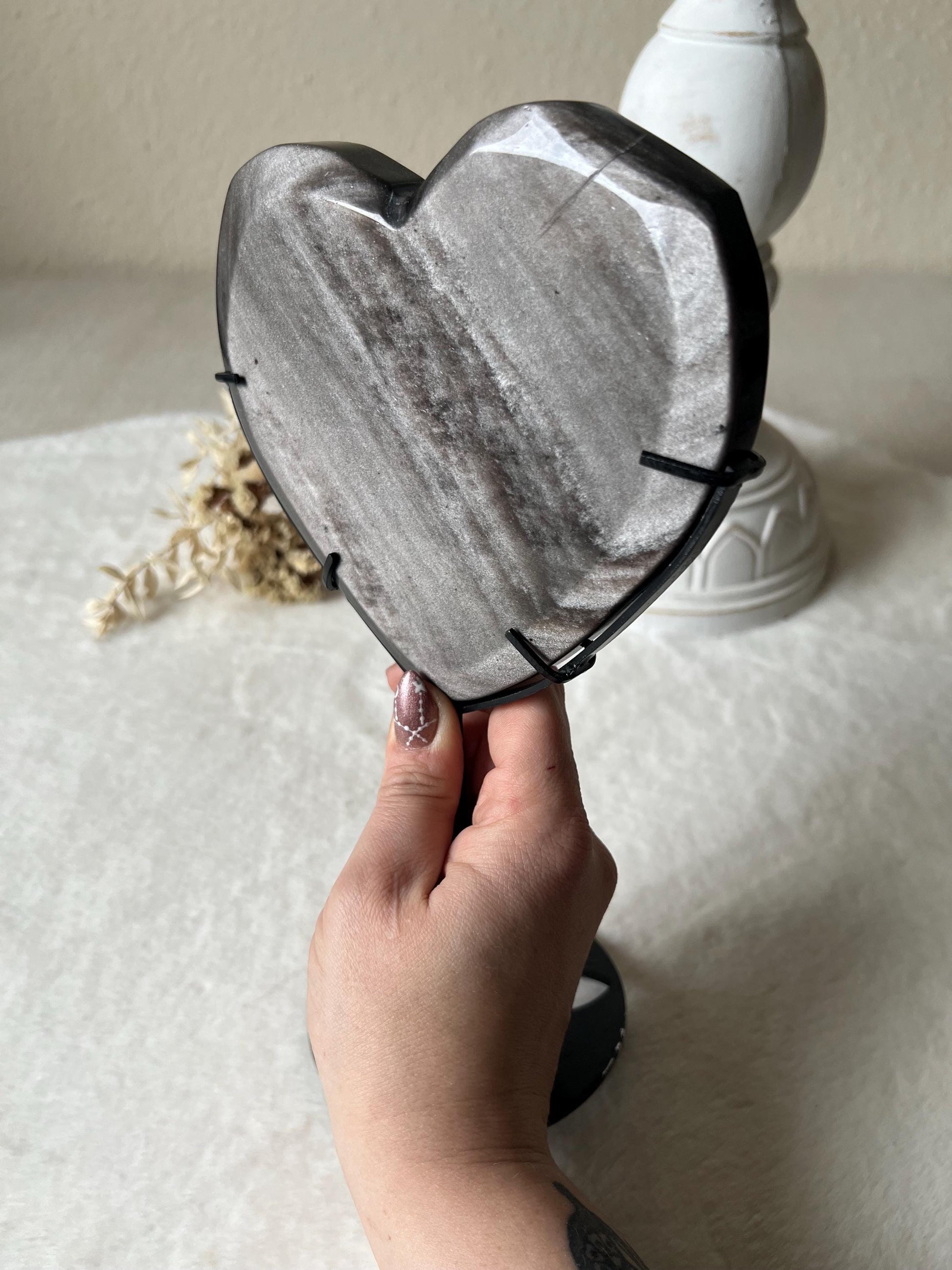 XL Silberschein-Obsidian Herz auf schwarzem Halter - Schutz, Klarheit und Mondlicht-Energie