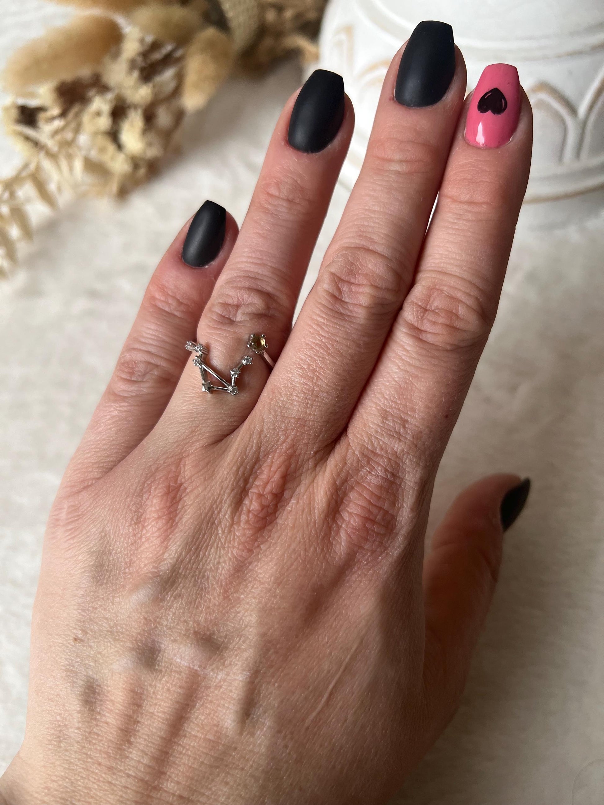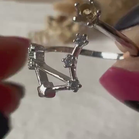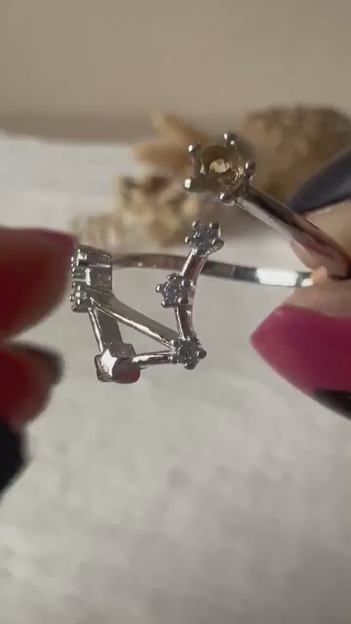 Ein feines Schmuckstück mit Balance und Leuchtkraft: Dieser elegante Ring zeigt das Sternbild der Waage in einer offenen, luftigen Form. Gegenüber dem detailreich gearbeiteten Sternzeichen sitzt ein strahlender, facettierter Citrin - wie ein kleiner Sonnenstrahl auf deiner Hand. Durch das offene Design ist der Ring flexibel größenverstellbar und passt sich deinem Finger bequem an.