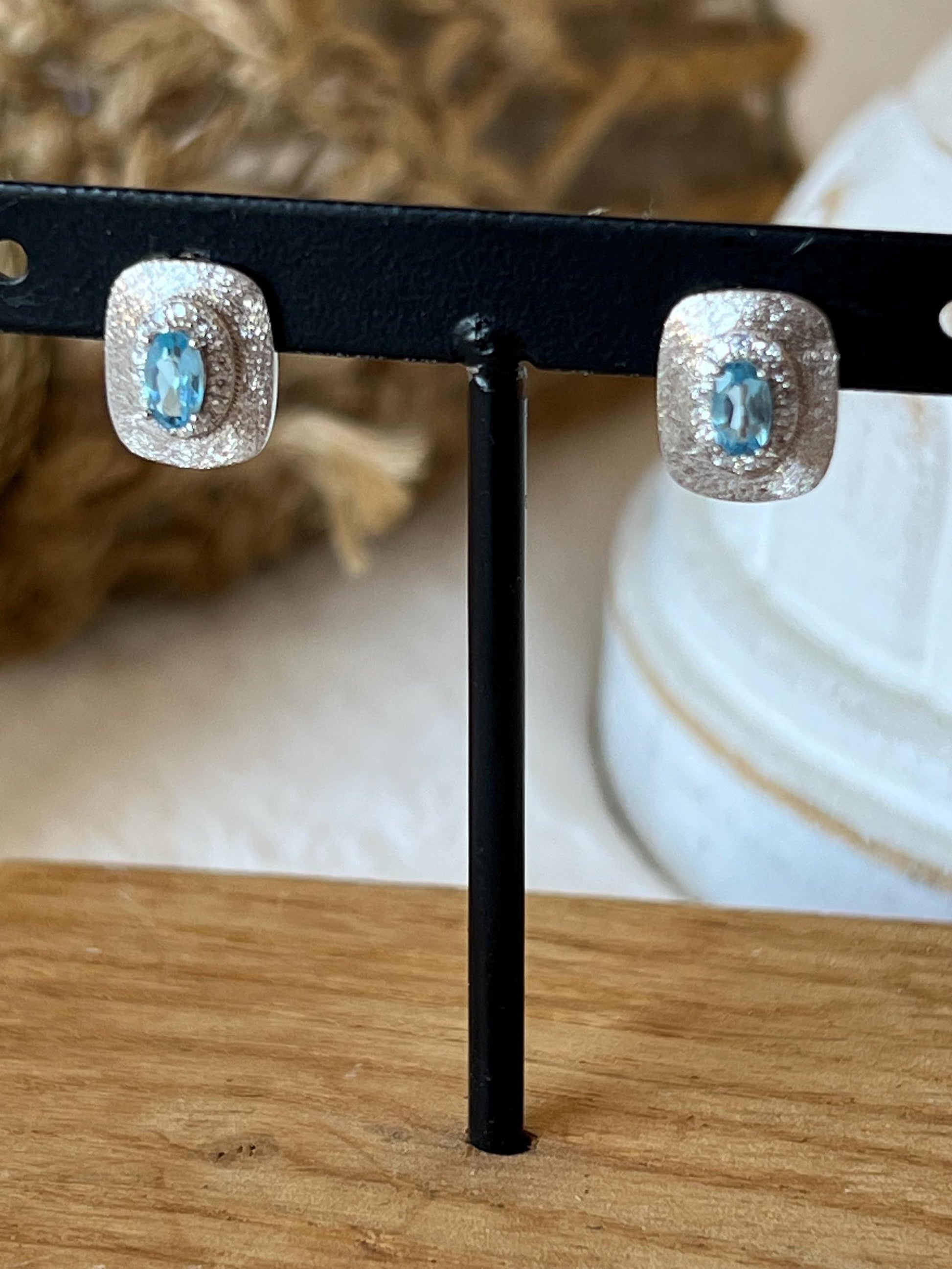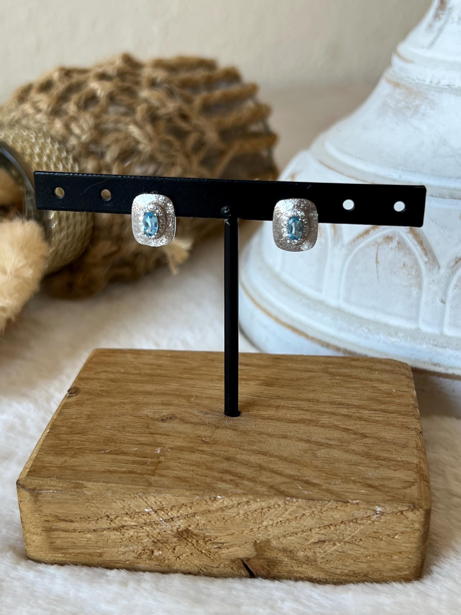Diese einzigartigen Ohrstecker aus 925 Sterling Silber faszinieren mit ihrer strukturierten, mattierten Oberfläche und dem intensiv leuchtenden blauen Topas, der von zarten Akzenten umrahmt wird. Der natürliche Glanz des Topas verleiht den Ohrringen eine edle Ausstrahlung, während die kunstvolle Silberverarbeitung ihnen einen modernen und zugleich zeitlosen Look verleiht.