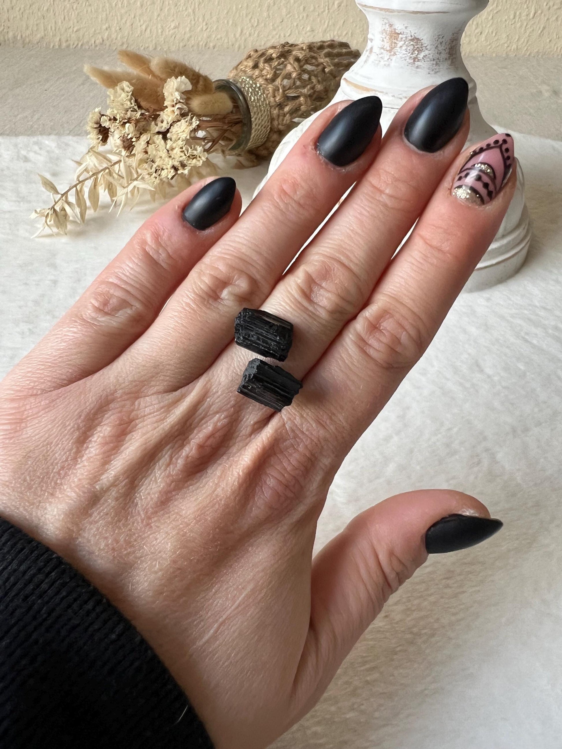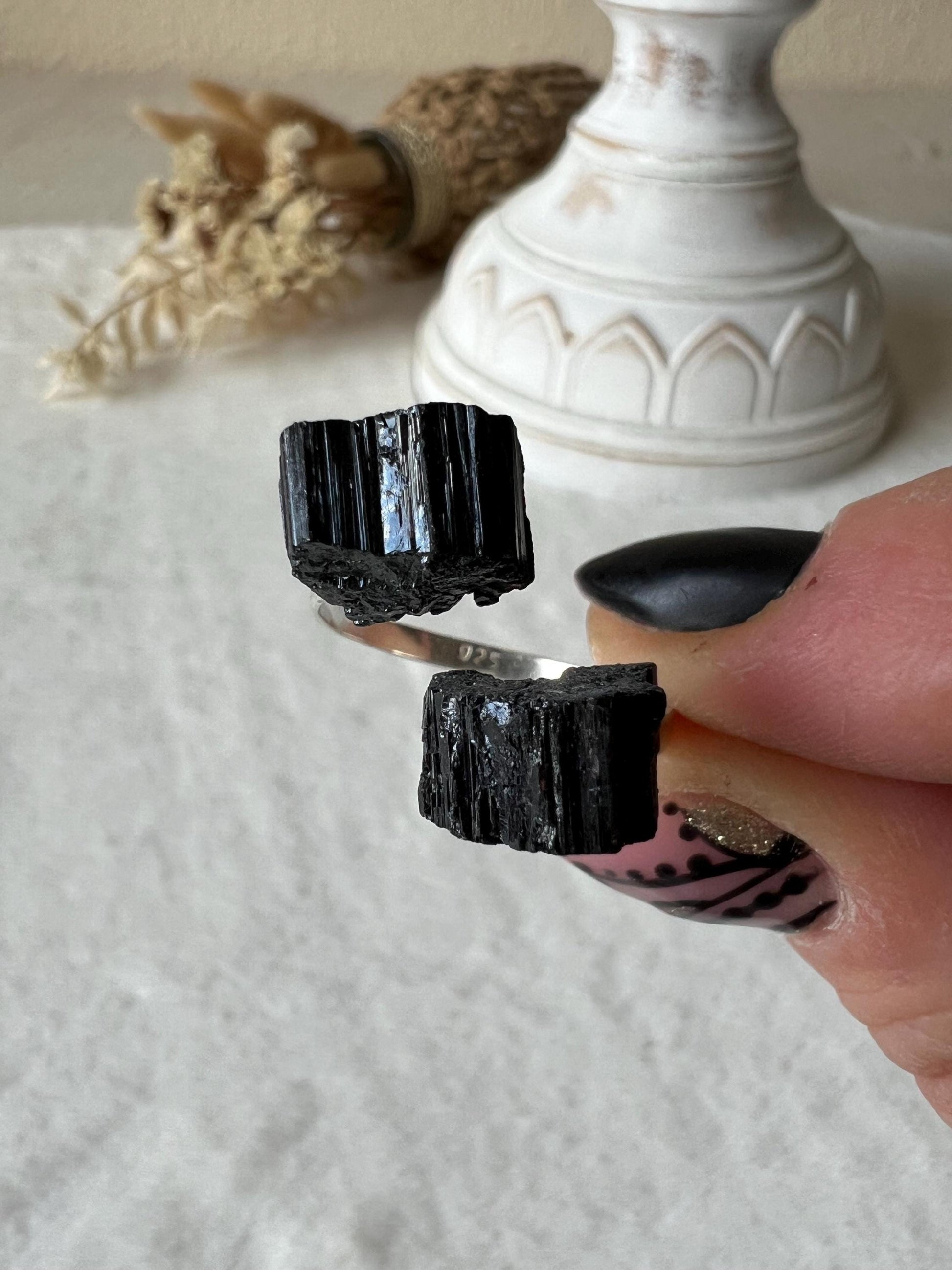 Dieser stilvolle, größenverstellbare 925er Silberring vereint die kraftvolle Energie des schwarzen Turmalins mit zeitloser Eleganz. Der Ring ist mit zwei naturbelassenen Rohsteinen aus schwarzem Turmalin besetzt, deren tiefdunkle, fast geheimnisvolle Farbgebung und ungeschliffene Struktur einen faszinierenden Kontrast zum schlichten Silber bilden. Durch das offene Design lässt sich der Ring an verschiedene Größen anpassen und ist so vielseitig tragbar.